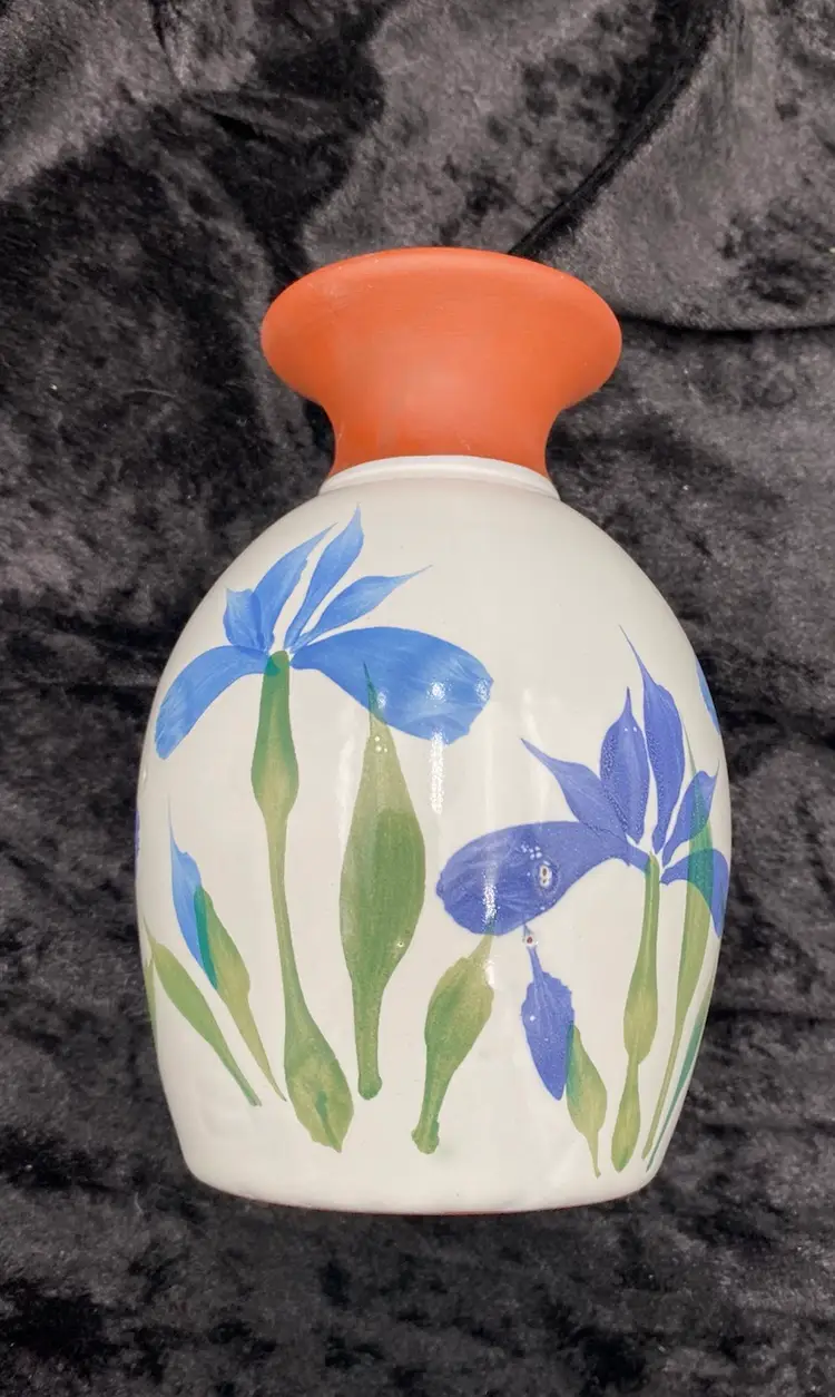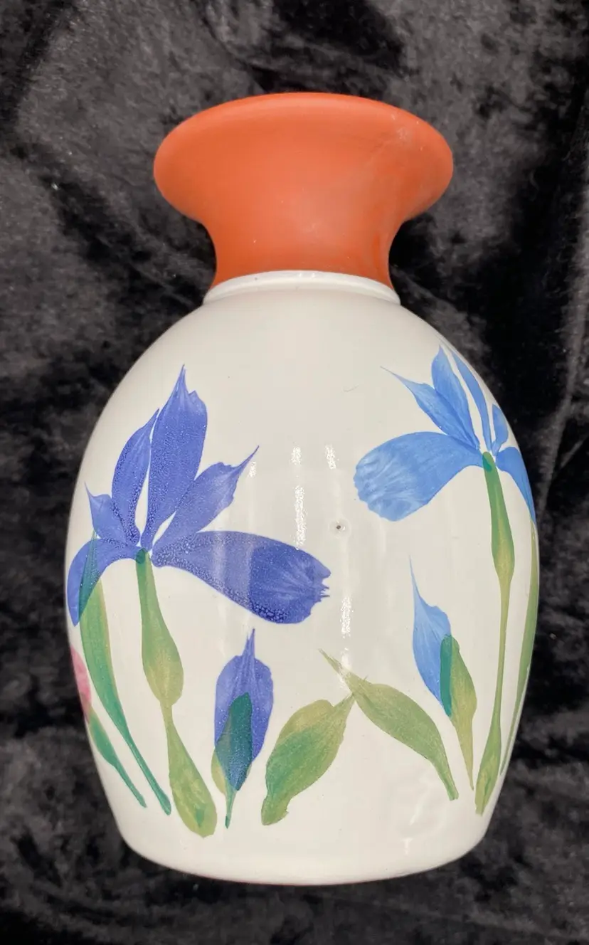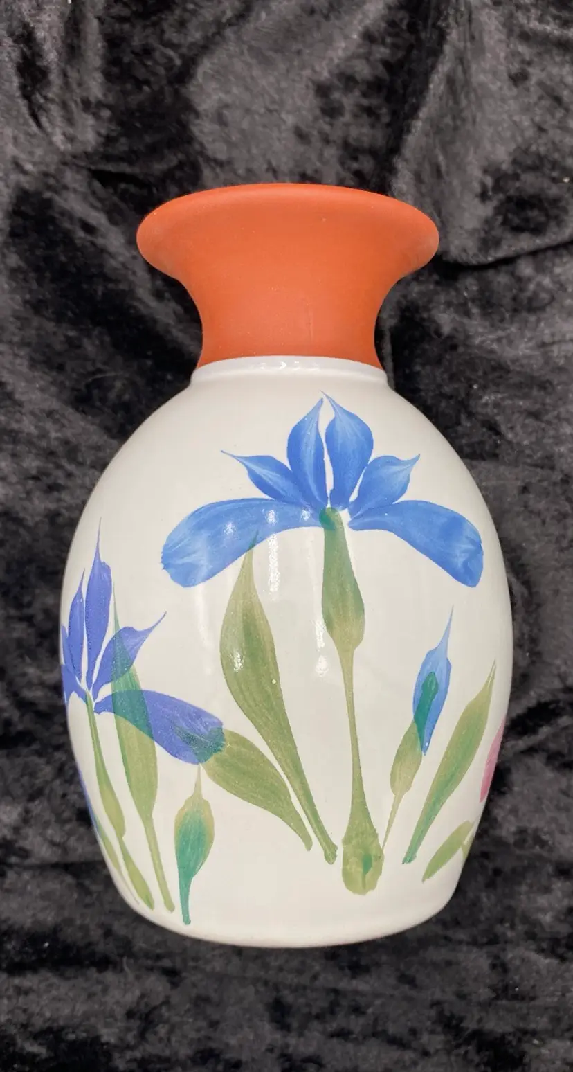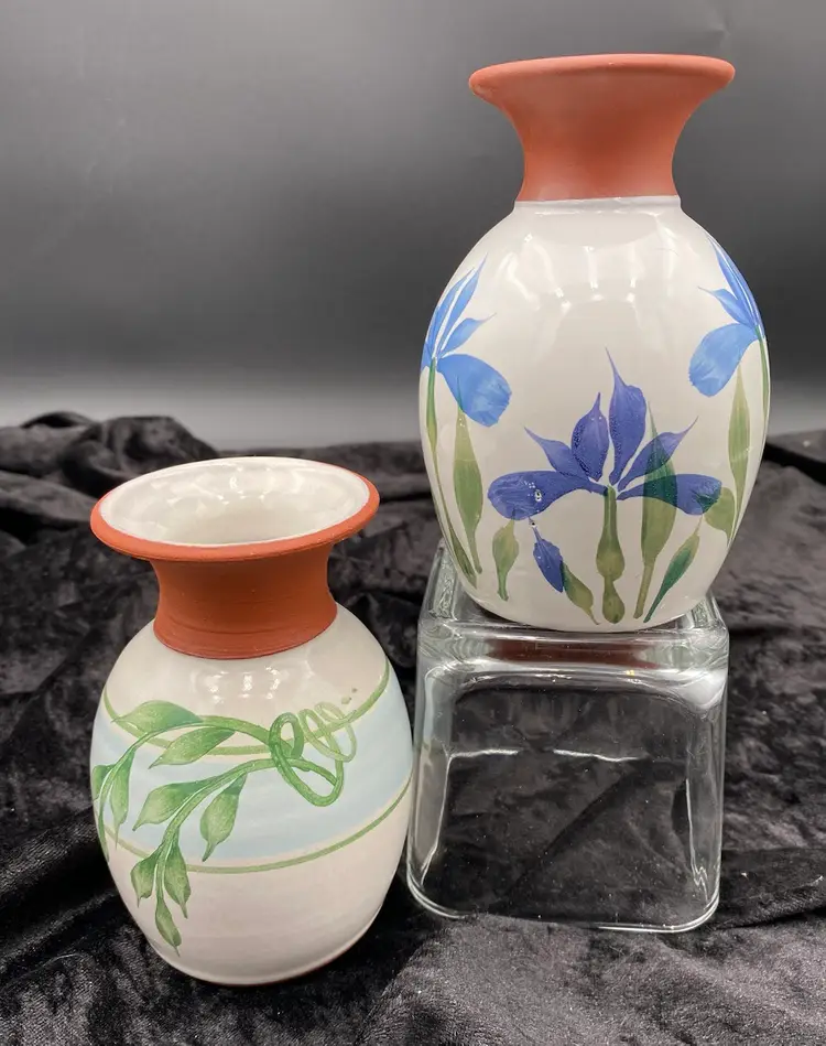 This pair of vintage Emerson Creek Pottery vases are a lovely red clay art pottery that features hand-painted designs over a white majolica base. The glossy finish and style make these decorative pieces that are perfect for any home. The taller vase shows purple, blue and pink irises with green stalks circling the vase. It measures 5.25 inches tall, 3.2 inches wide, and weighs 10.5 ounces. The other vase has a lovely blue band with a green vine and leaves. It measures 4.8 inches tall, 3.1 inches and weighs 10.2 ounces. The vases were made in Bedford, Virginia, in 1988 and 1993. This set of vases are a great addition to any collection of decorative pottery. Their printed backstamp adds to their authenticity.