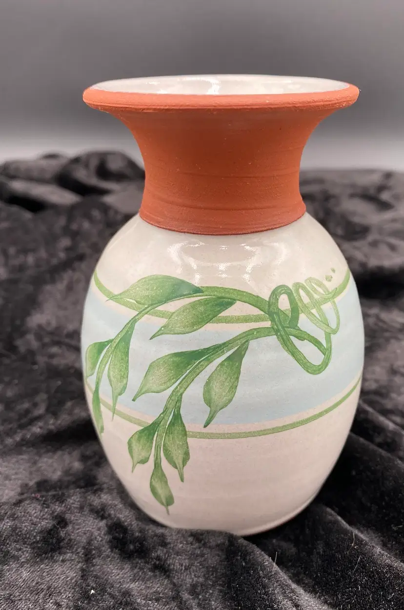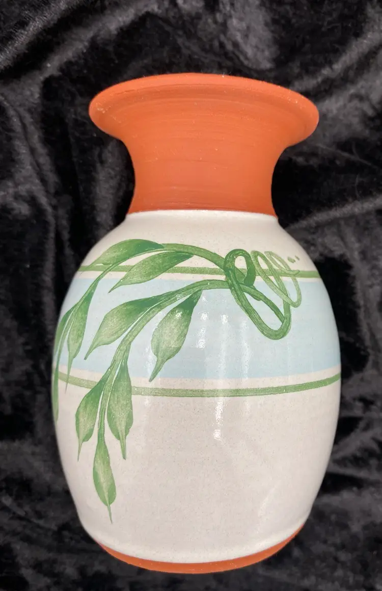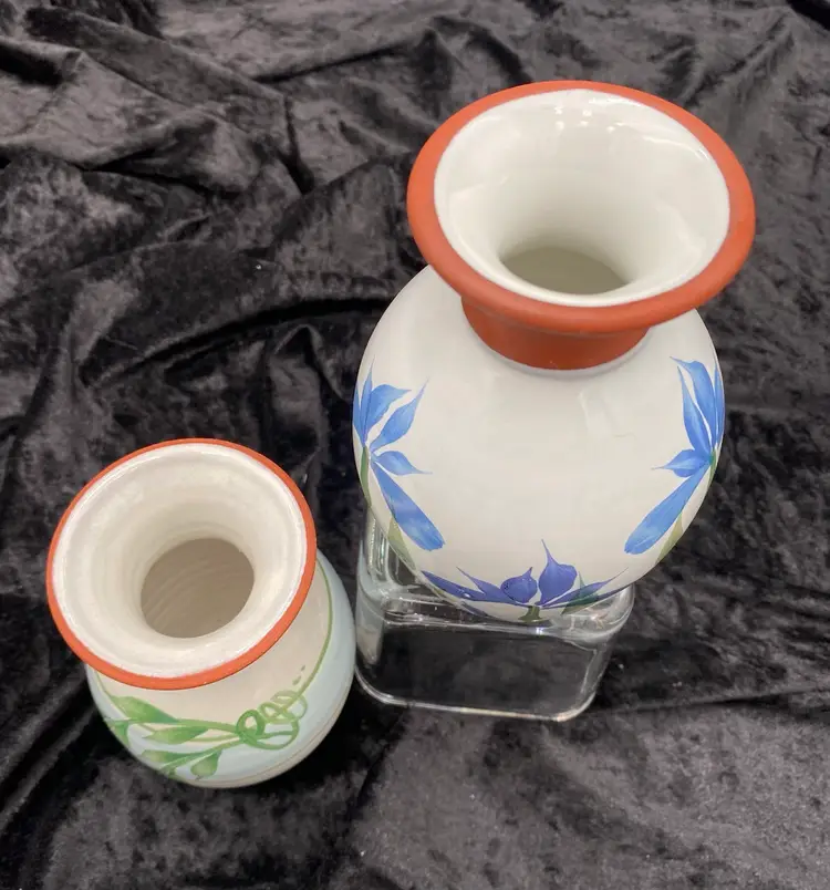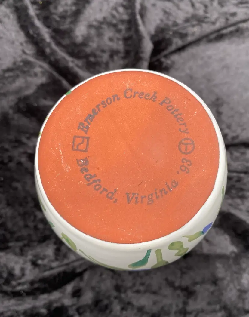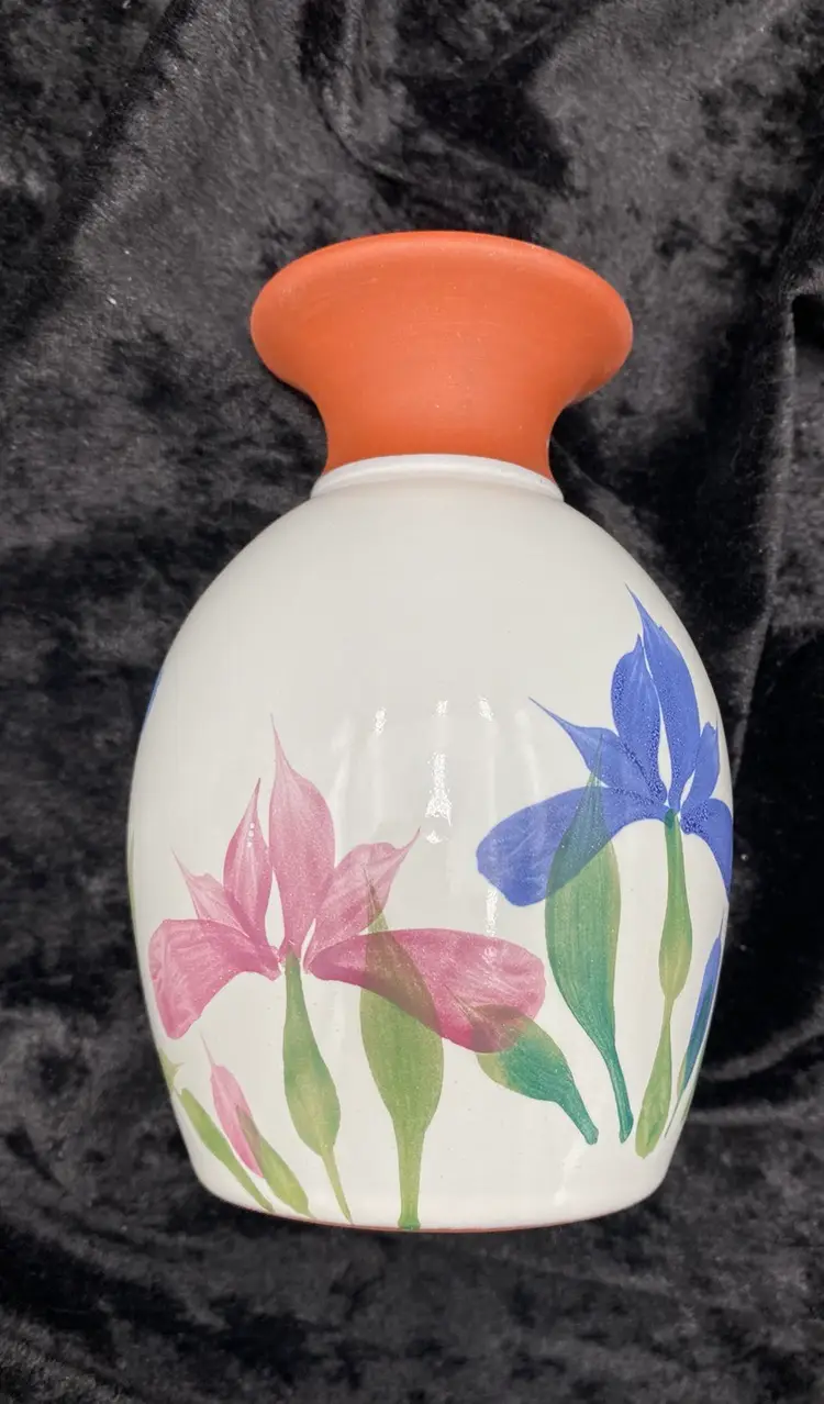 This pair of vintage Emerson Creek Pottery vases are a lovely red clay art pottery that features hand-painted designs over a white majolica base. The glossy finish and style make these decorative pieces that are perfect for any home. The taller vase shows purple, blue and pink irises with green stalks circling the vase. It measures 5.25 inches tall, 3.2 inches wide, and weighs 10.5 ounces. The other vase has a lovely blue band with a green vine and leaves. It measures 4.8 inches tall, 3.1 inches and weighs 10.2 ounces. The vases were made in Bedford, Virginia, in 1988 and 1993. This set of vases are a great addition to any collection of decorative pottery. Their printed backstamp adds to their authenticity.
