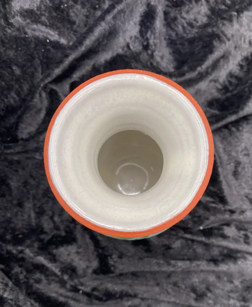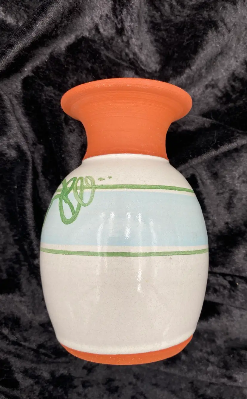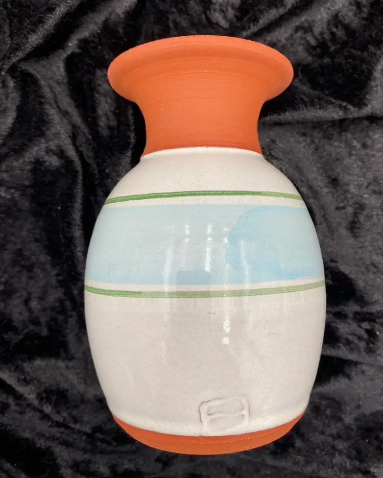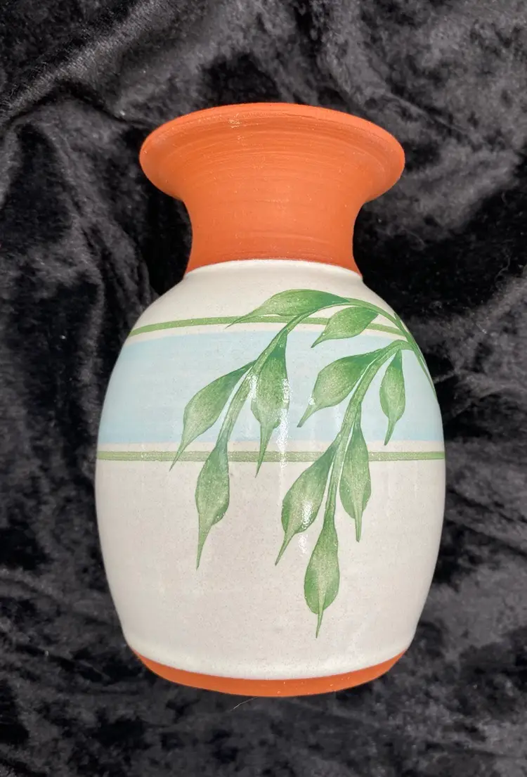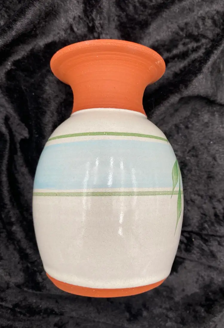This pair of vintage Emerson Creek Pottery vases are a lovely red clay art pottery that features hand-painted designs over a white majolica base. The glossy finish and style make these decorative pieces that are perfect for any home. The taller vase shows purple, blue and pink irises with green stalks circling the vase. It measures 5.25 inches tall, 3.2 inches wide, and weighs 10.5 ounces. The other vase has a lovely blue band with a green vine and leaves. It measures 4.8 inches tall, 3.1 inches and weighs 10.2 ounces. The vases were made in Bedford, Virginia, in 1988 and 1993. This set of vases are a great addition to any collection of decorative pottery. Their printed backstamp adds to their authenticity.