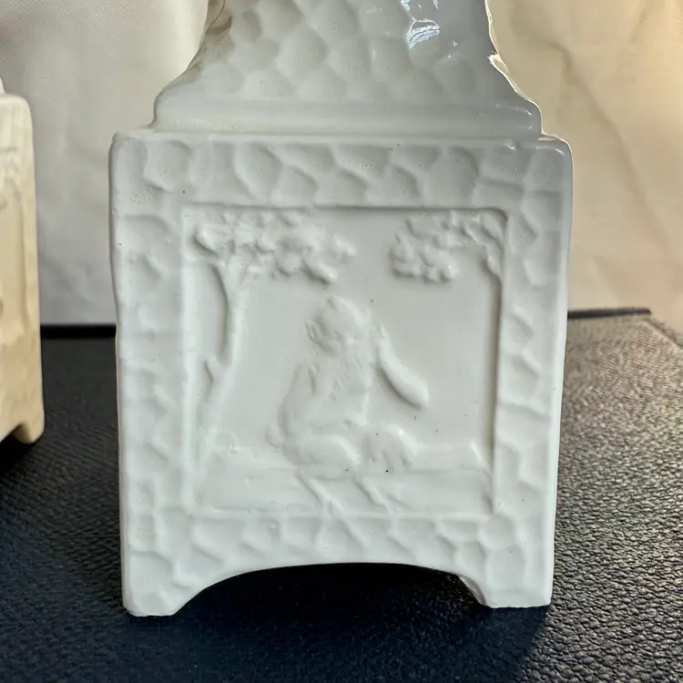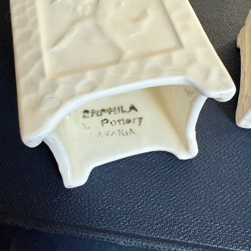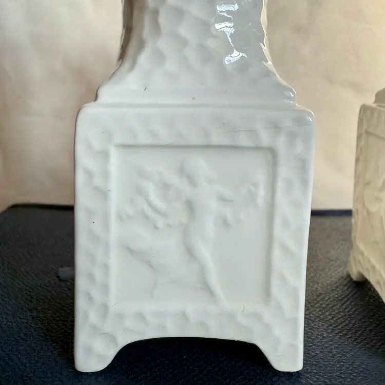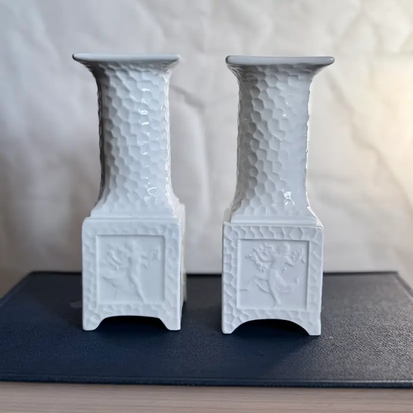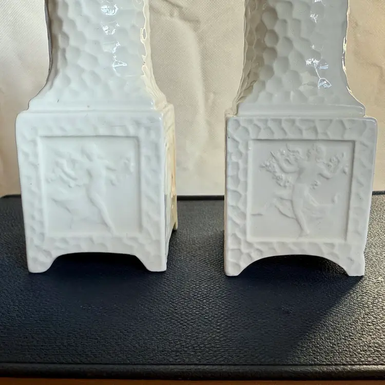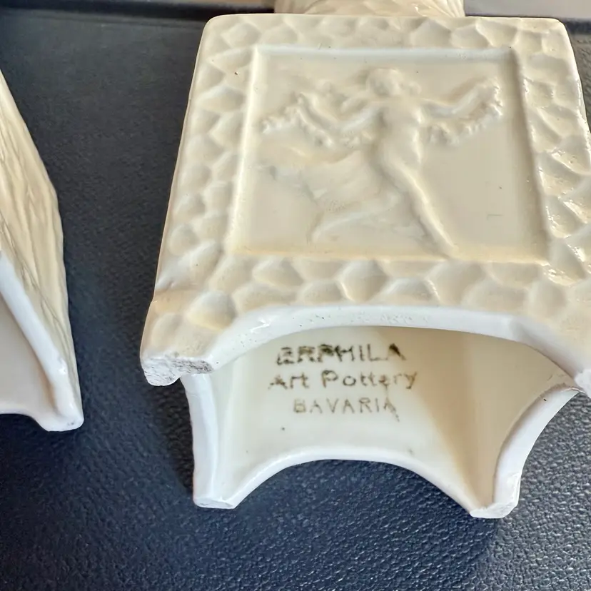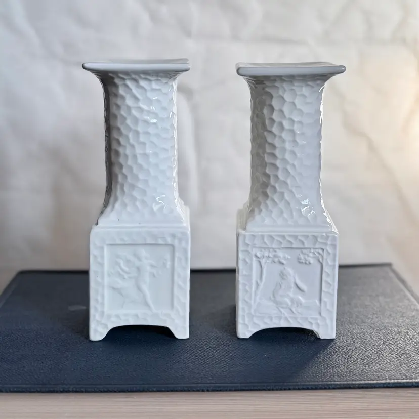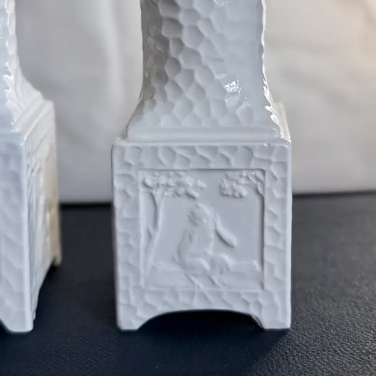Pair of vintage Erphila Art Pottery Bavaria pedestal candlesticks, each measuring 5" tall × 1.75" square. Crafted in Bavaria, these white ceramic candlesticks feature a beautifully textured surface and raised relief panels on each side depicting classical, mythological scenes.