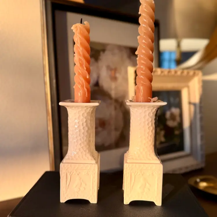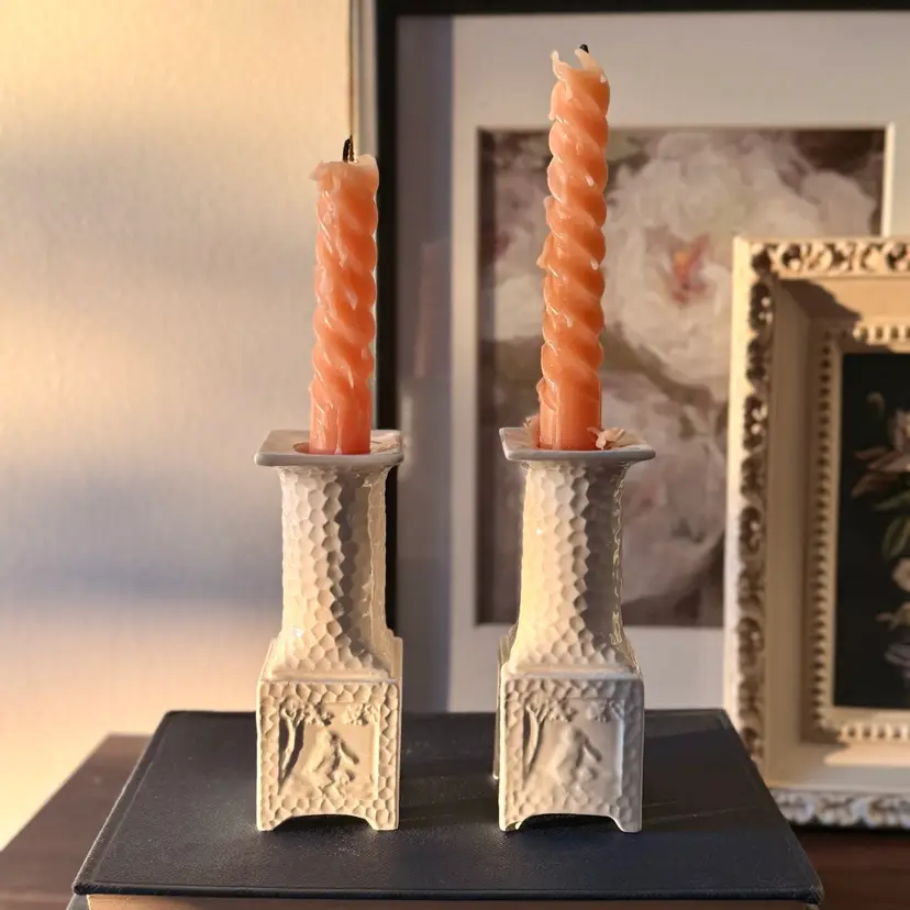 The pair is in excellent vintage condition with no chips, cracks, or repairs. One candlestick retains slightly crisper detail in the relief panels, while the other shows a bit more softness, likely from original production or gentle wear over time.