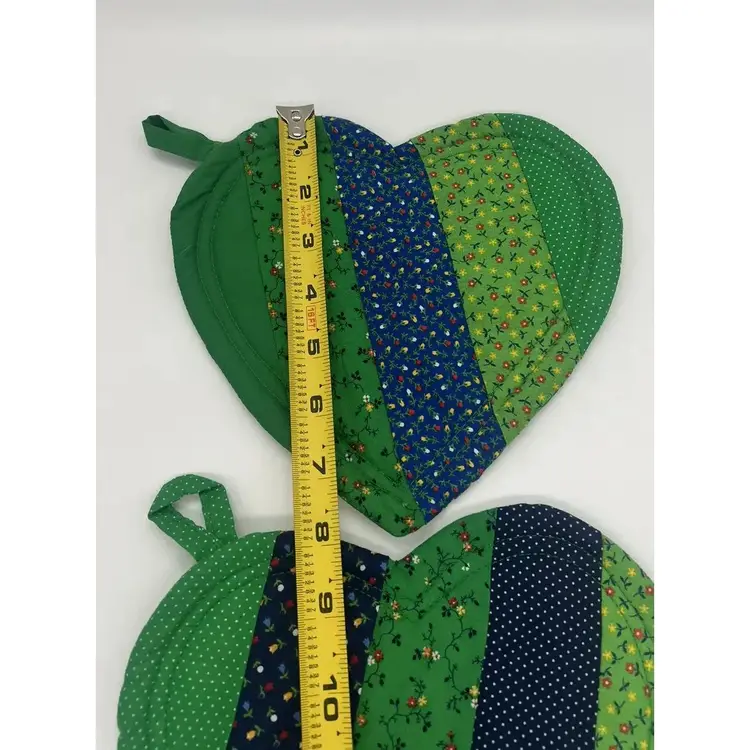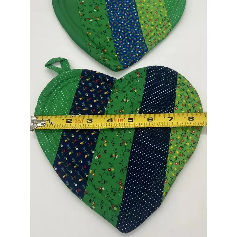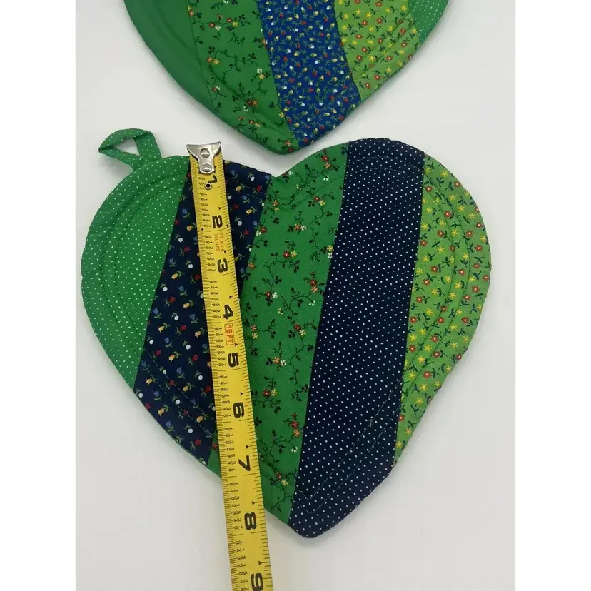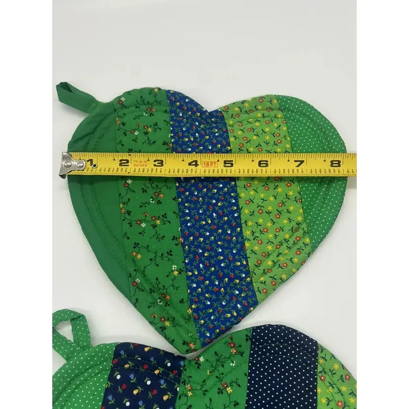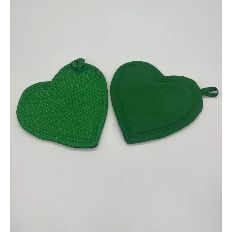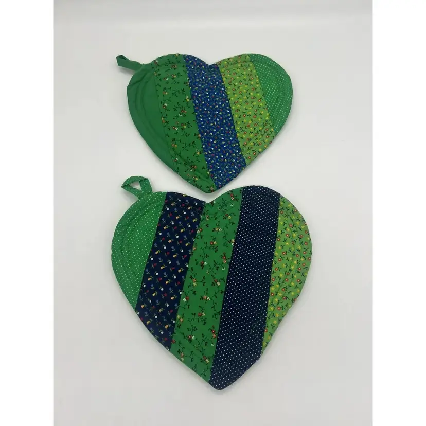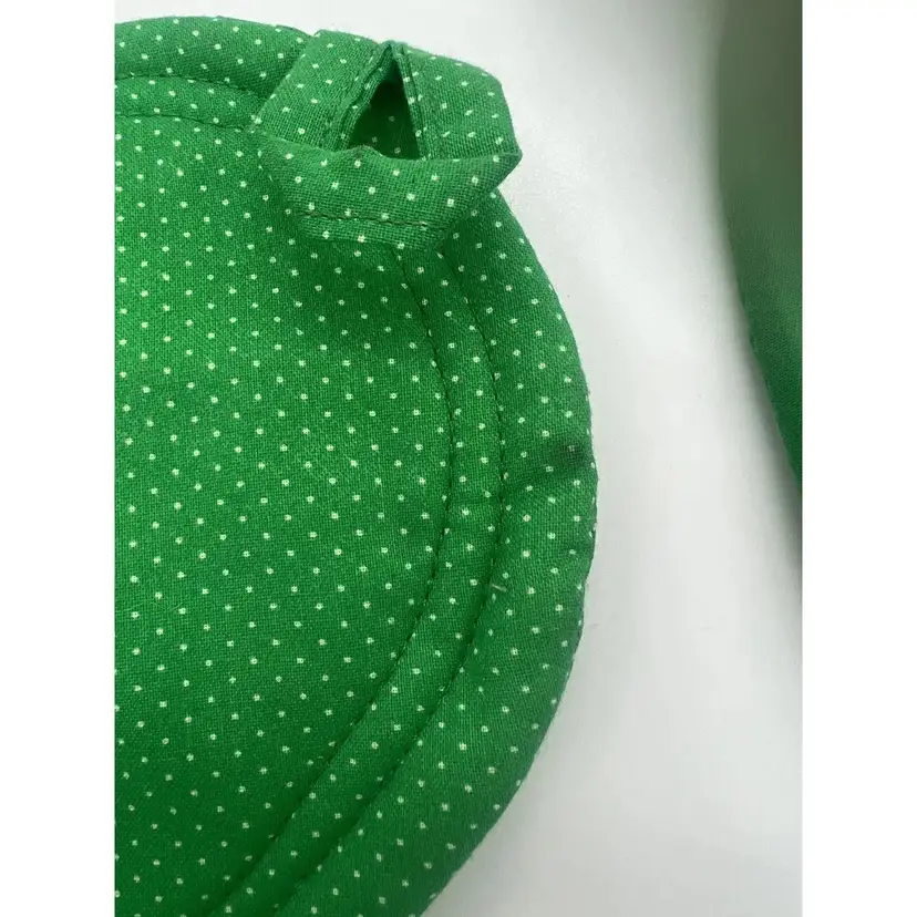 This pair of pot holders is perfect for Valentine's Day, St. Patrick's Day, or a pop of color any day. They are in great condition. There is one tiny stain on one as pictured. No other damage noted.