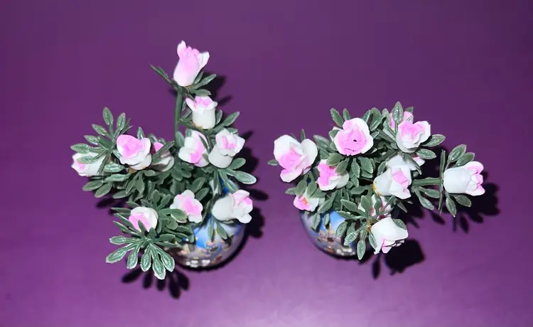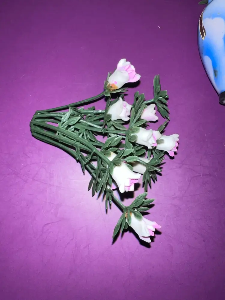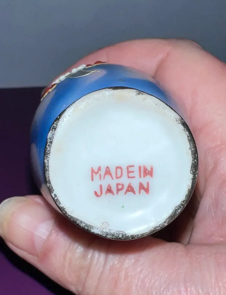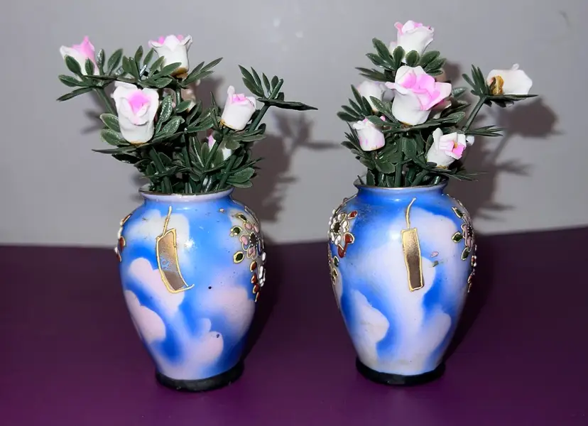 Pair of miniature hand painted blue vases with moriage. Plastic flowers glow under UV light. 2 1/2”. 4 1/2” with flowers. No chips or cracks