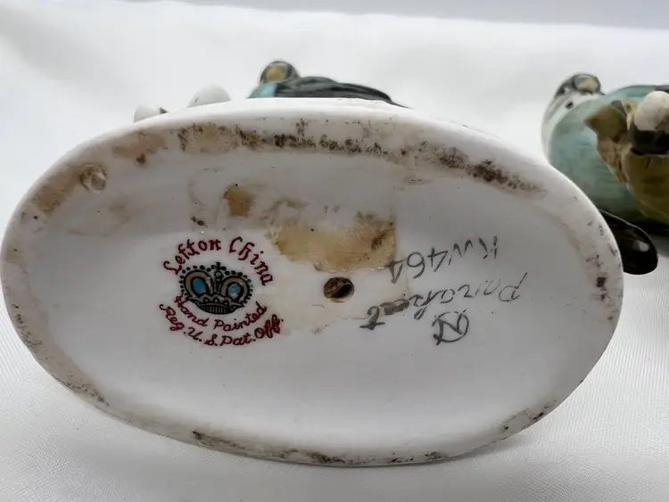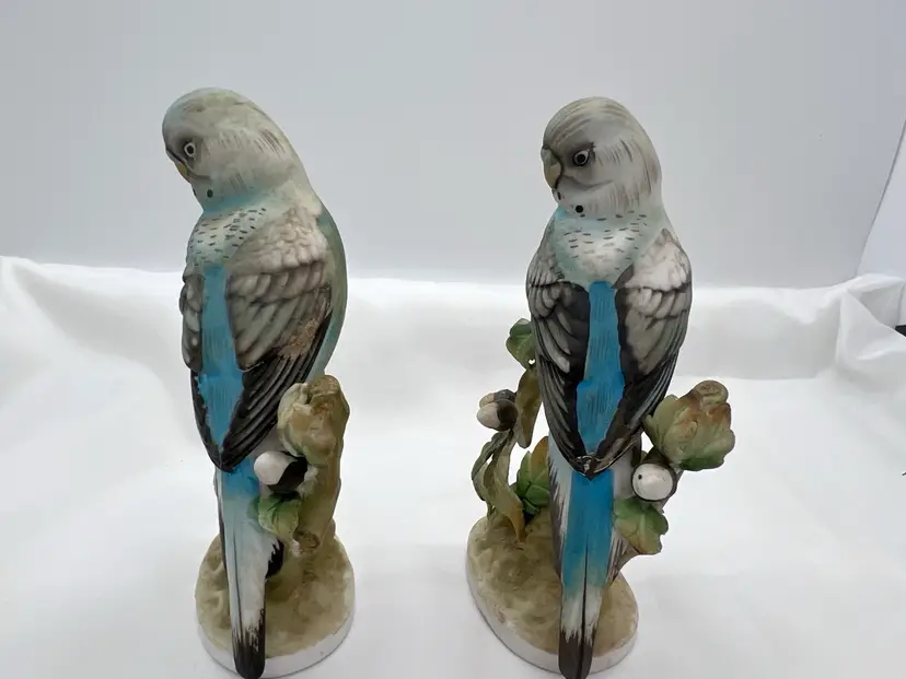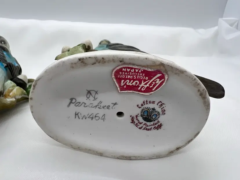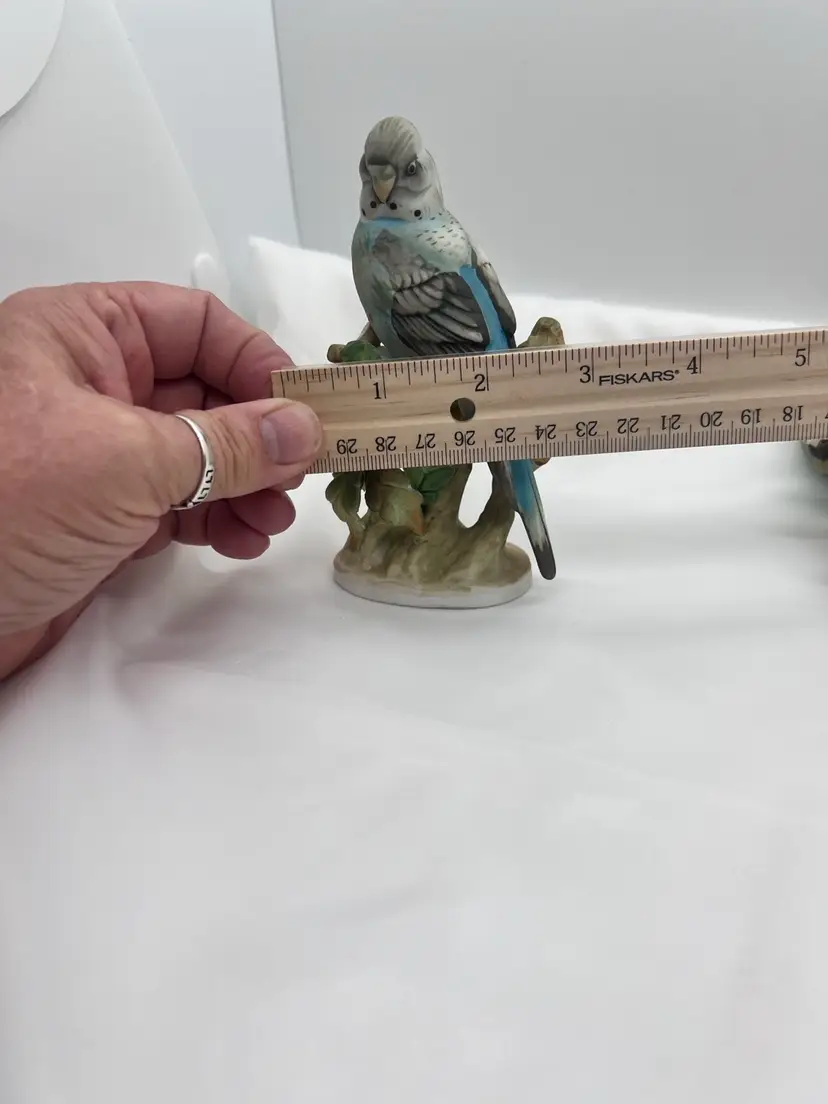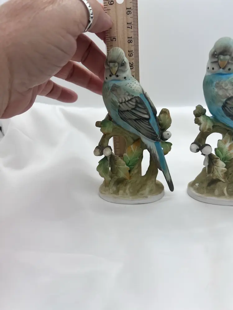 Beautiful Lefton porcelain hand painted blue parakeet on a branch made in Japan Such detail in the hand painting that the two are not exactly alike. There is damage to each piece. The one on the left is missing a leaf on the bottom left, the one on the right, the top part of the leaf to the left of his belly on the left is broken off I did not even see the damage until I put them in the light box. They could be touched up with a little paint and you would never notice it. Each one would still make a beautiful display piece. Price takes into consideration the damages. 5” x 3”