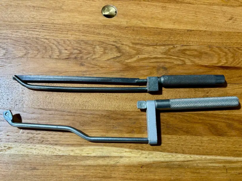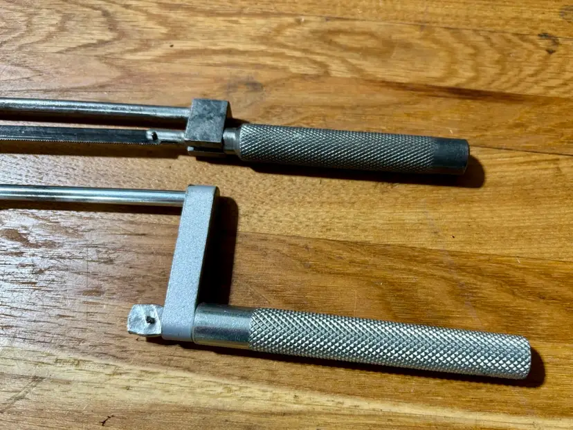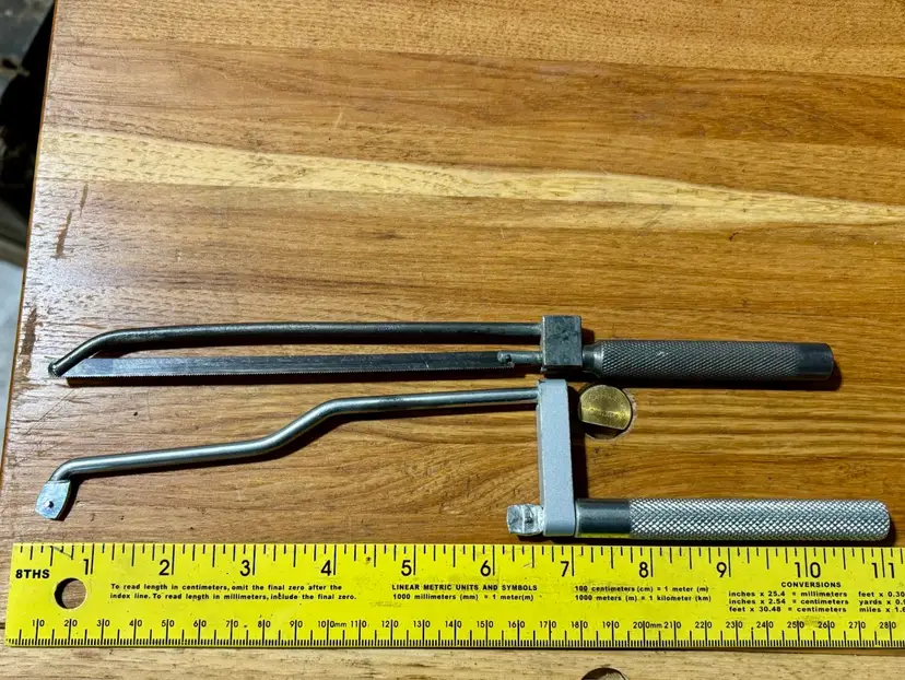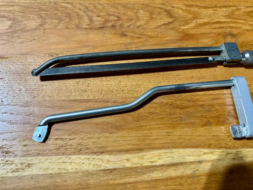Pair of hacksaws used for navigating in tight spaces. These hacksaws are in great shape, and the blade tighteners turn as expected. The narrower of the two has a blade, but both could use new blades if you plan to use them.