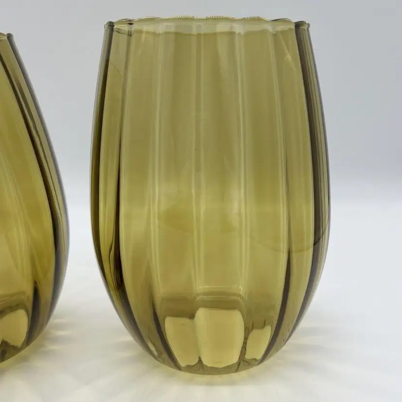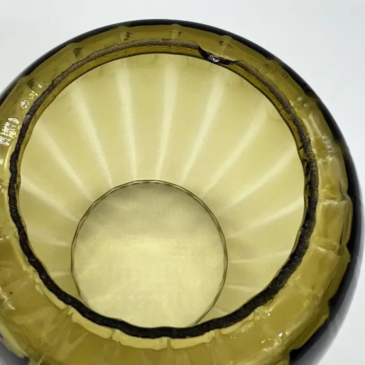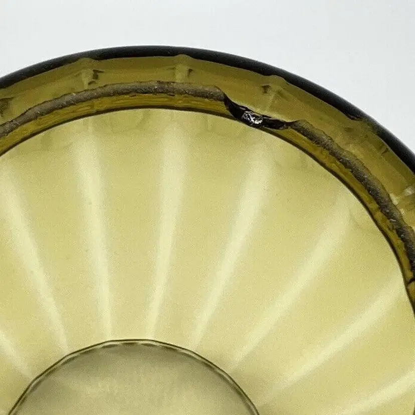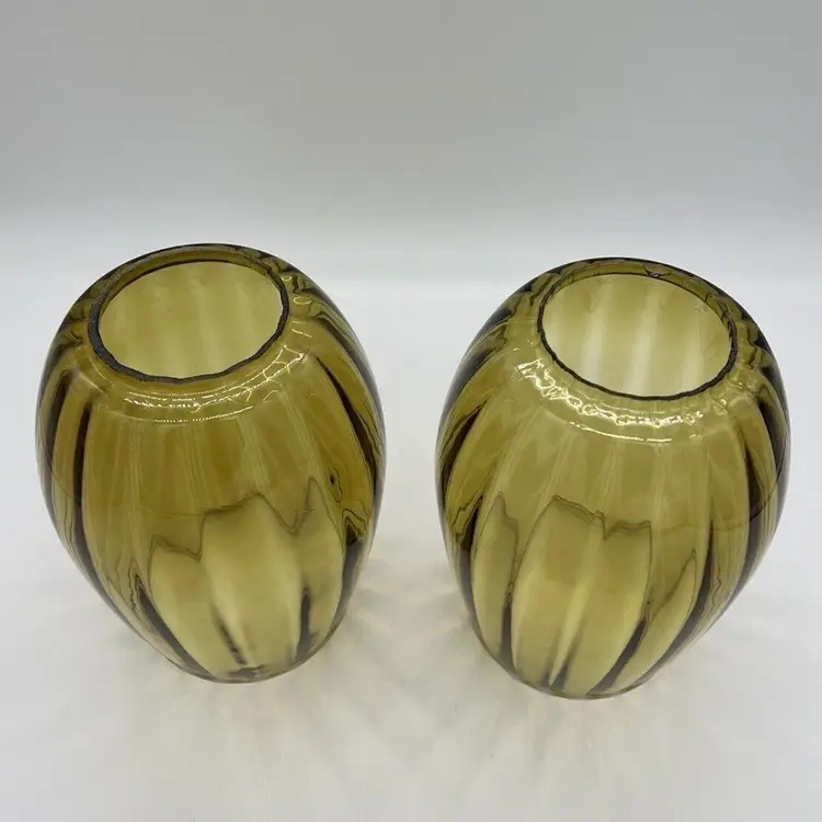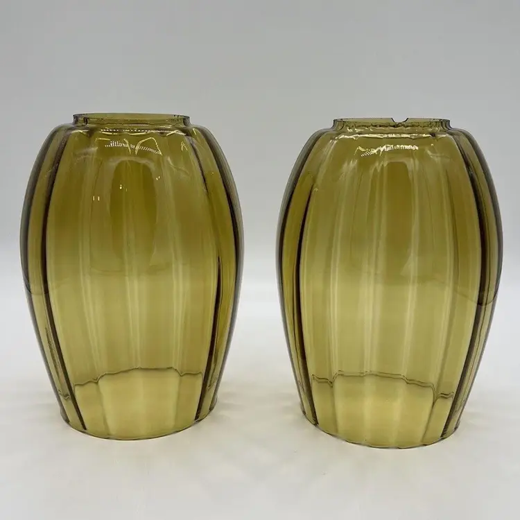 This pair of vintage Empoli glass shades is a beautiful addition to any home. The fluted optic pattern and olive green color give them a unique and retro look. Measuring 7 inches tall and 3 3/4 inches in diameter, these pendant shades are perfect for anyone looking to add some vintage charm to their living space. They are perfect for use with lamps, sconces, ceiling fixtures, pendant, swag lights, and hurricanes or lanterns. Whether you're looking for a statement piece or just something to complement your existing decor, these vintage shades are sure to impress. Great condition. One has a chip on the rim as pictured. No cracks.