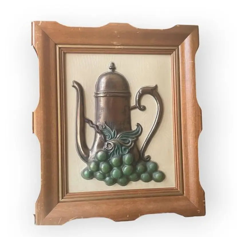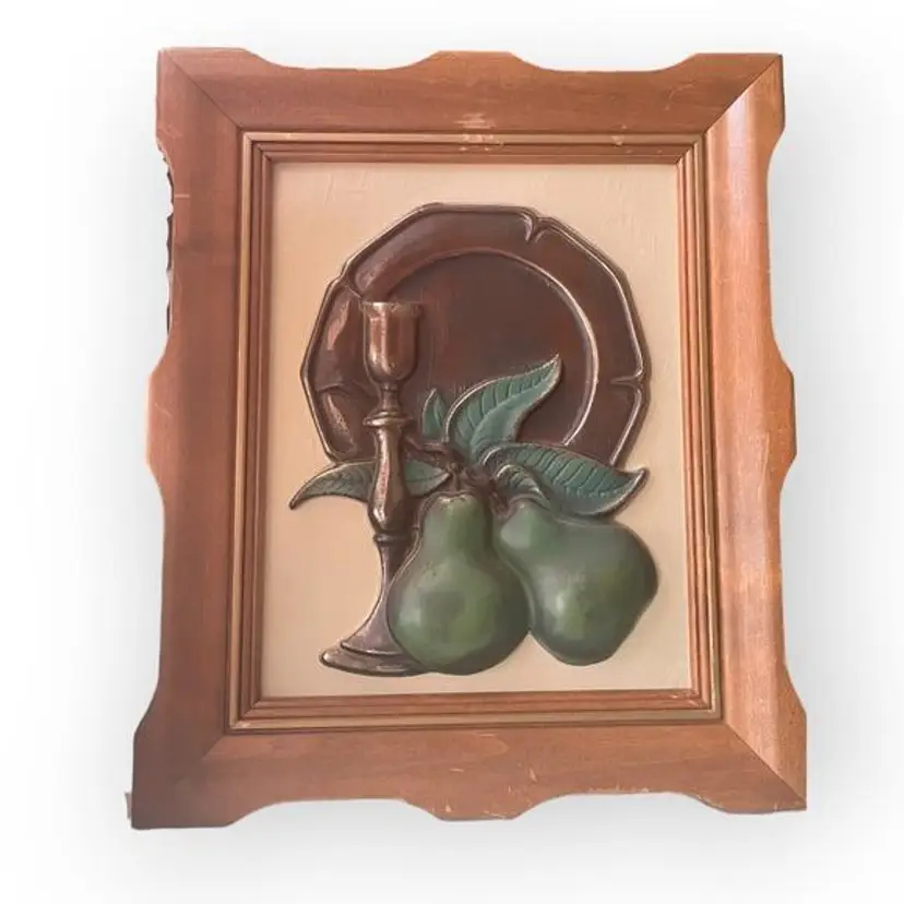 A pair of vintage framed 3D plastic relief wall hangings of fruit, plate, and coffee pot. This was typical modern kitchen art during the '50s and '60s. The framed art measures 11.75 long by 9.75 inches wide. All are in excellent condition including the plastic relief molds. Some light scuffing to areas on the frames. For transparency sake, I left them the way they are but it would be an easy fix with a little wax