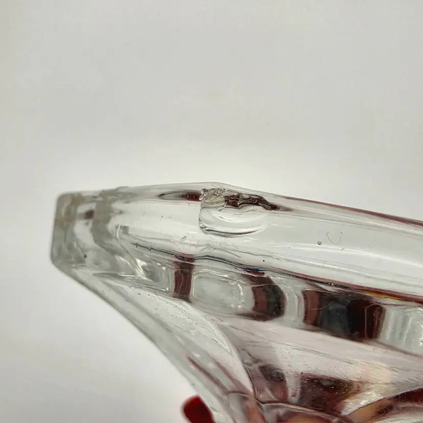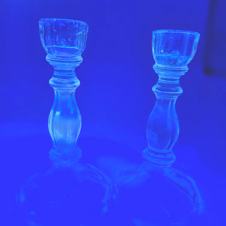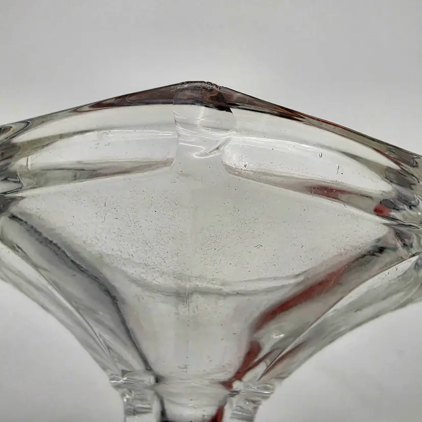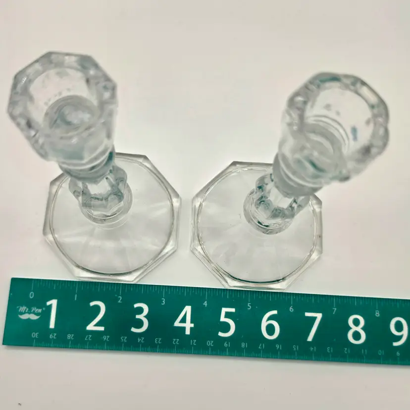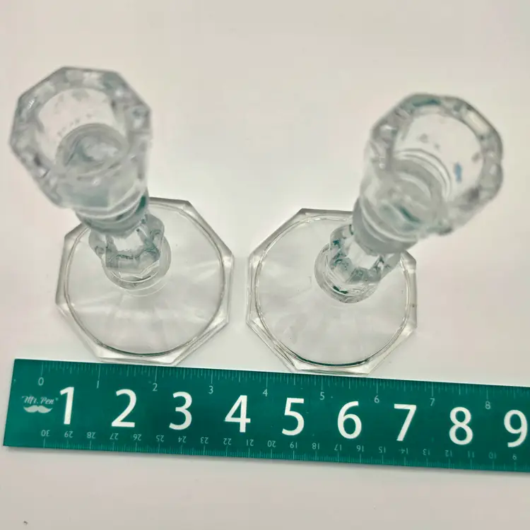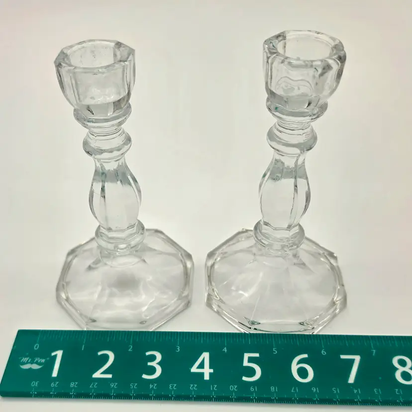 Pattern: Old Williamsburg (Heisey Style) Material: Clear Pressed Glass (Vertical mold seams visible) Quantity: Set of 2 (Pair) Height: 7 InchesBase Width: Approx. 3.5 - 4 Inches Condition: Well loved, chips as pictured