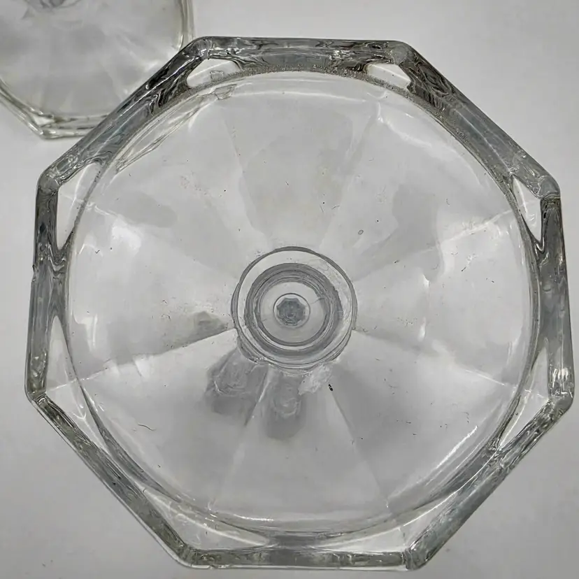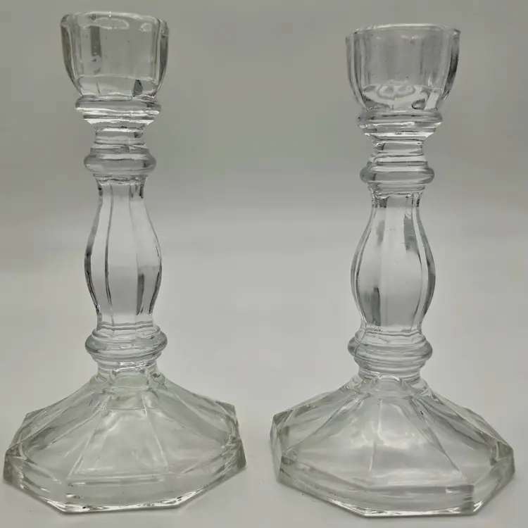 This is a beautiful pair of vintage pressed glass candlesticks in the timeless "Old Williamsburg" pattern. This classic "Colonial Antique" design features a paneled baluster stem with a distinctive hexagonal base and matching hexagonal top. While this pattern was originally created by A.H. Heisey & Co., this unmarked pair is consistent with the high-quality reproductions produced by Imperial Glass using original Heisey molds. Their 7-inch height makes them incredibly versatile for smaller dining tables, mantles, or bedside decor.