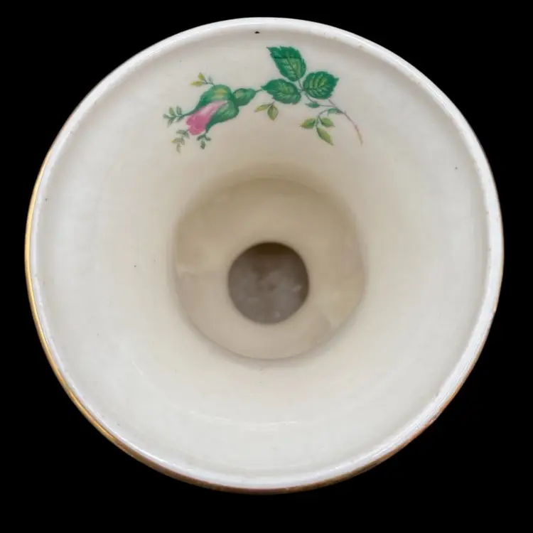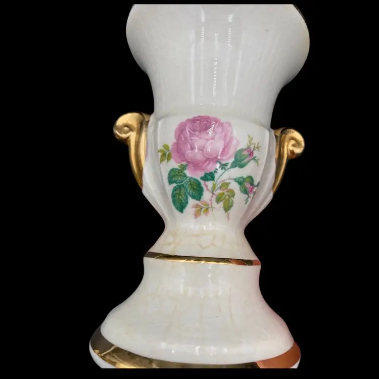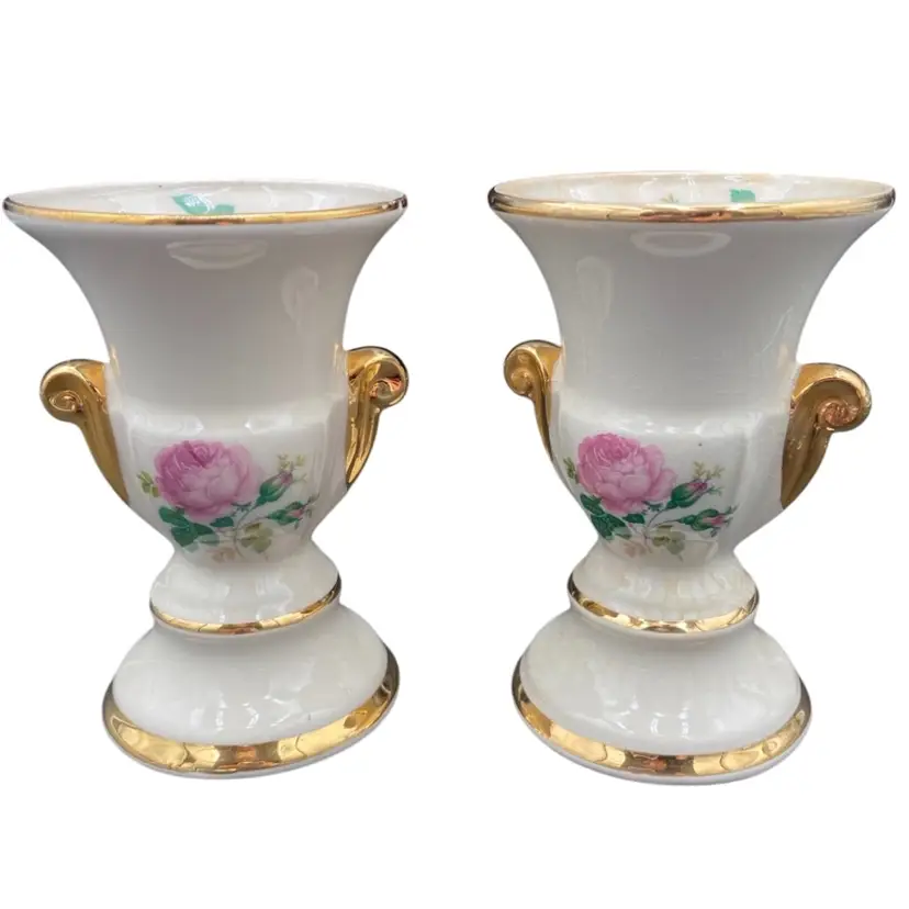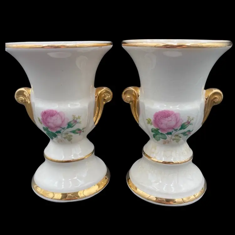 This pair of vintage porcelain vases features a beautiful roses pattern, gold-painted scroll handles, and gold banding. The urn shape and double scroll handles give them a classic Greek style, perfect for all occasions. Each vase stands at a medium height of 5 inches and is 4 inches wide.Made of high-quality porcelain, these vases are durable and easy to clean with a damp cloth.