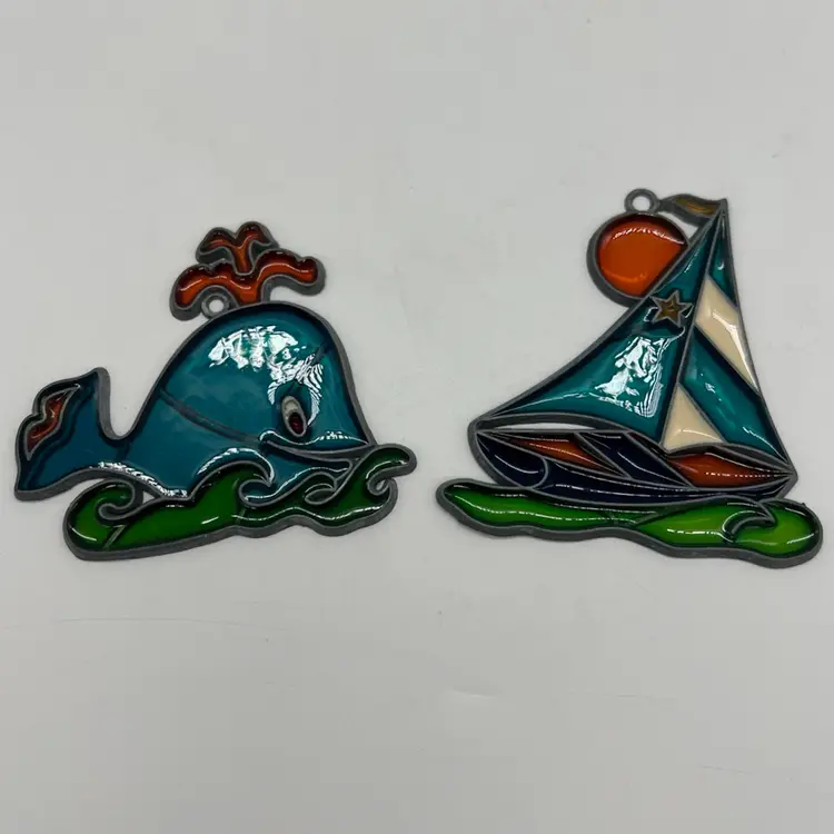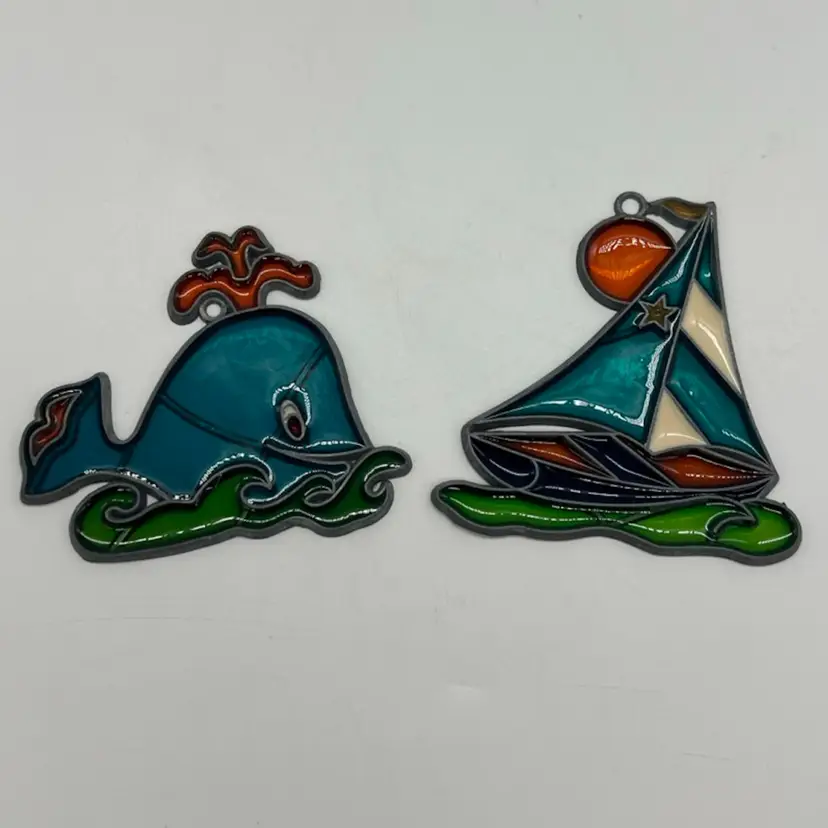 Super cute anthropomorphic blu whale and a sailboat. They measure about 3” tall.