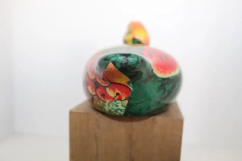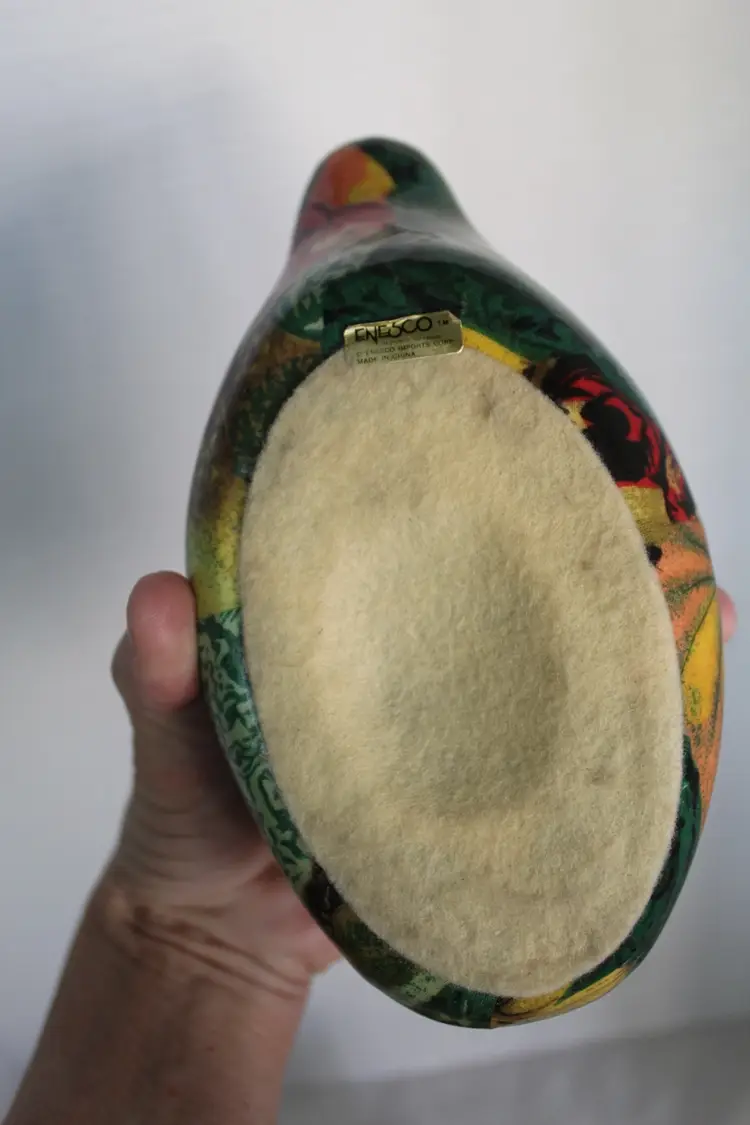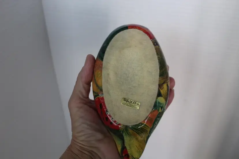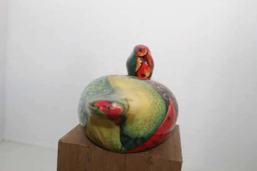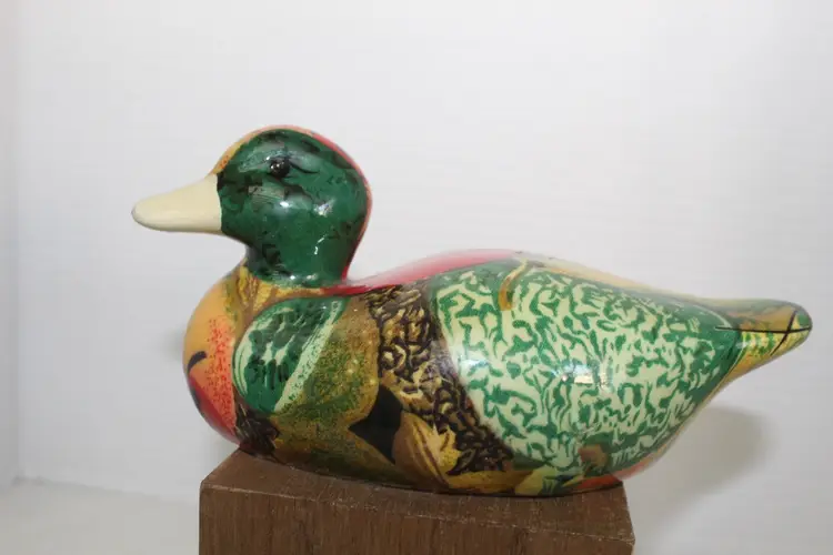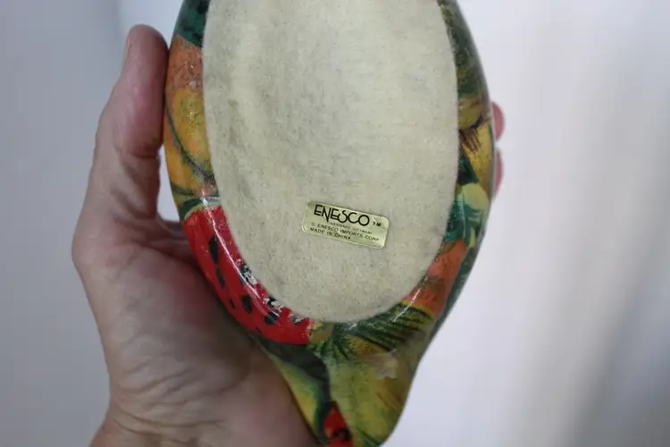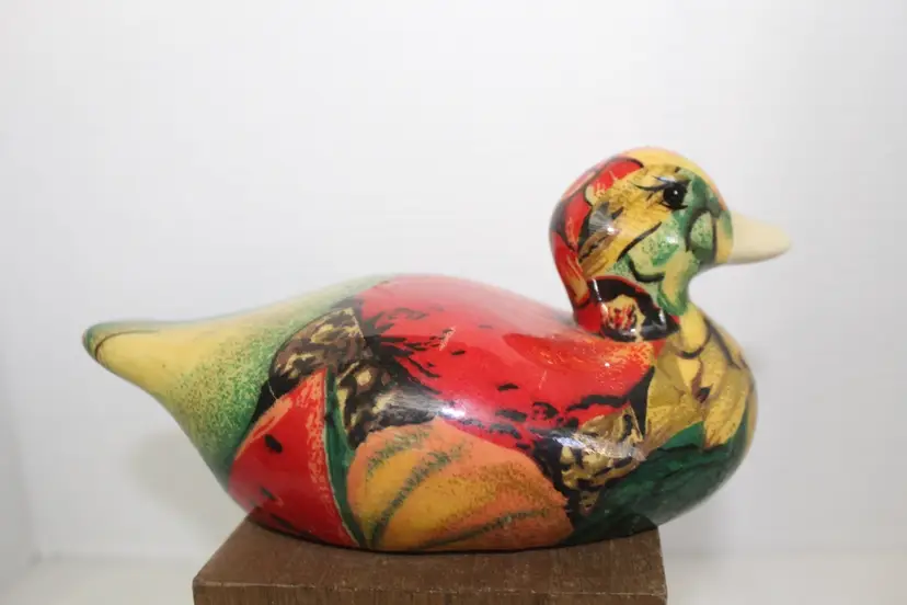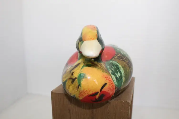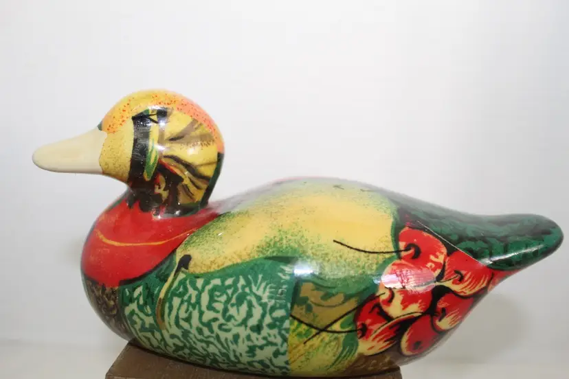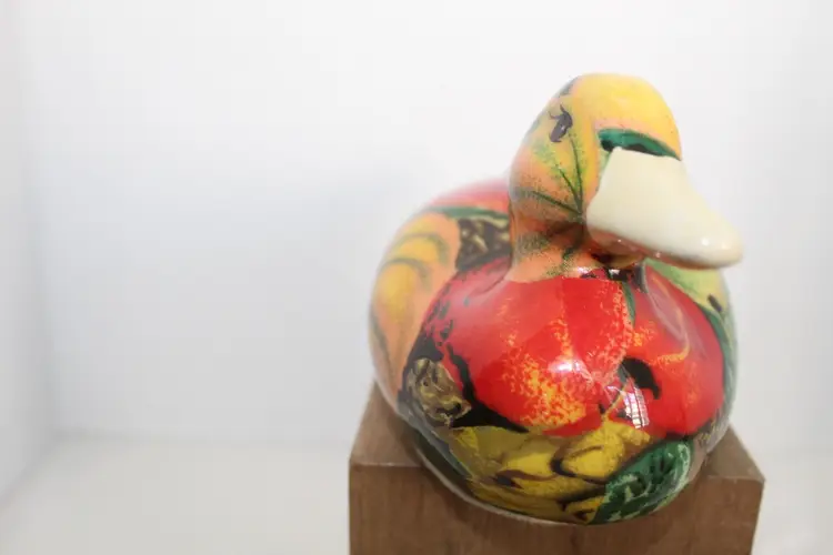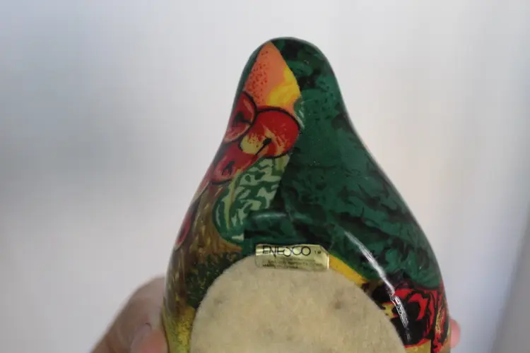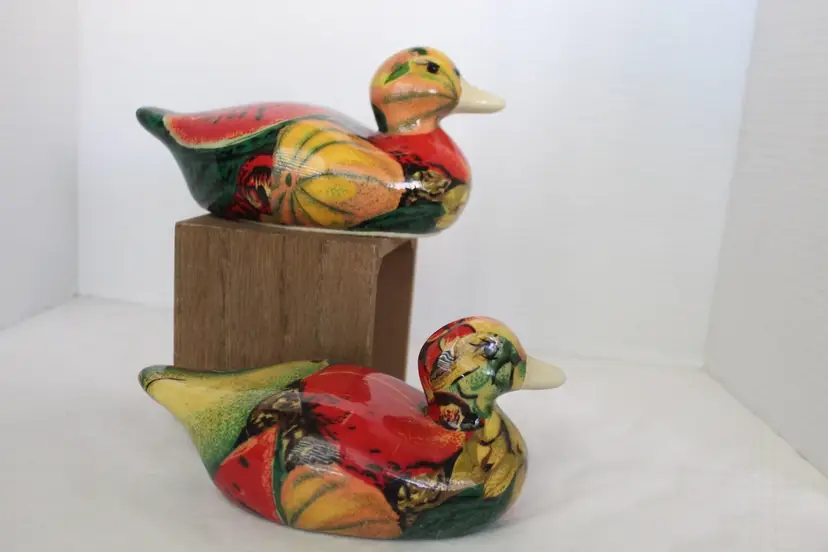This product is a pair of vintage Enesco ceramic duck mallard decoy figurines adorned with fruit decor. The figurines resemble mallard ducks and are made of ceramic material. Perfect for collectors of animal-themed decor, these figurines add a unique touch to any space with their detailed design and decorative accents. The material used in the construction gives the figurines a realistic look, while the handmade quality adds a special charm. Display these figurines in a collection or as standalone pieces for a whimsical touch in any room. The fruit decoupage makes them ideal for a kitchen or dining space. One duck is 7.75 inches from the tip of beak to tip of tail. The other is 7 inches. They are 3 5/8 and 3 1/4 inches high respectively.