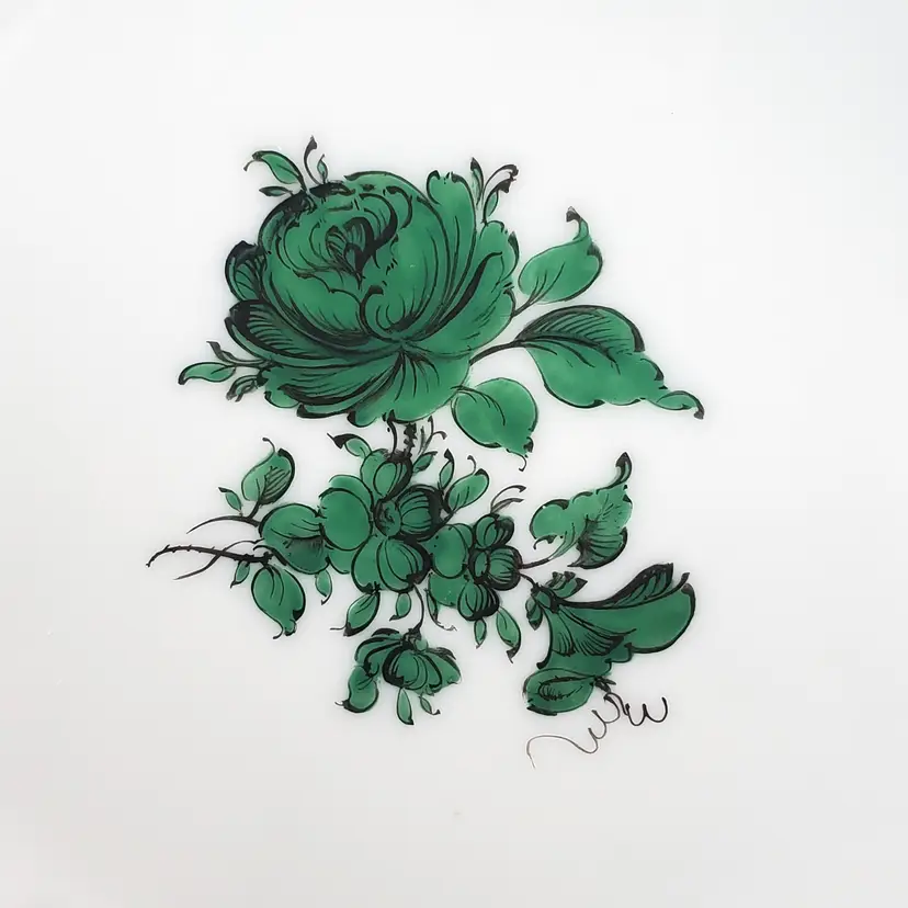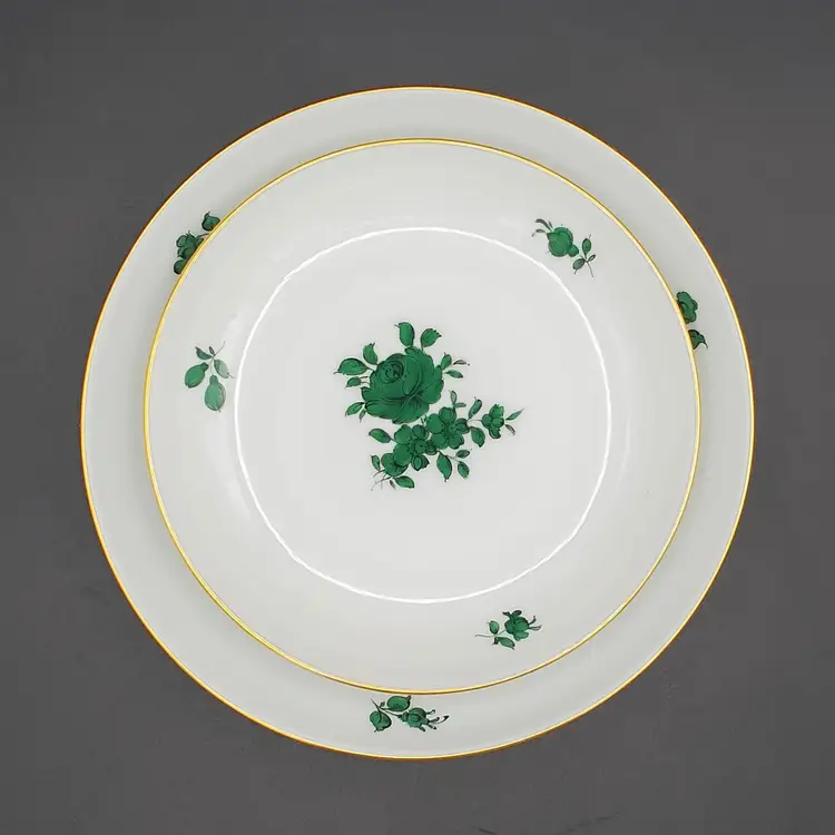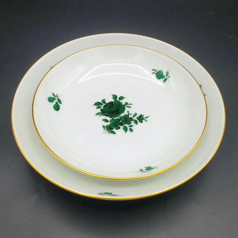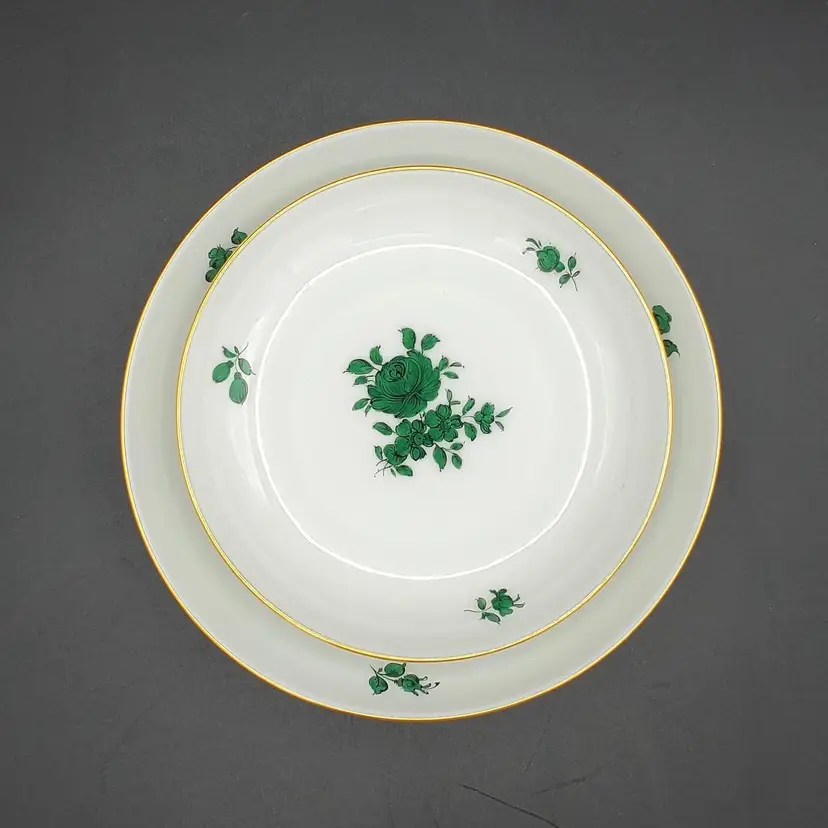 This is a pair of small porcelain plates from Wien in excellent condition. The larger is 6" across and approx 1.25" high. The other is 5" across and approx 1" high. Both feature green handpainted roses and gold trim, perfect for St. Patrick's Day. Most likely these were part of a fine dining place setting. As a pair, they have lots of possibility. Trinket dish, holiday decor, etc. Thanks for looking!