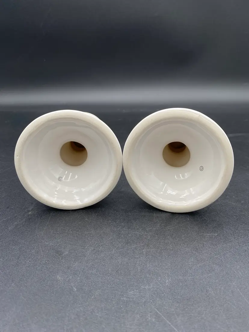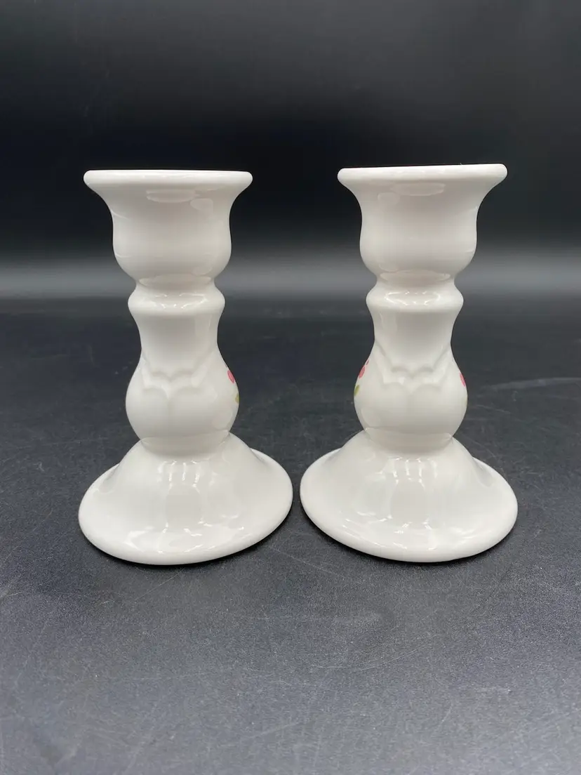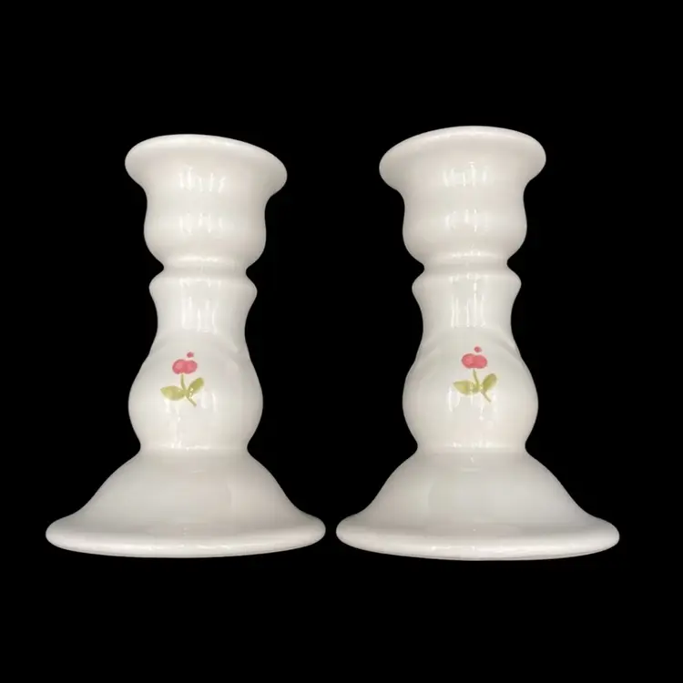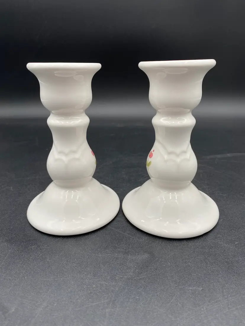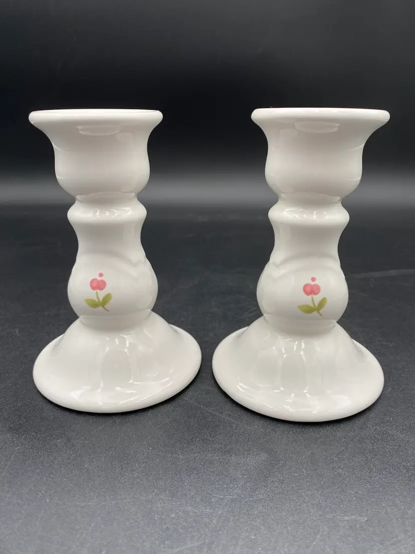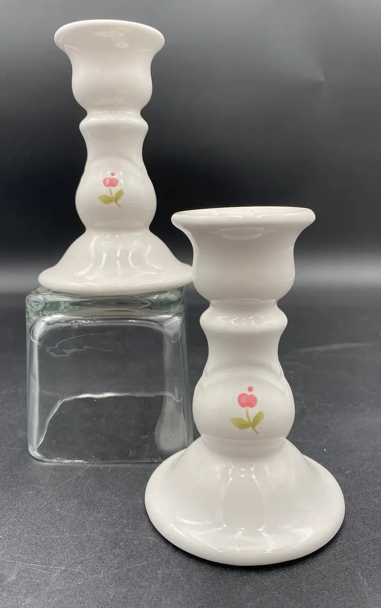 This pair of Pfaltzgraff candlestick holders have a soft white stoneware color with a lovely pink flower on the front and back of each. These holders are 5.1 inches tall and have a 2.3-inch diameter at the top and a 3.5-inch width at the bottom, providing ample support for your favorite candlesticks. Crafted in the United States in 1986, these candlestick holders are an original vintage piece. They weigh 8 ounces each. Use them to add a touch of sophistication to your dining table or as a decorative accent in your living room.