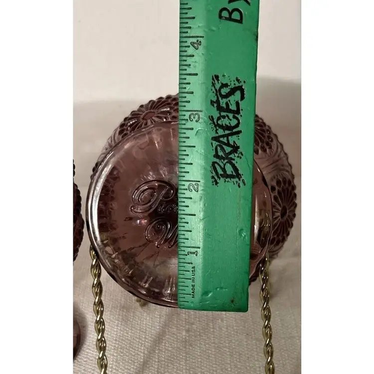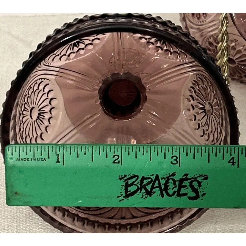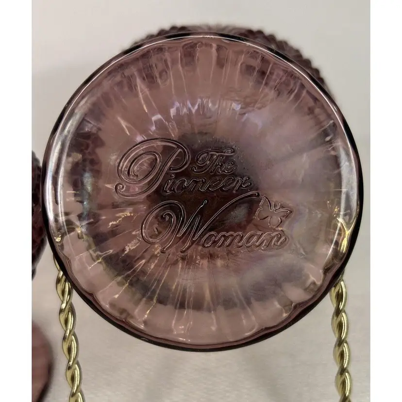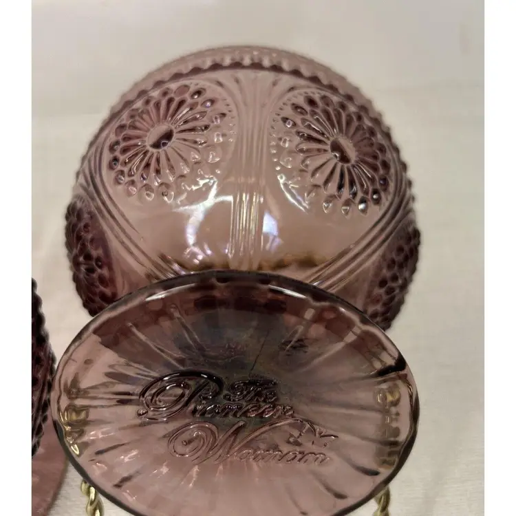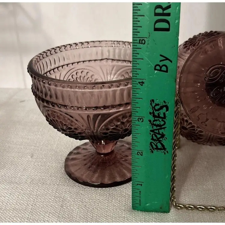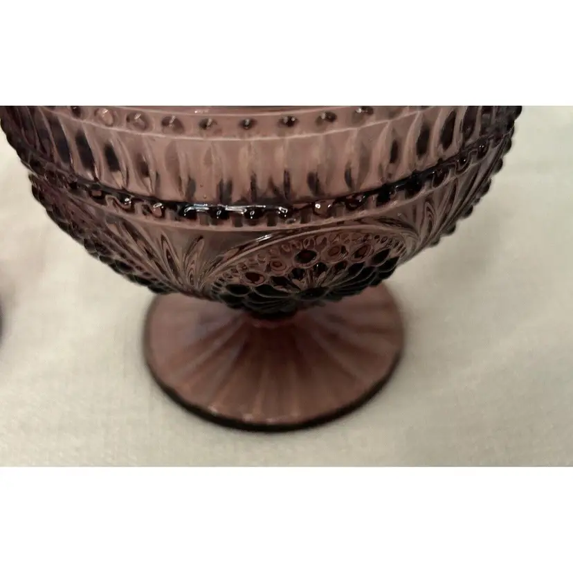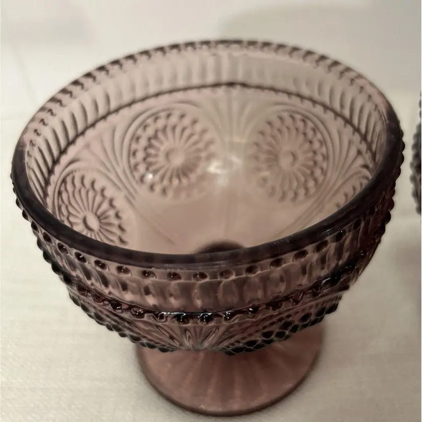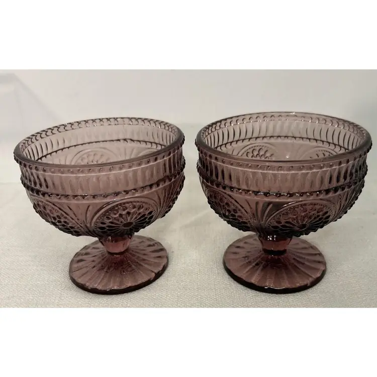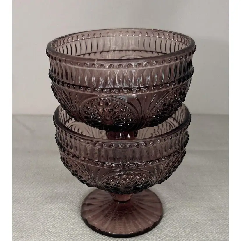 Indulge in your favorite desserts with this pair of The Pioneer Woman Glass Plum Footed Ice Cream Dessert Cups Adeline Pattern. This pair is perfect for all occasions and features a beautiful Adeline pattern in a rich plum color. Each dessert cup measures 4" inches tall by 4" inches wide at the top rim and 3" inches wide at the bottom base. Crafted from high-quality glass, these round dessert bowls are original and unique. The footed design adds a touch of elegance and sophistication to your dining experience. These were made in China for The Pioneer Woman brand. Bring home this pair of The Pioneer Woman Glass Plum Footed Ice Cream Dessert Cups Adeline Pattern and enjoy your favorite desserts in style. This pair of Pioneer Woman Glass Adeline Plum Footed Ice Cream Dessert Cups, are in excellent pre-owned condition, with NO chips, cracks or repairs. Please review all pictures for proper assessment of the excellent pre-owned condition.
