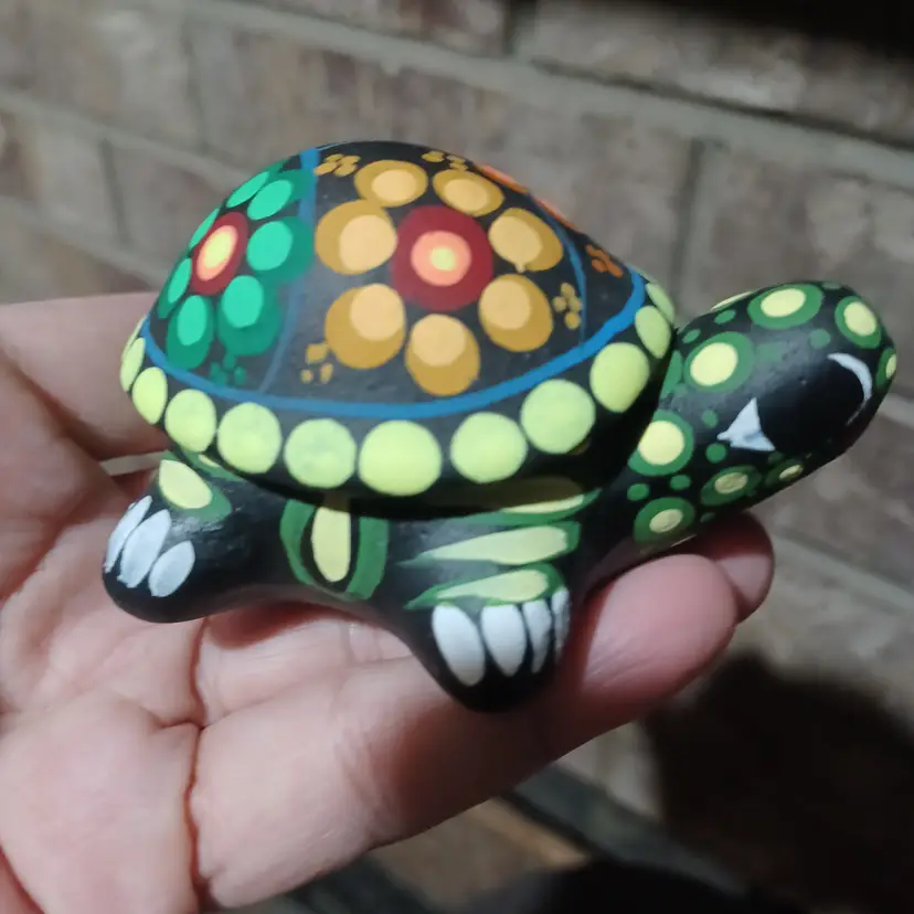 Each turtle features a removable shell that reveals a small hidden compartment perfect for storing jewelry, rings, or tiny keepsakes. The detailed hand-painted designs and bold colors make these both functional and decorative statement pieces.