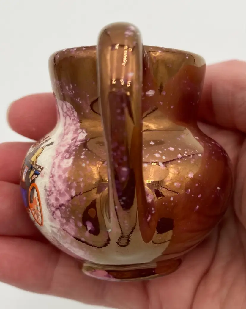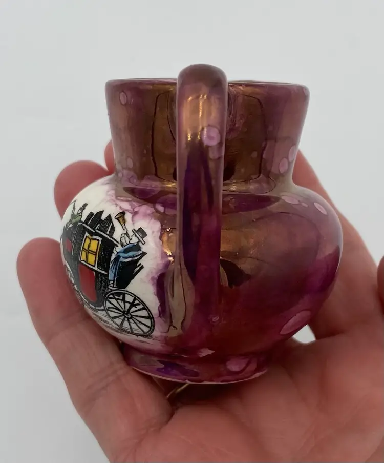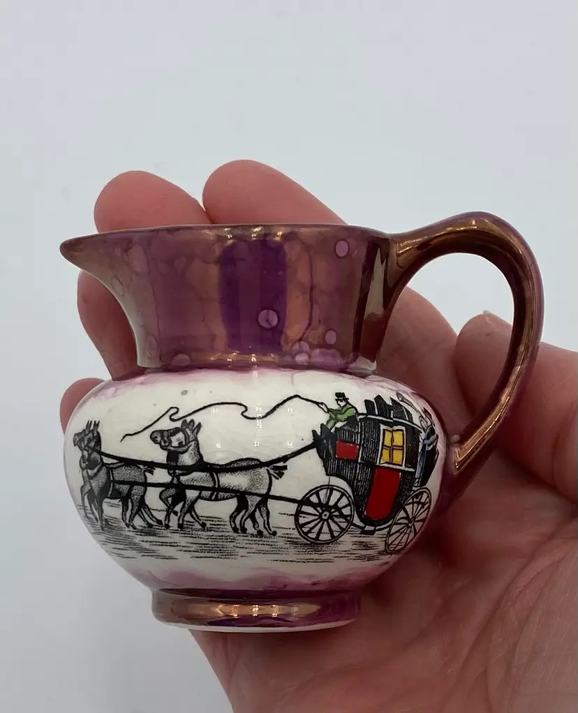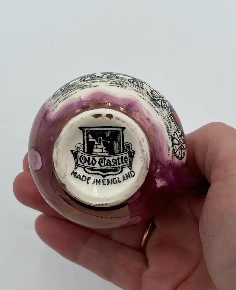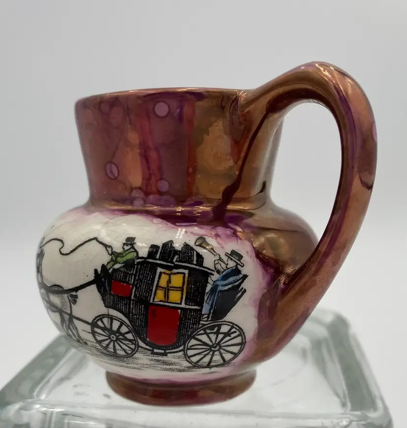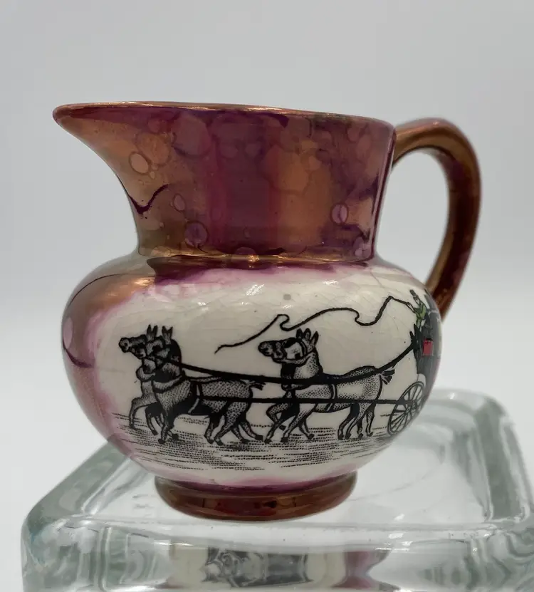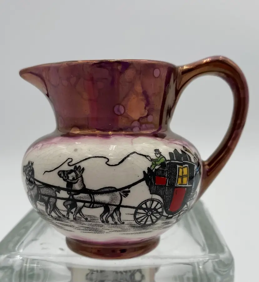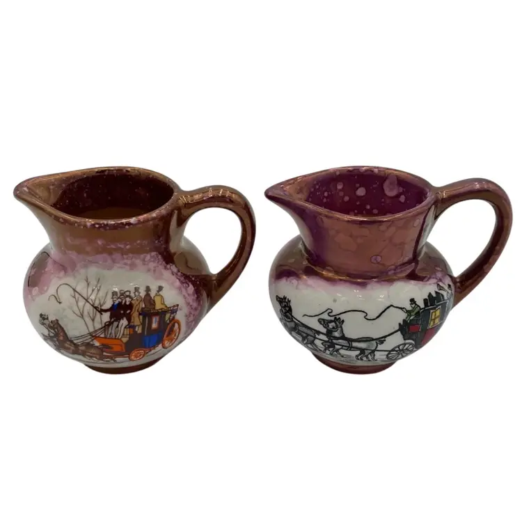 These beautiful vintage jugs from Old Castle Pottery (the North American label for Gray's Pottery in England) are pattern A8551, Coaching Scenes. The Gray's Pottery called this style "Splashed", but it has come to be called Mottled or Splatter Lustreware as well. Comprised of pink and purple splatters on copperware, it has a unique appeal and is an excellent example of mid-century lustreware. Crafted in Stoke-on-Trent, England in 1949 (based on the design date and backstamp used), these small jugs are 2.8 inches long, 2.25 inches tall, and 2.2 inches wide. Each weighs 2.5 ounces and depict a carriage drawn by four horses and a carriage drawn by a pair of horses.