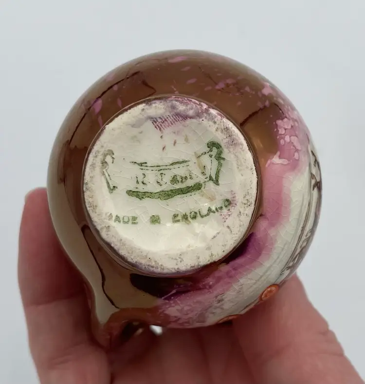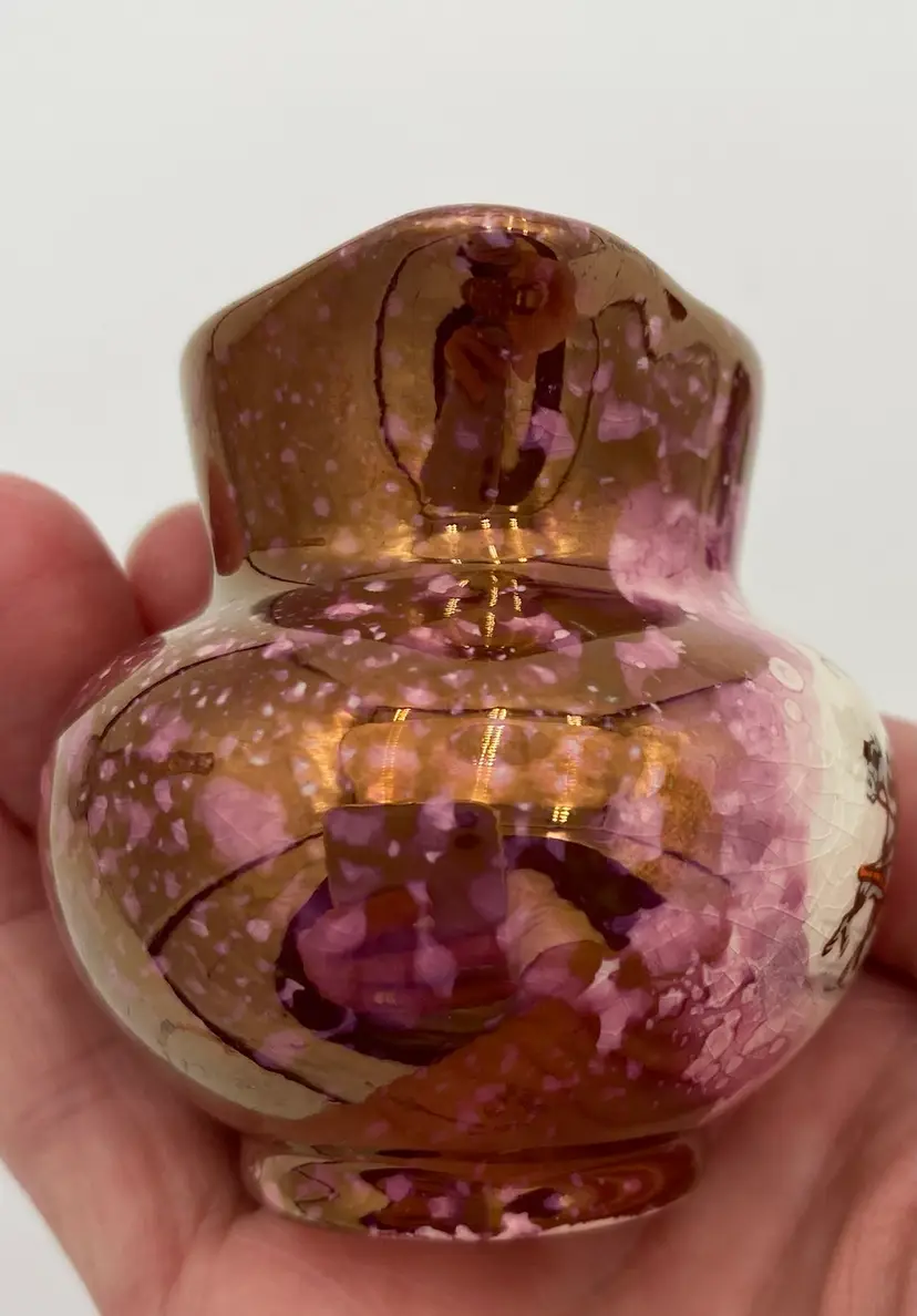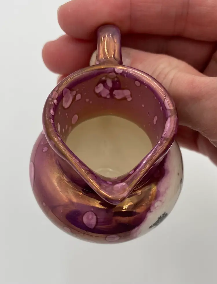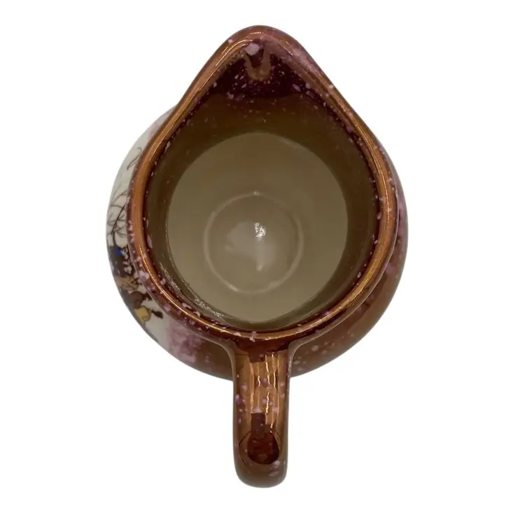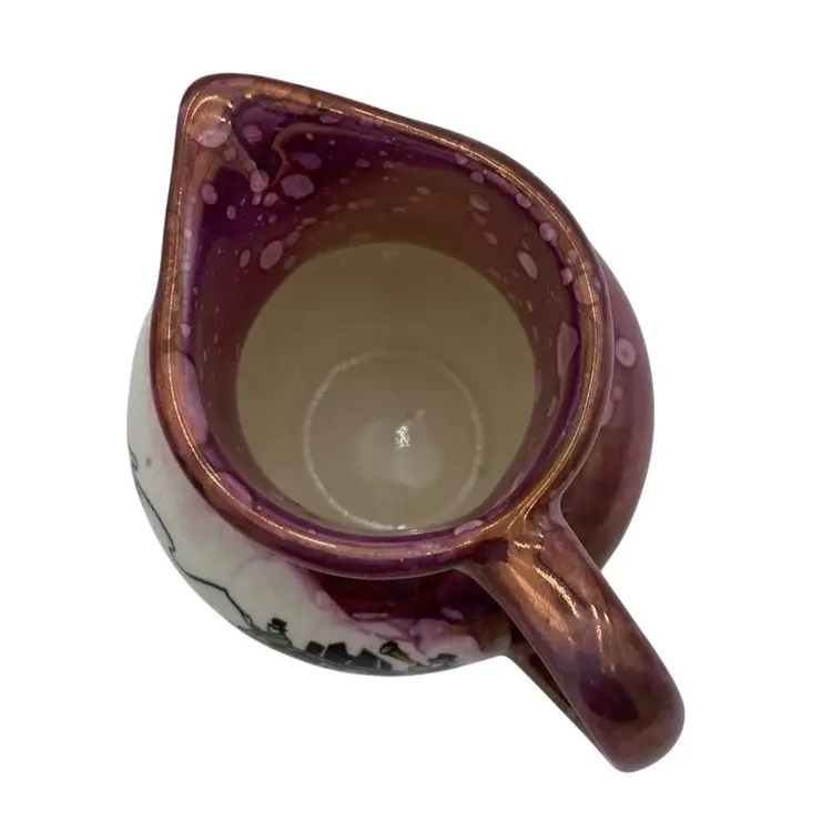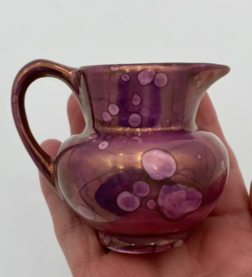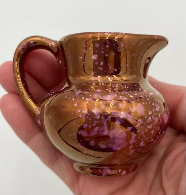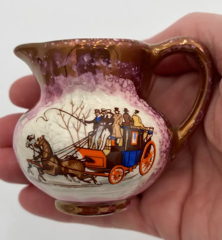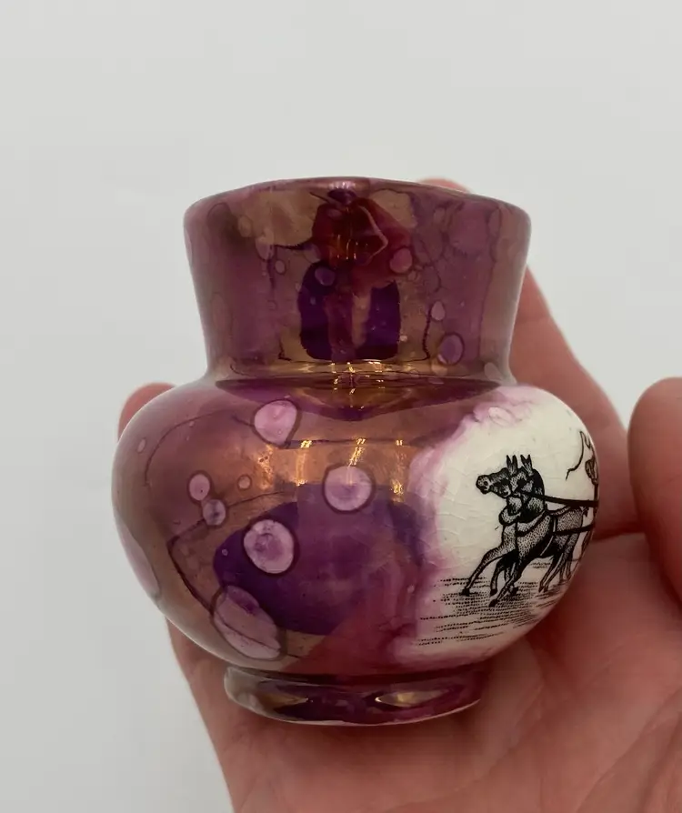 These beautiful vintage jugs from Old Castle Pottery (the North American label for Gray's Pottery in England) are pattern A8551, Coaching Scenes. The Gray's Pottery called this style "Splashed", but it has come to be called Mottled or Splatter Lustreware as well. Comprised of pink and purple splatters on copperware, it has a unique appeal and is an excellent example of mid-century lustreware. Crafted in Stoke-on-Trent, England in 1949 (based on the design date and backstamp used), these small jugs are 2.8 inches long, 2.25 inches tall, and 2.2 inches wide. Each weighs 2.5 ounces and depict a carriage drawn by four horses and a carriage drawn by a pair of horses.