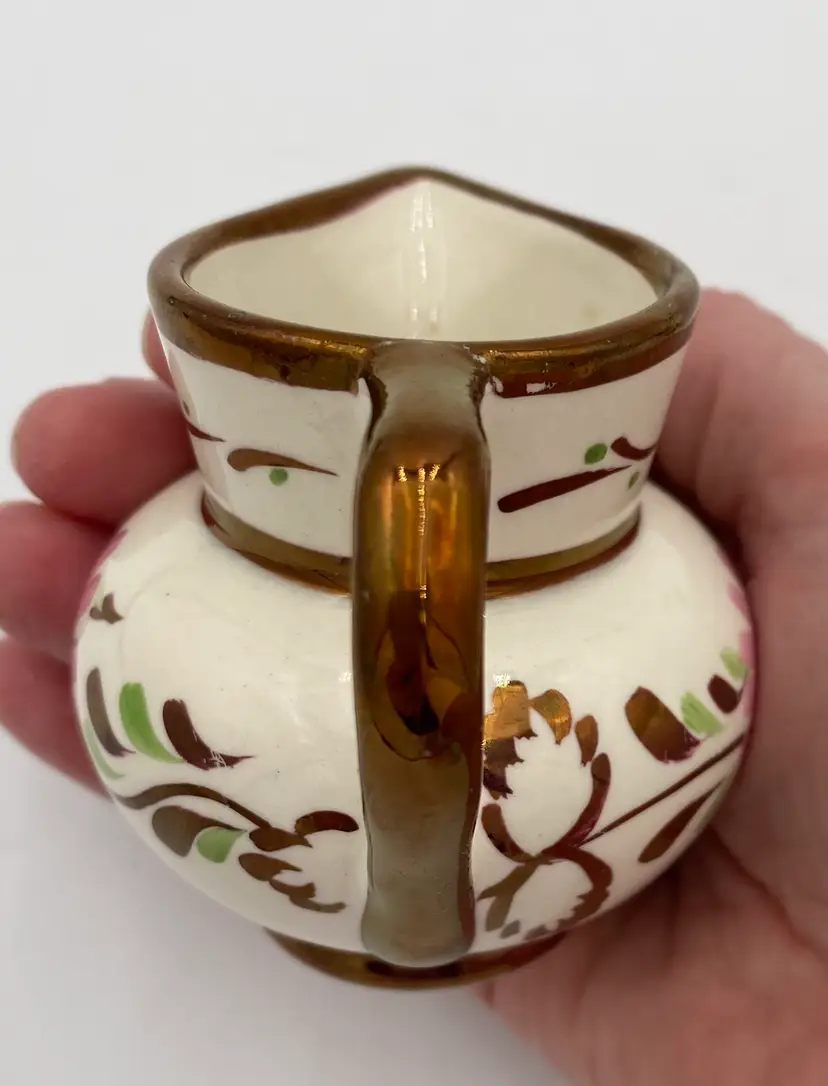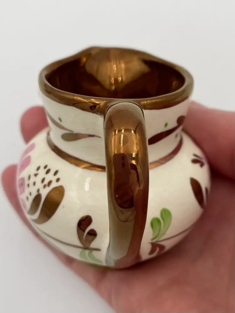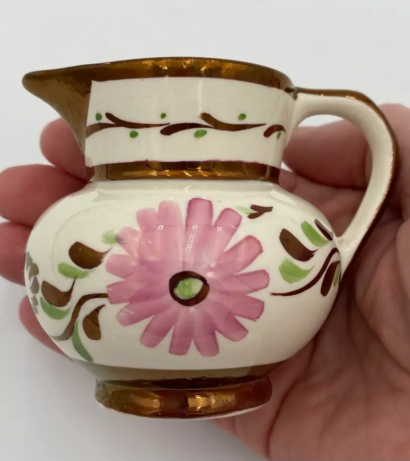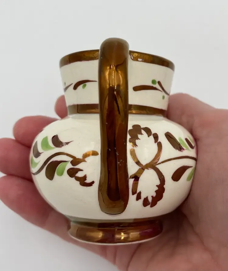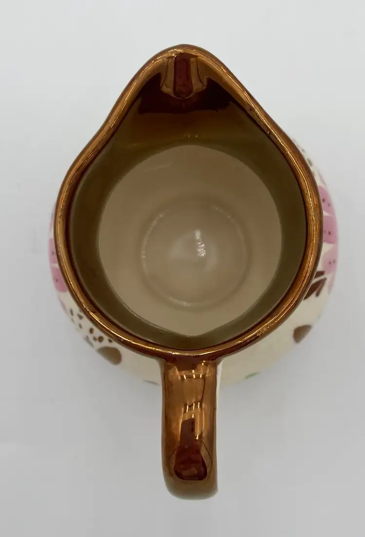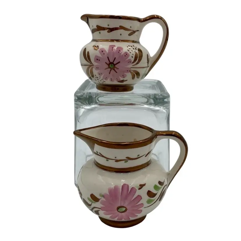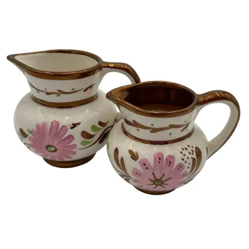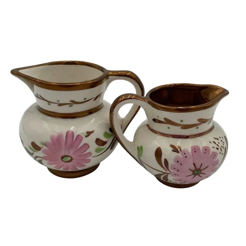 This beautiful pair of vintage jugs from Gray's Pottery (England) and Old Castle Pottery (the American stamp used by Gray's Pottery in North America) is a must-have for any mid-century modern collector. The copper lustre with pinkish-purple flowers, green and copper florals are very pretty. Crafted in Stoke-on-Trent, England in the early 1950s, these jugs are 1) a medium size marked with Gray's Pottery with design A8678, and 2) a small size marked with Old Castle Pottery with design A5981. They both have printed backstamps.