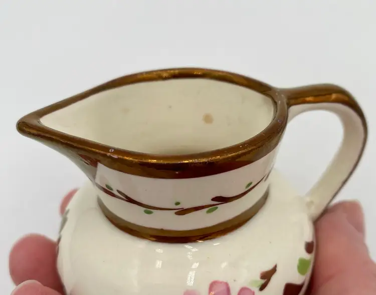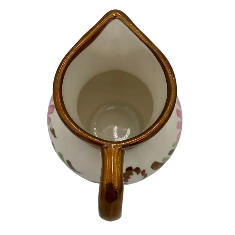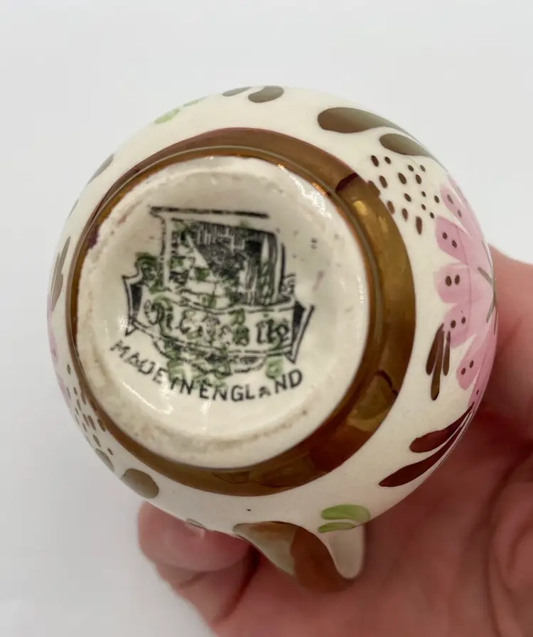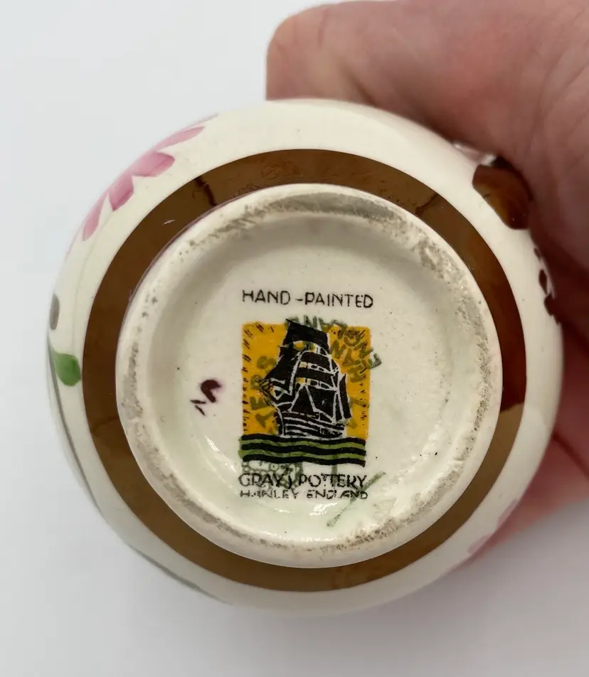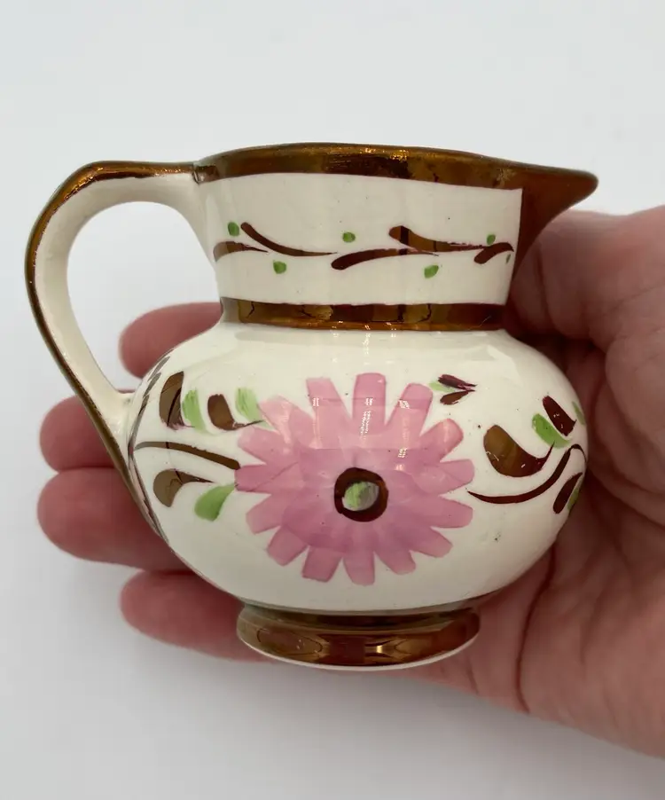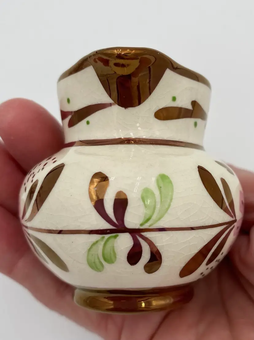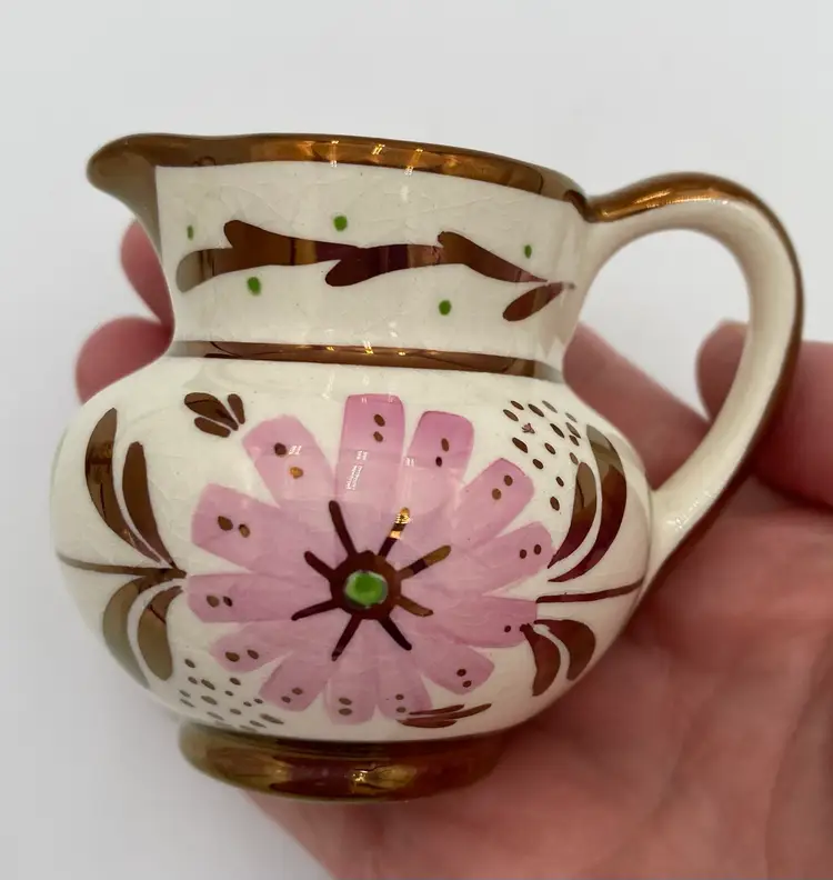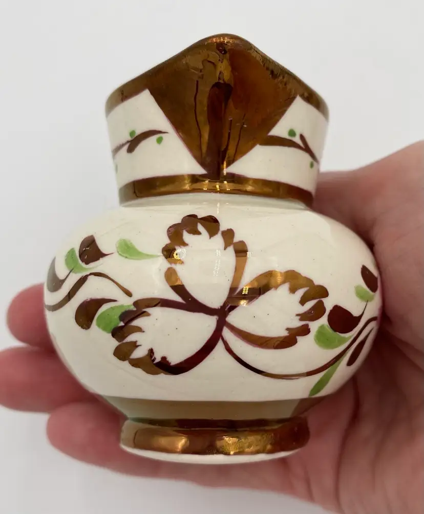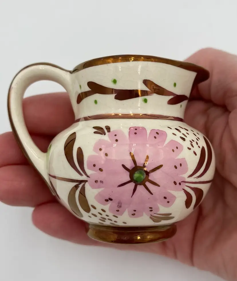 This beautiful pair of vintage jugs from Gray's Pottery (England) and Old Castle Pottery (the American stamp used by Gray's Pottery in North America) is a must-have for any mid-century modern collector. The copper lustre with pinkish-purple flowers, green and copper florals are very pretty. Crafted in Stoke-on-Trent, England in the early 1950s, these jugs are 1) a medium size marked with Gray's Pottery with design A8678, and 2) a small size marked with Old Castle Pottery with design A5981. They both have printed backstamps.