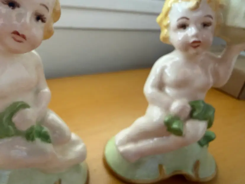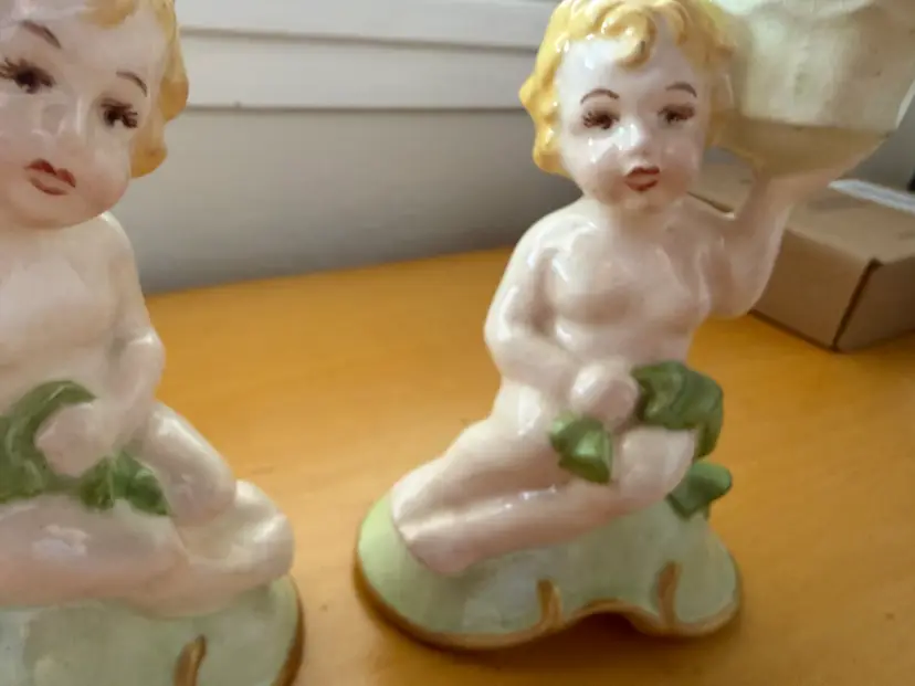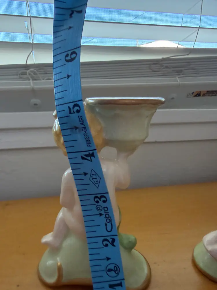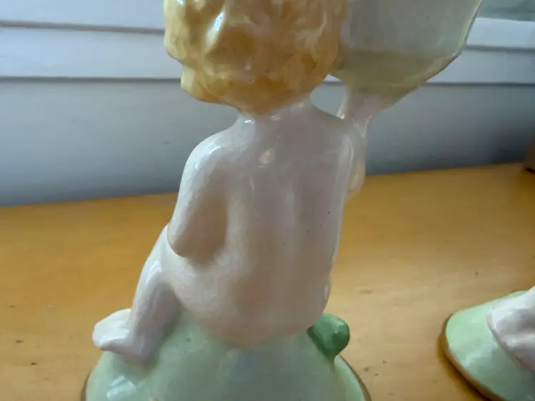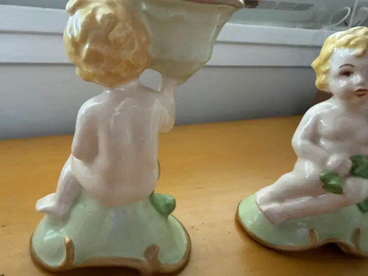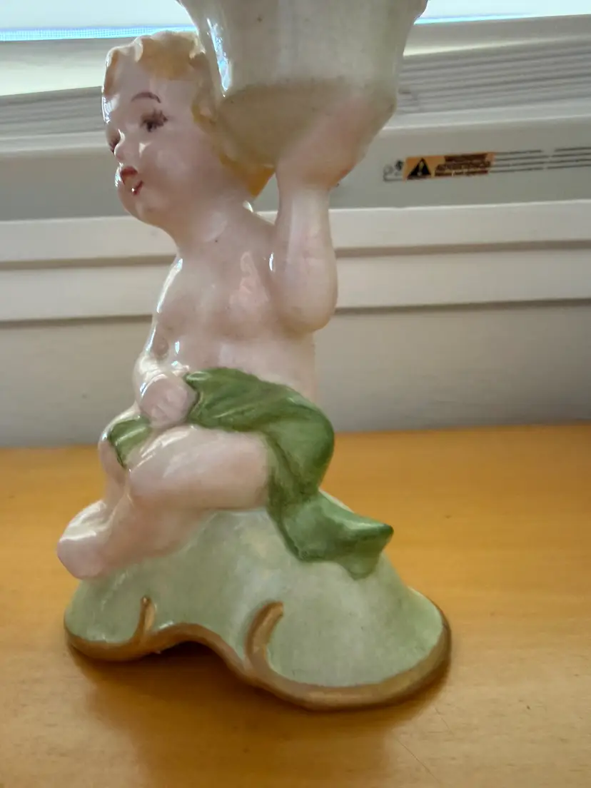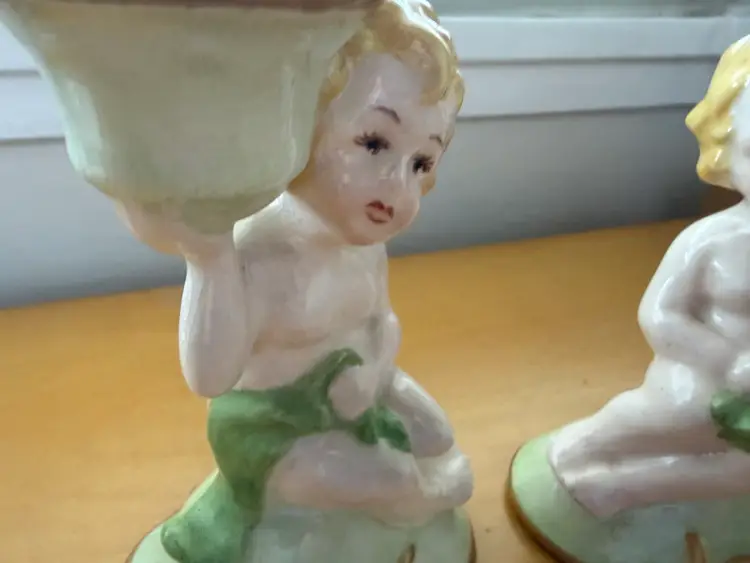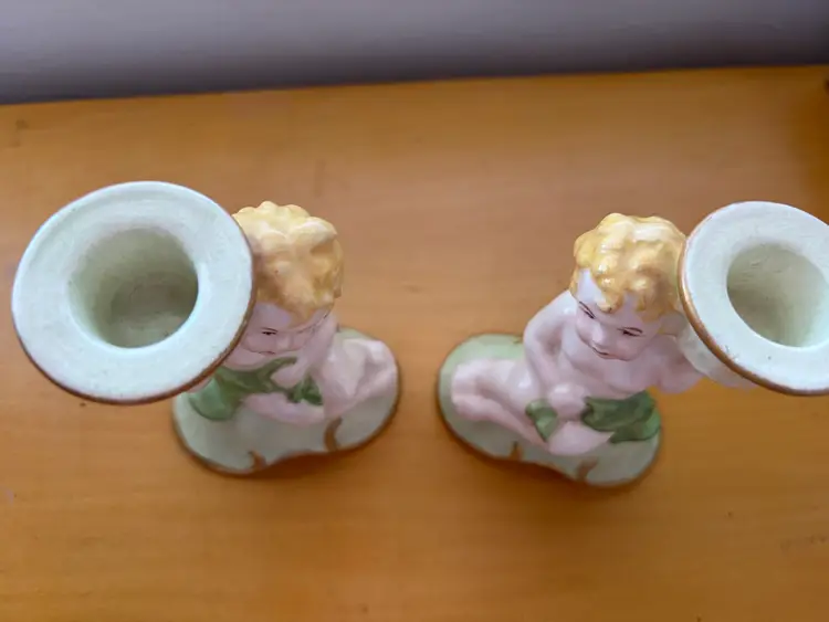Pair of Sweet Vintage Porcelain Cherub Candle Holders, Two Hand Painted Candlesticks with Cherubs. Candlesticks do have crazing, but does not take away from function or beauty.