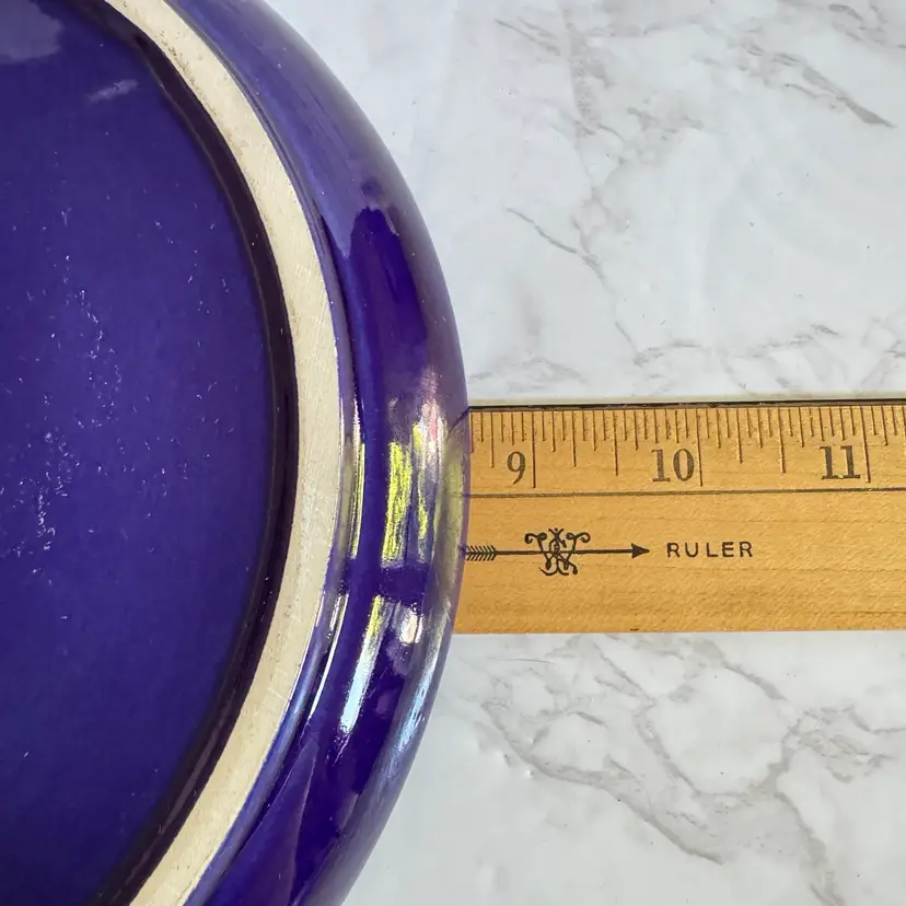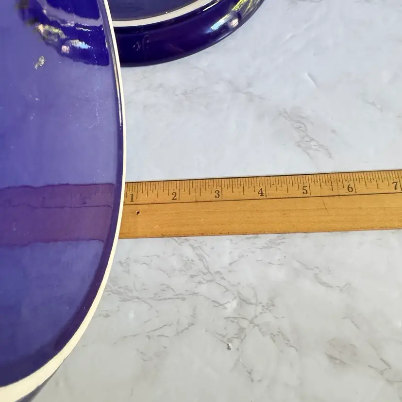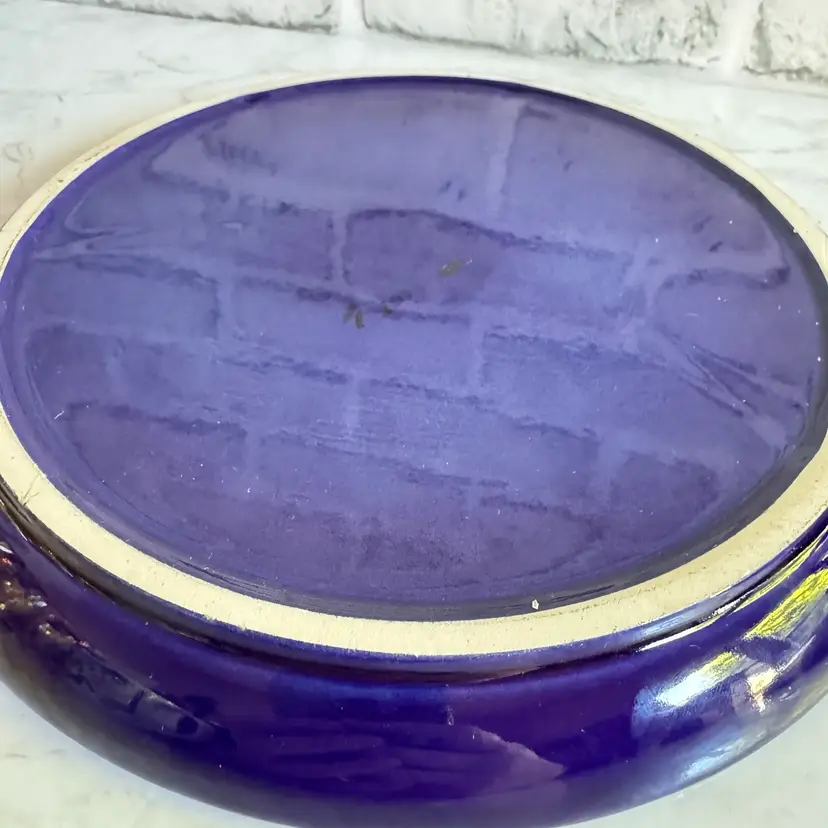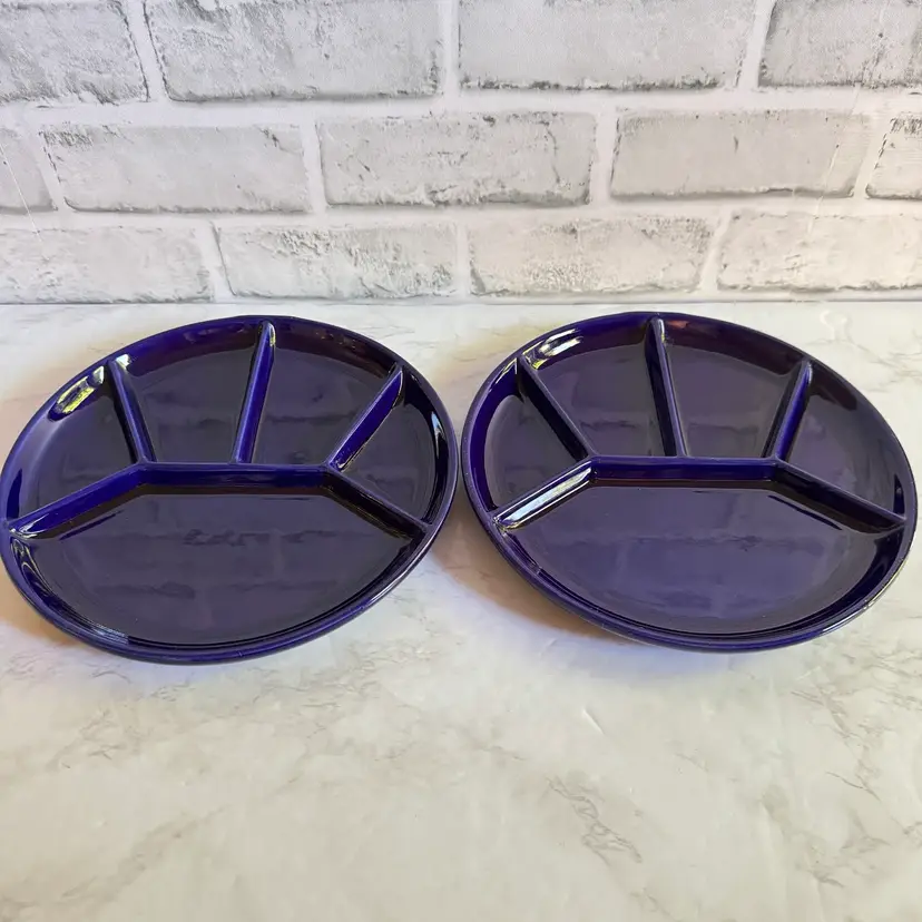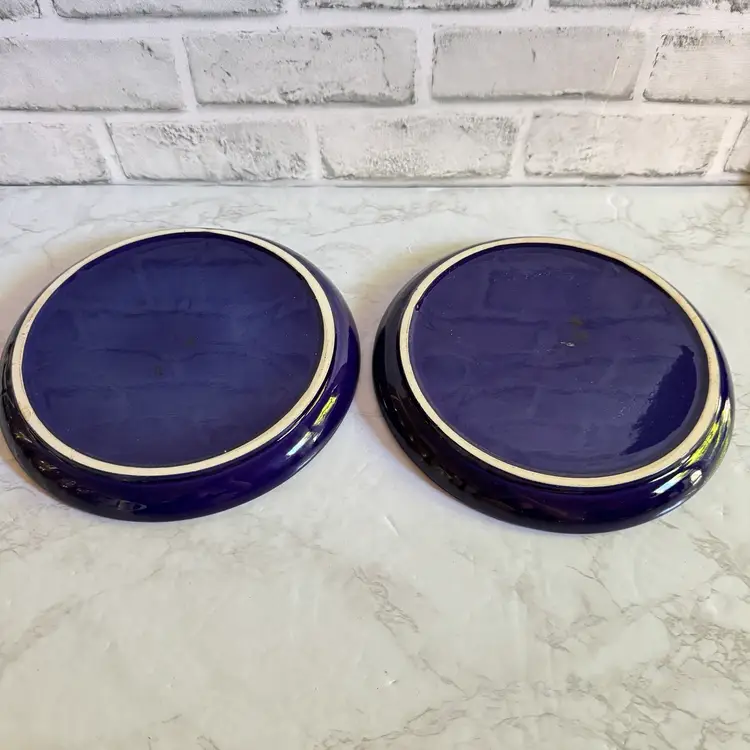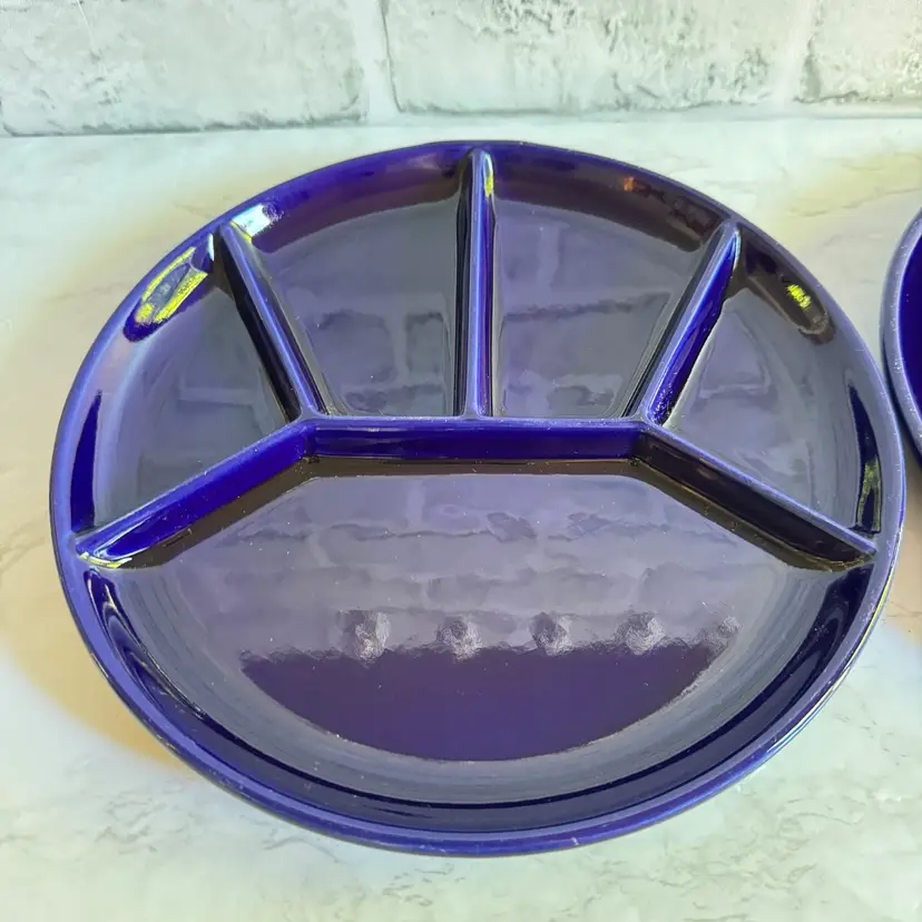 These vintage Gerz cobalt blue fondue plates from West Germany are a rare find for collectors of retro kitchenware. Made of stoneware/ ceramic, these round divided plates have a nostalgic charm perfect for parties or all occasions. With a diameter of 8-5/8”, these fondue plates feature a classic design that adds a touch of 1960s/70s style to any dining experience. The cobalt blue color and vintage pattern make them a unique and eye-catching addition to any table setting.