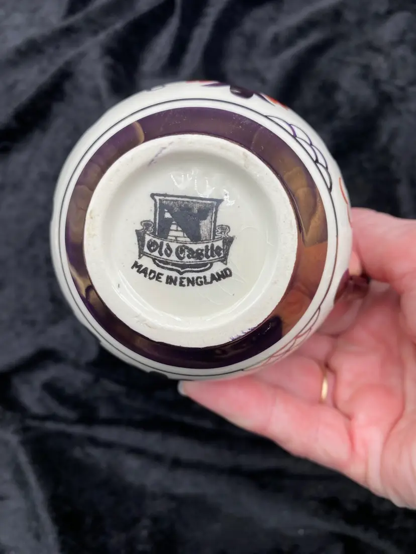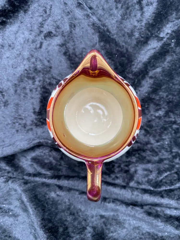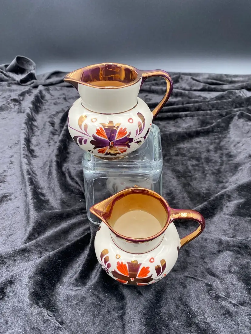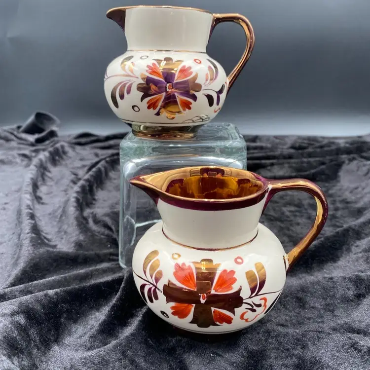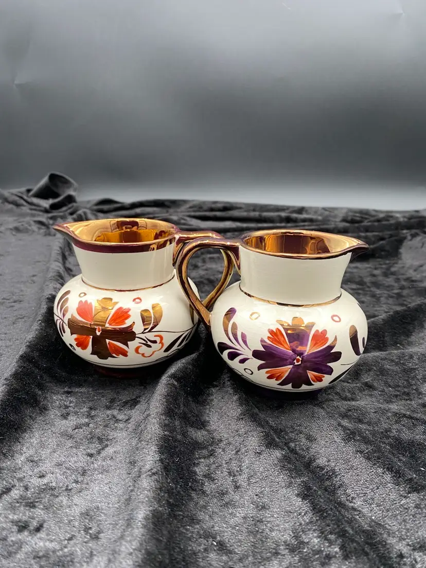 This beautiful pair of vintage jugs/creamers from Old Castle Pottery (the American stamp used by Gray's Pottery) is a must-have for any mid-century modern collector. The bronze copper lustre with red carmine floral pattern make these pieces truly special. Crafted in Stoke-on-Trent, England in 1941, these creamers are 3.75 inches long, 3 inches tall, and 3.25 inches wide. They weigh 10 ounces as a pair and have a printed backstamp. The A7565 product line and glossy finish add to their originality and appeal.