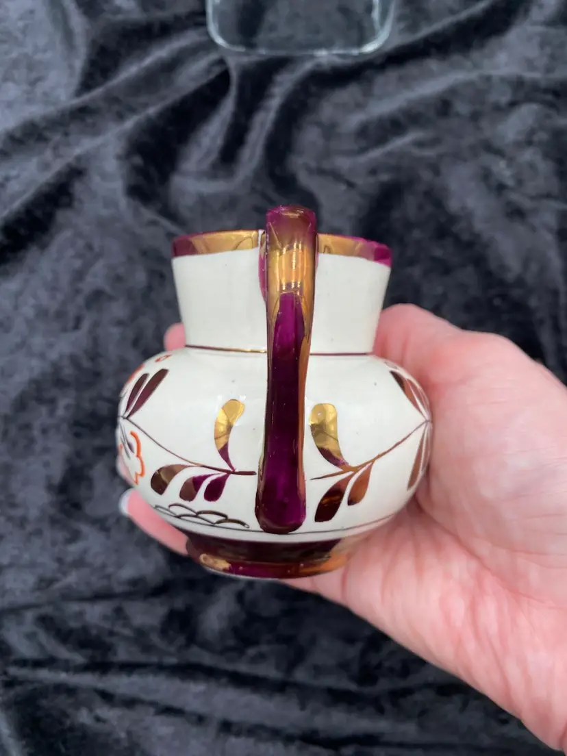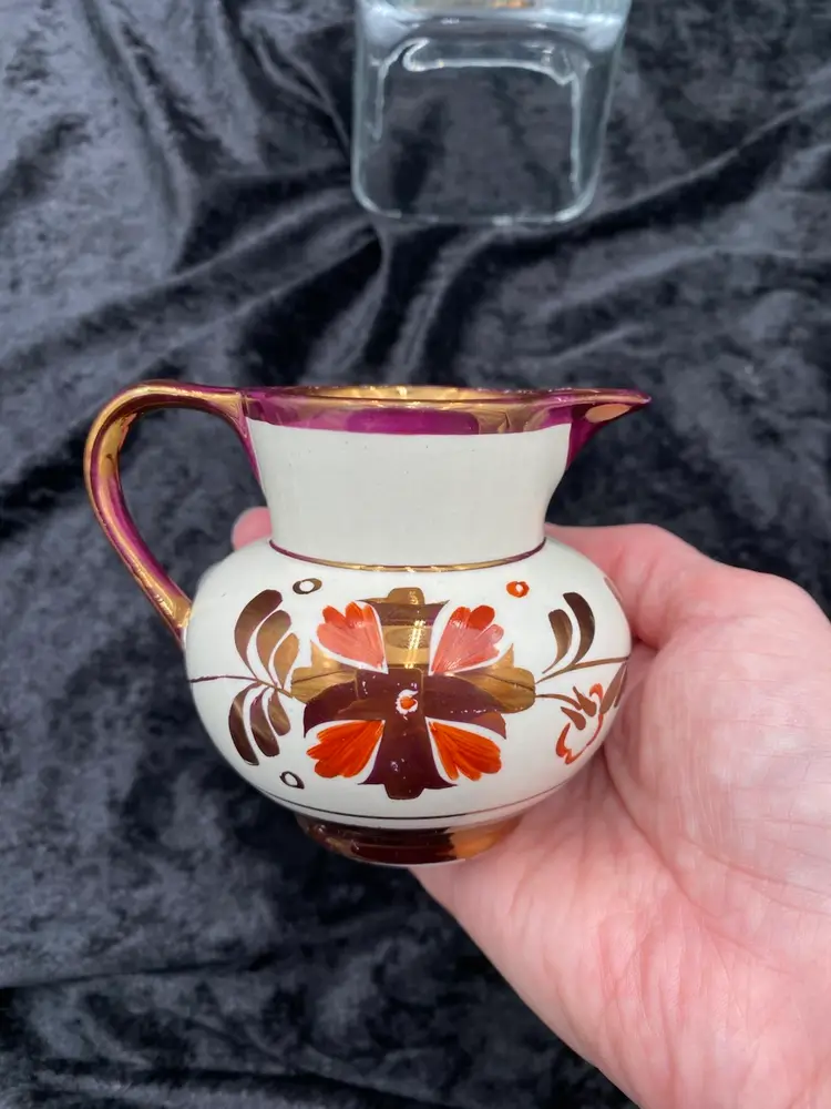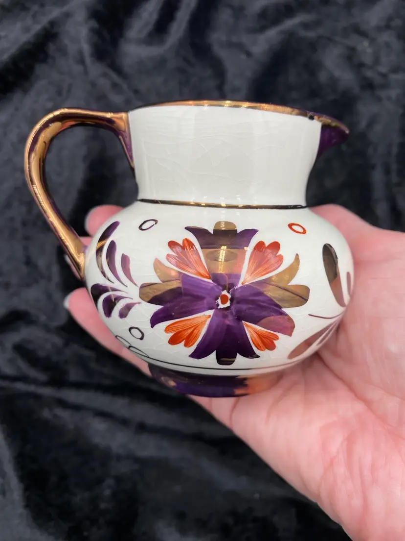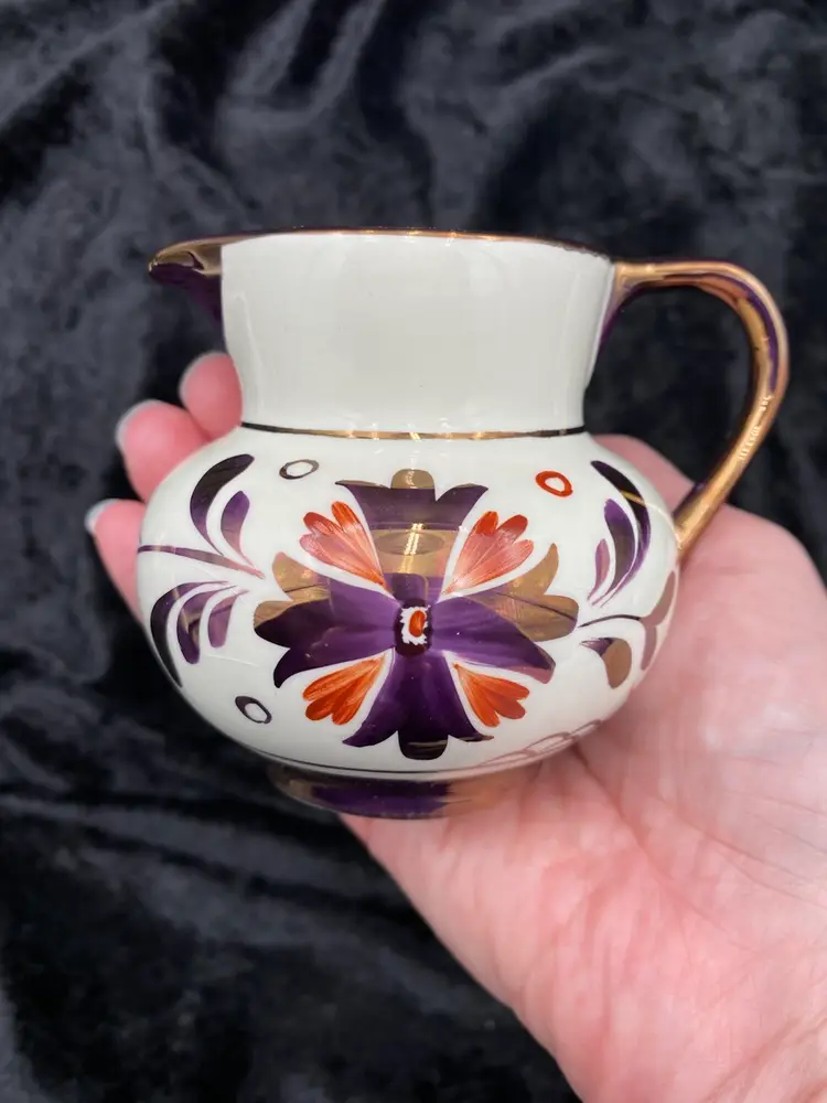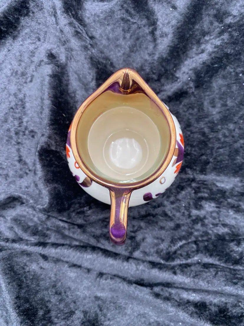 This beautiful pair of vintage jugs/creamers from Old Castle Pottery (the American stamp used by Gray's Pottery) is a must-have for any mid-century modern collector. The bronze copper lustre with red carmine floral pattern make these pieces truly special. Crafted in Stoke-on-Trent, England in 1941, these creamers are 3.75 inches long, 3 inches tall, and 3.25 inches wide. They weigh 10 ounces as a pair and have a printed backstamp. The A7565 product line and glossy finish add to their originality and appeal.
