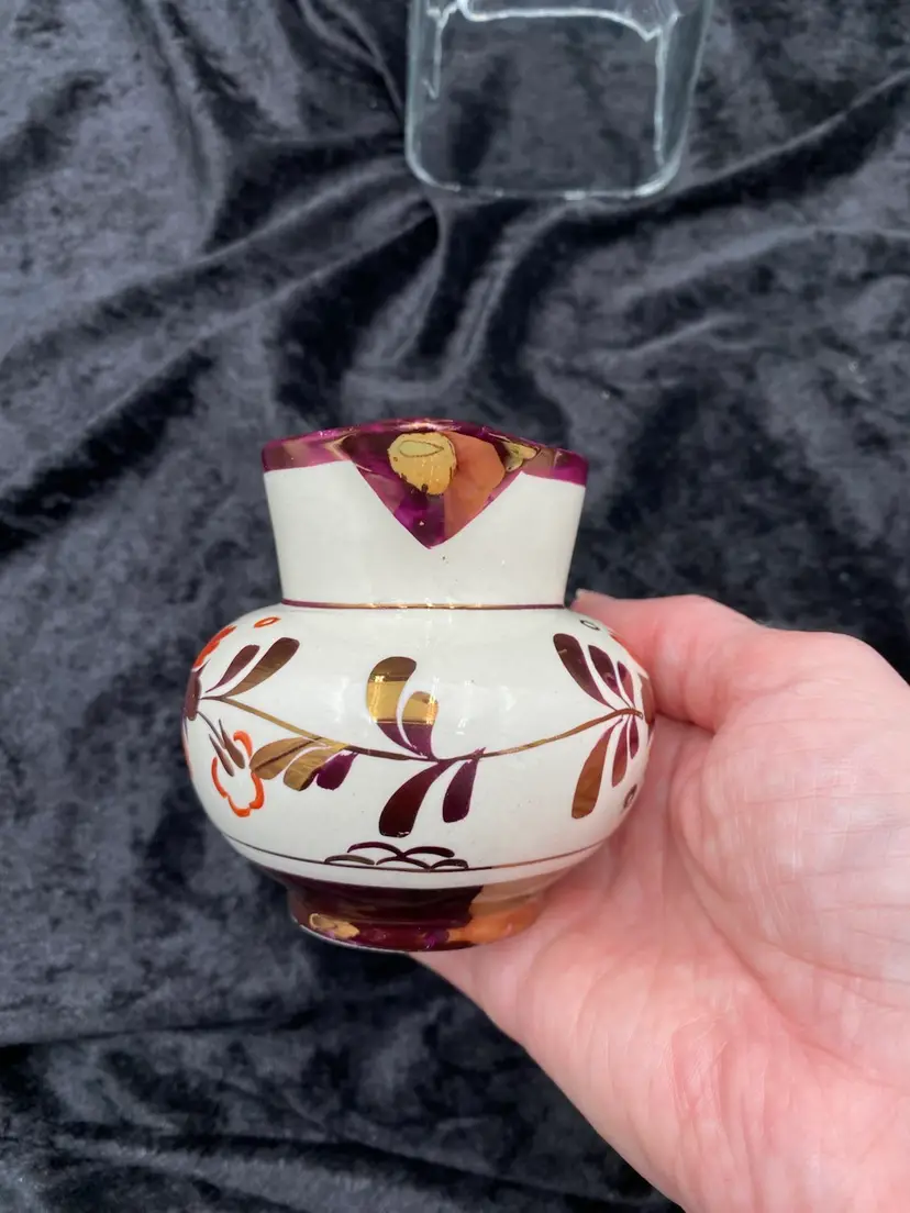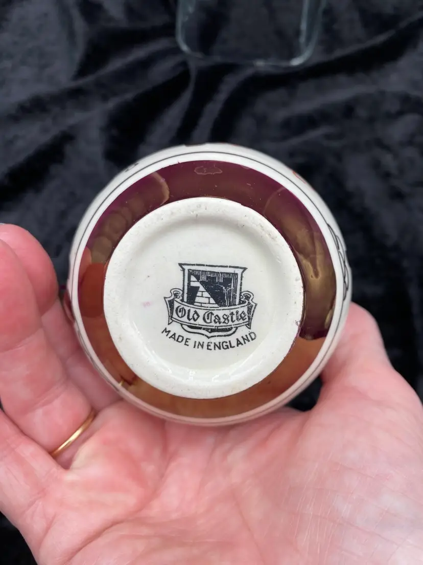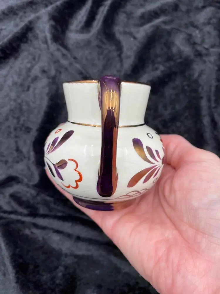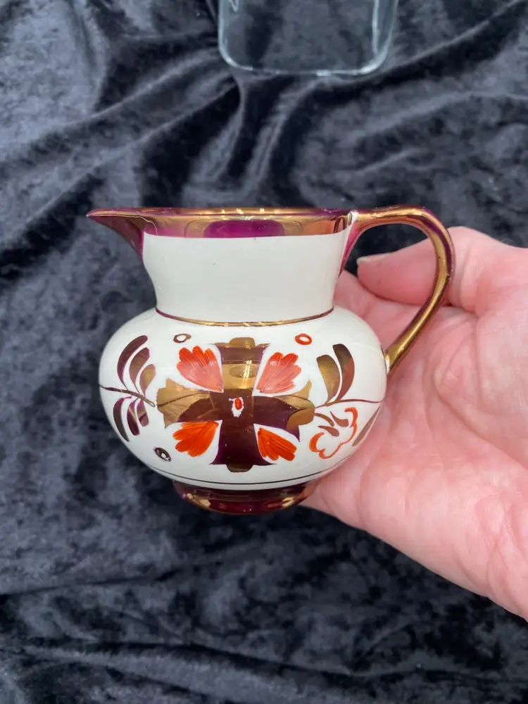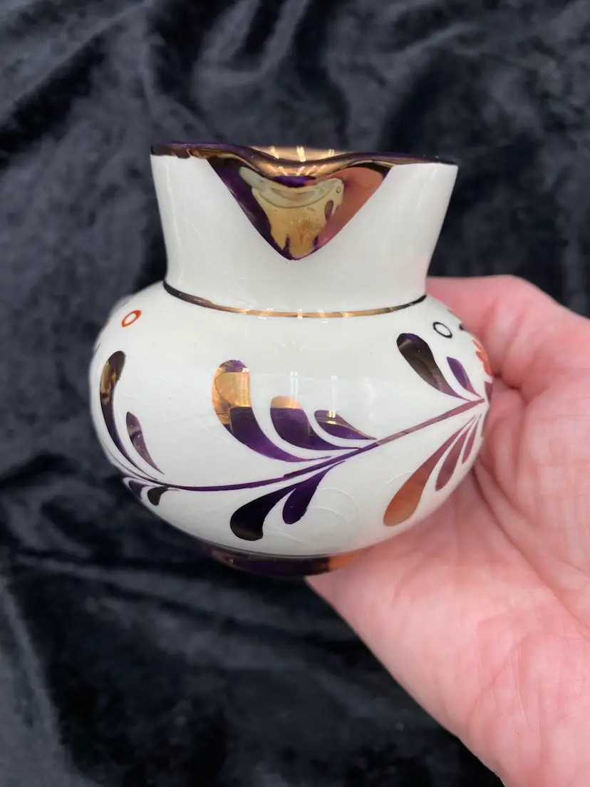 This beautiful pair of vintage jugs/creamers from Old Castle Pottery (the American stamp used by Gray's Pottery) is a must-have for any mid-century modern collector. The bronze copper lustre with red carmine floral pattern make these pieces truly special. Crafted in Stoke-on-Trent, England in 1941, these creamers are 3.75 inches long, 3 inches tall, and 3.25 inches wide. They weigh 10 ounces as a pair and have a printed backstamp. The A7565 product line and glossy finish add to their originality and appeal.
