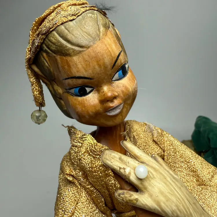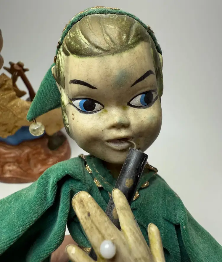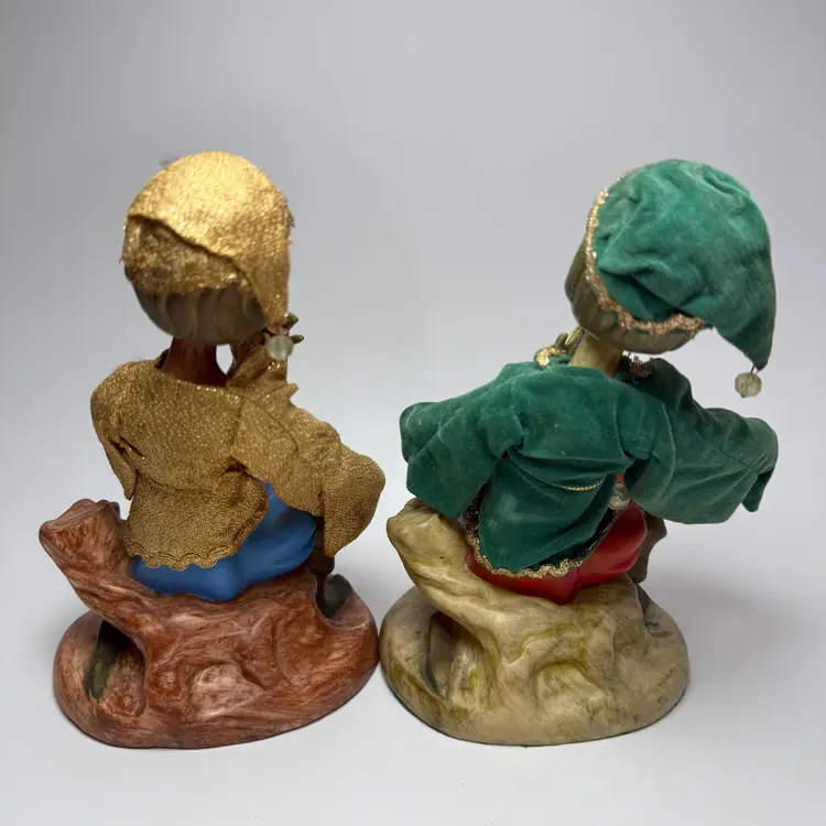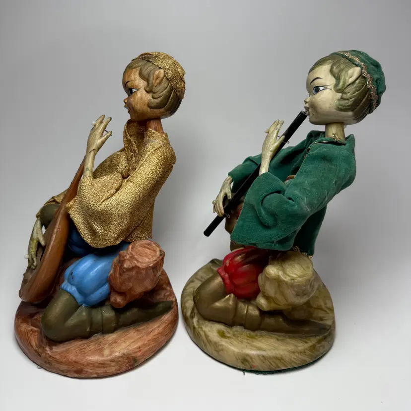 Pair Vintage MCM 9" Pixie Elf Nymphs Musician Figurines Dolls Hollywood Regency. Hard plastic or rubber with fabric clothing. Mid century modern. 9" tall x 5.5" diameter base. Good vintage condition with light wear consistent with age. Probably produced in the 1960's in Hong Kong.