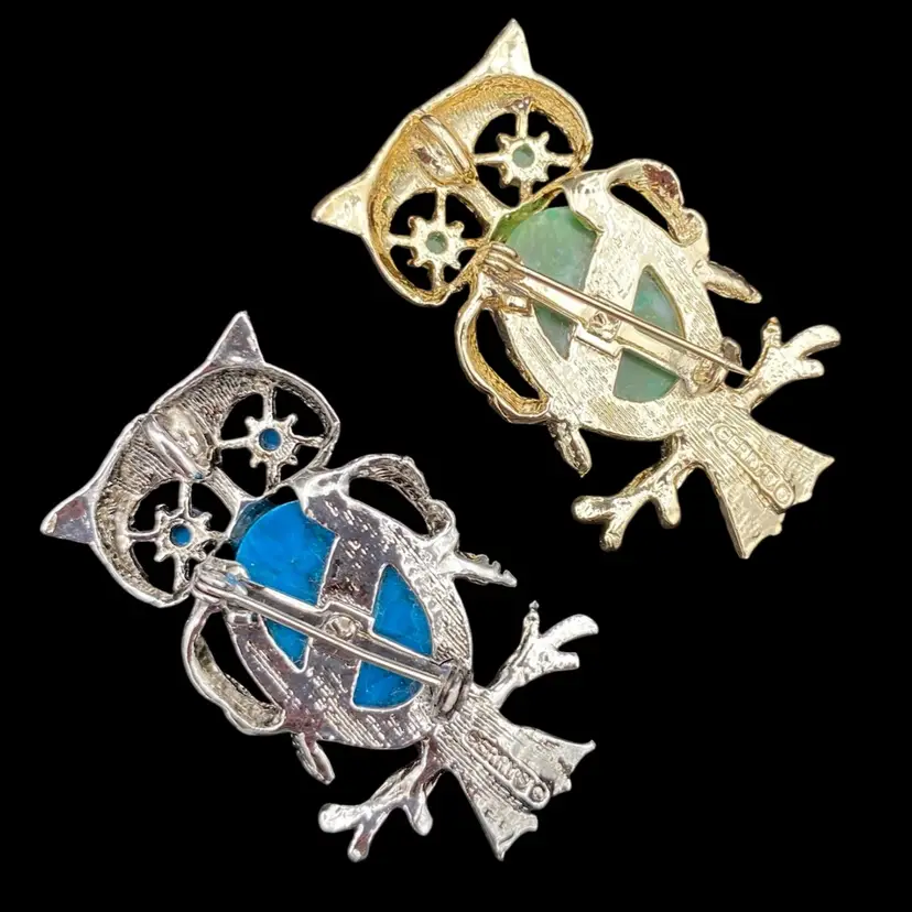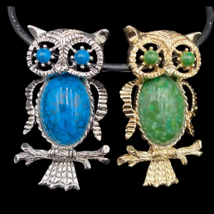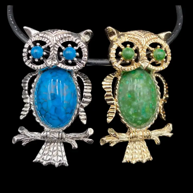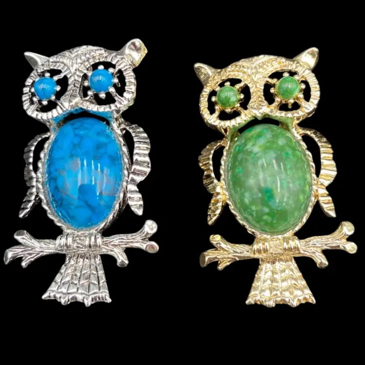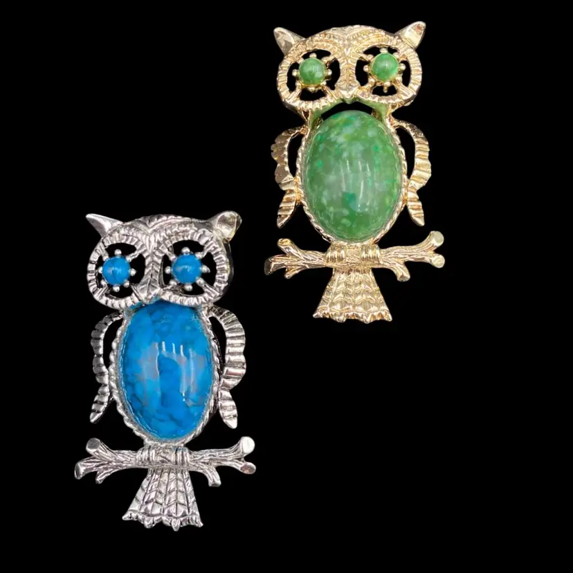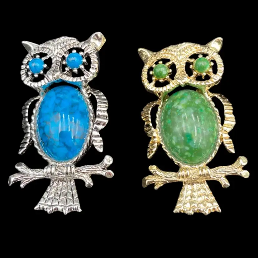 There are three cabochon-shaped gemstones in each owl. The silver-colored owl contains the turquoise stones and the gold-colored owl contains the green marble stones. The pieces were made in the United States and are a cool vintage addition to any jewelry collection. Gerry's Jewelry was founded in the early 1950s by Geraldine Giles. The company closed in the mid-90s. I believe these pieces come from the late 1950s-1960s.