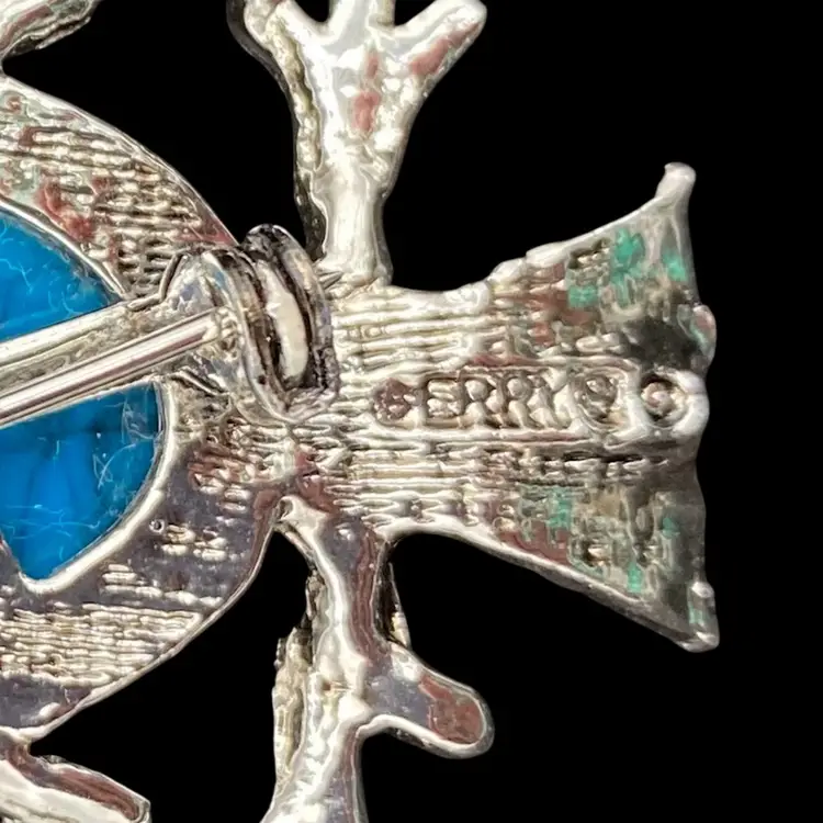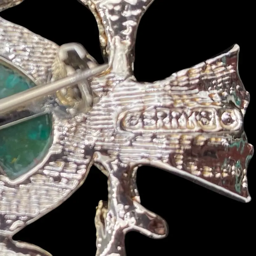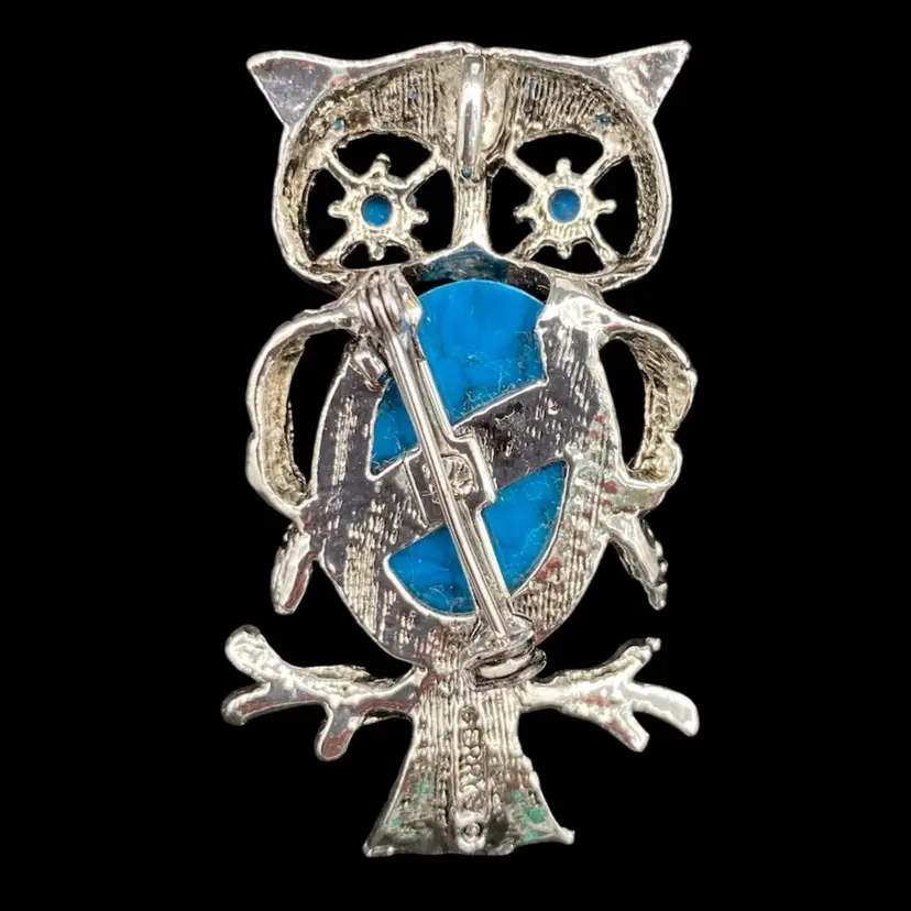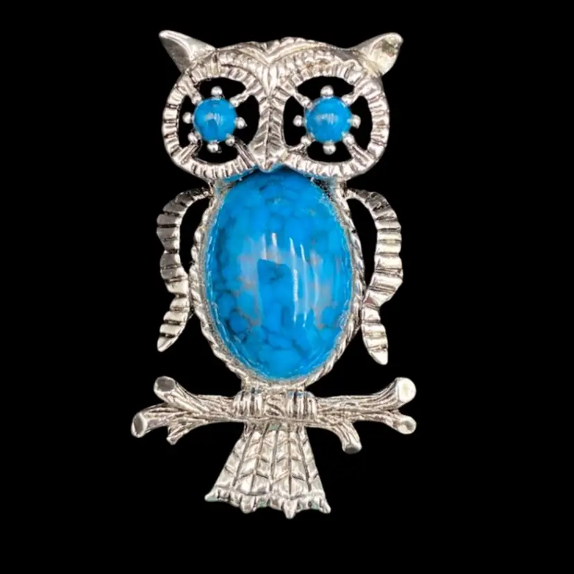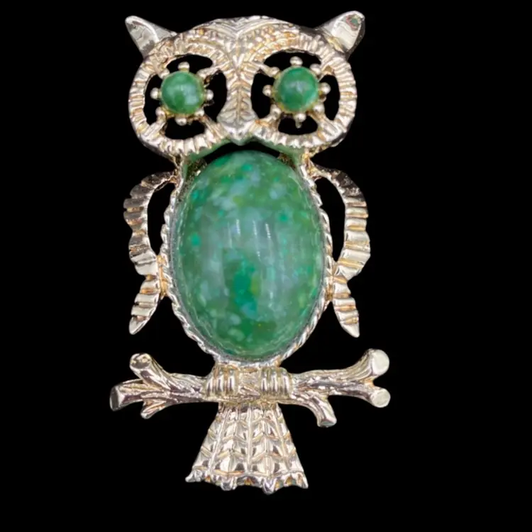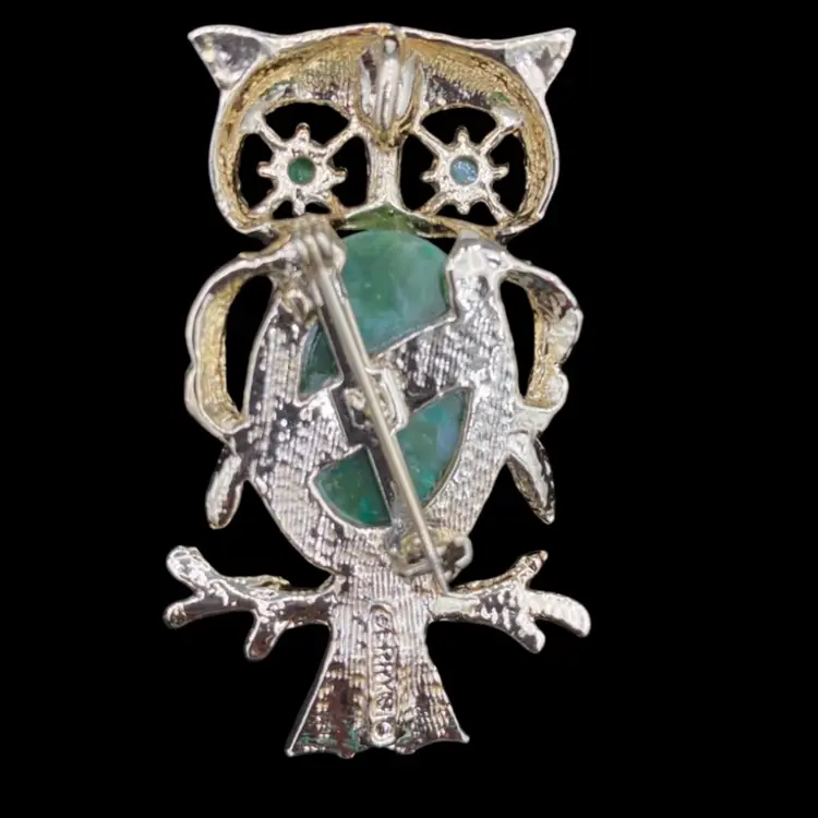 There are three cabochon-shaped gemstones in each owl. The silver-colored owl contains the turquoise stones and the gold-colored owl contains the green marble stones. The pieces were made in the United States and are a cool vintage addition to any jewelry collection. Gerry's Jewelry was founded in the early 1950s by Geraldine Giles. The company closed in the mid-90s. I believe these pieces come from the late 1950s-1960s.