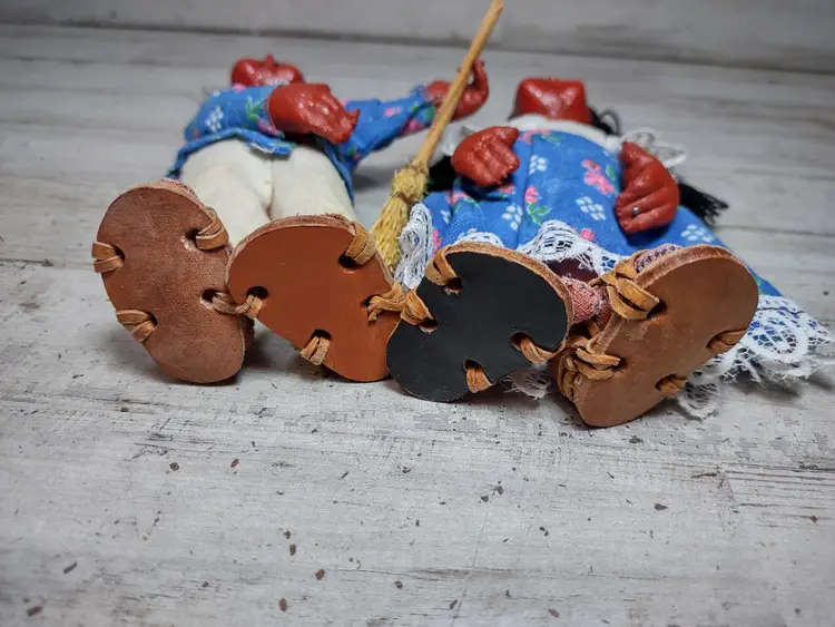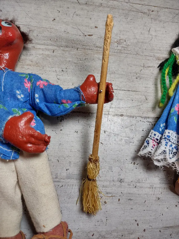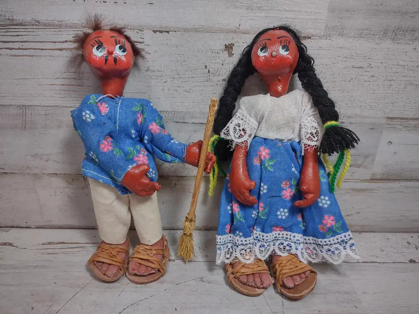 Used vintage condition with age related wear. Man appears to be missing a hat or part of his hair. Woman has nose broken off and a large crack in one arm that causes it to dangle at her side. Dolls measure approximately 7" tall. See photos for more detail.