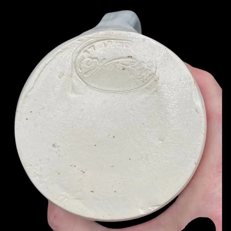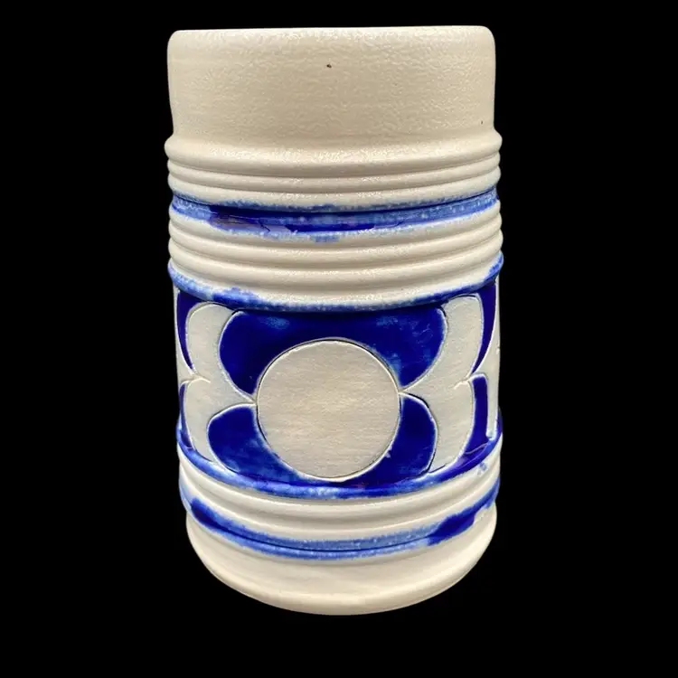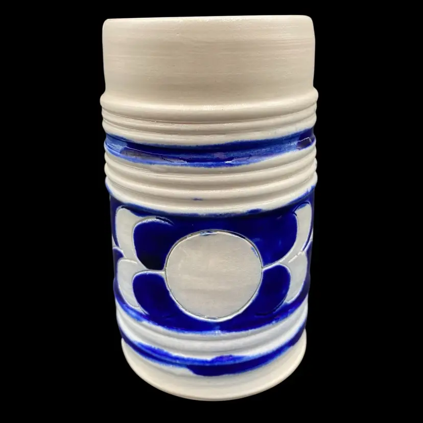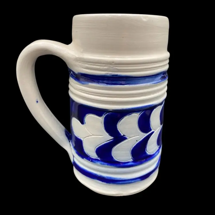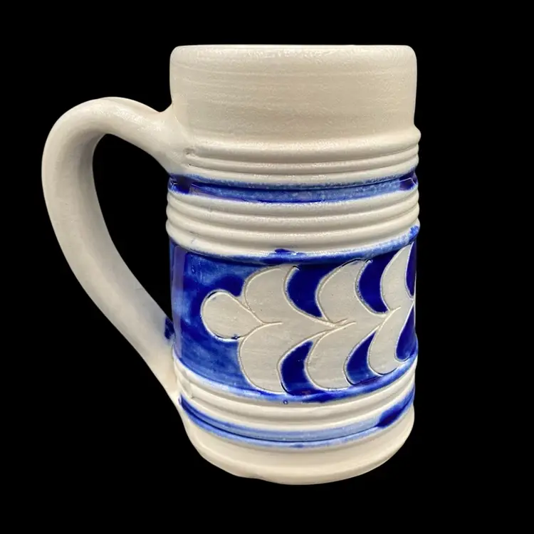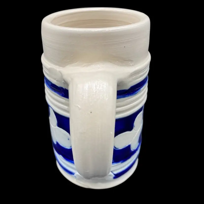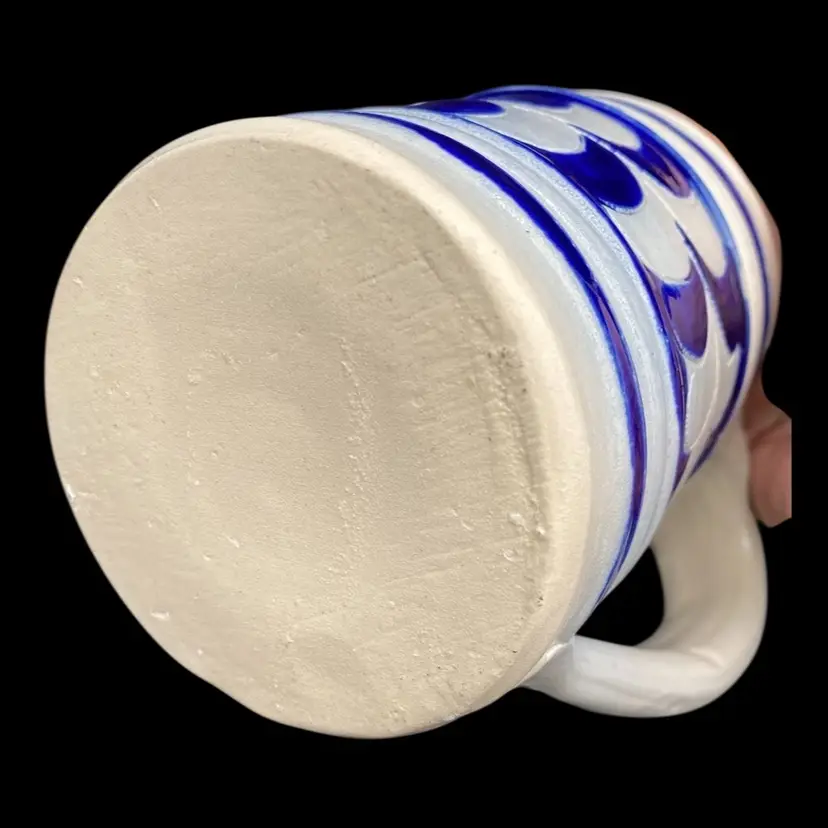 This pair of vintage Williamsburg Pottery mugs are a nice addition to any collection. With a vibrant royal blue color on stoneware, these mugs feature an arch pattern and a handle for easy grip. Perfect for all occasions, these 5.5" tall mugs are handmade and have an art pottery production style. The backstamp is impressed on one of the mugs but not the other. Another interesting observation is that one is slightly larger in diameter than the other.