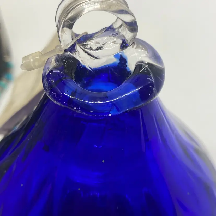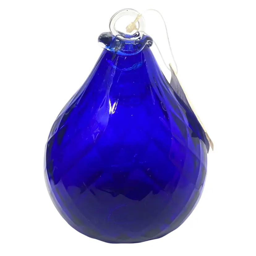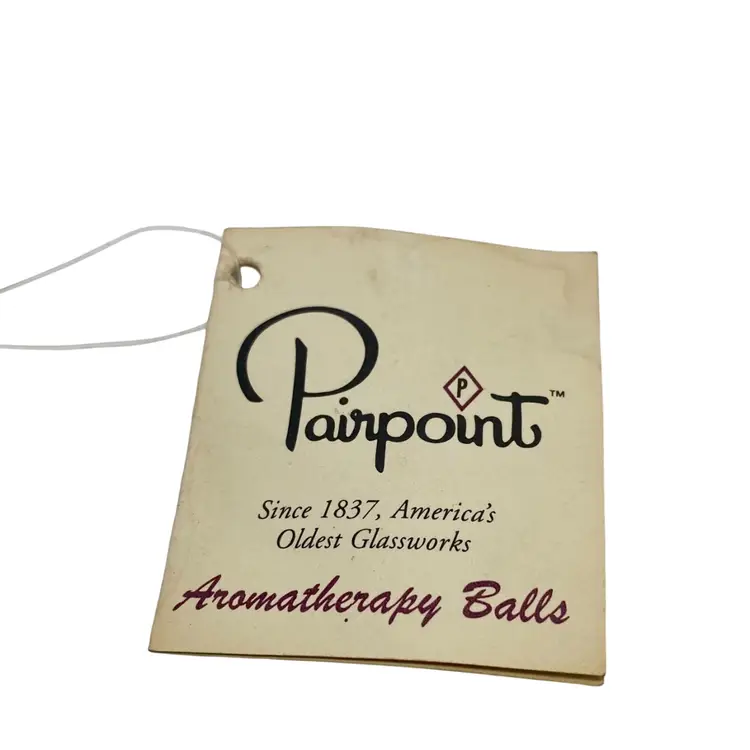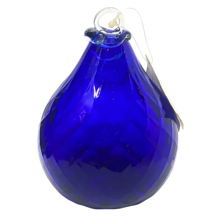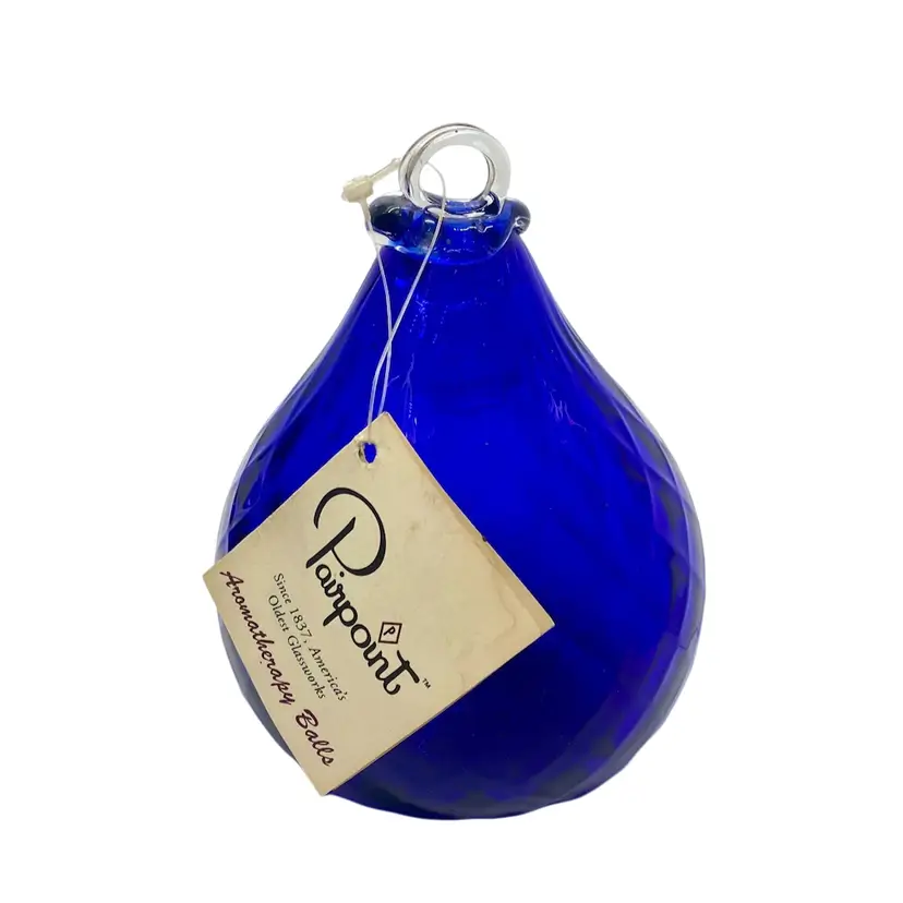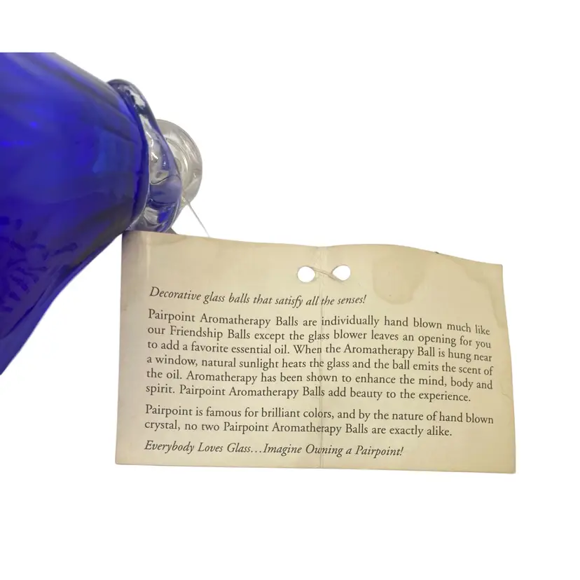 This lovely hand blown aromatherapy ball was made by Pairpoint in Cape Cod, Hand blown by skilled artisans. It is a beautiful cobalt blue with a diamond or waffle pattern. There is a reservoir in the top for essential oils and when hung or put near a window the natural sunlight heats the oils to release them. The ball is in unused, great condition, and measures about 4 and 3 quarters inches tall. The tag has some staining and sticker residue.