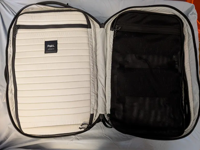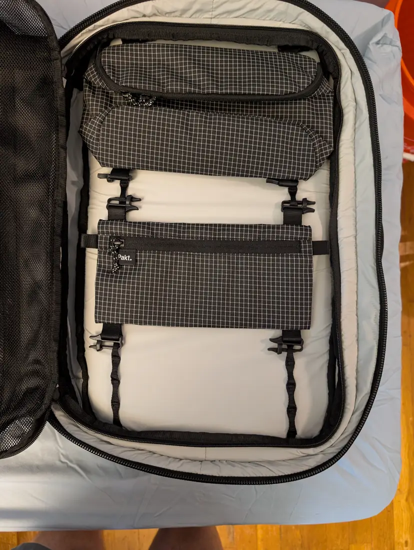 Pakt 35L Travel Backpack: The core of the system. Features a clamshell design with dual compartments for ultimate organization, a padded laptop sleeve, stowable backpack straps, and a hip belt.