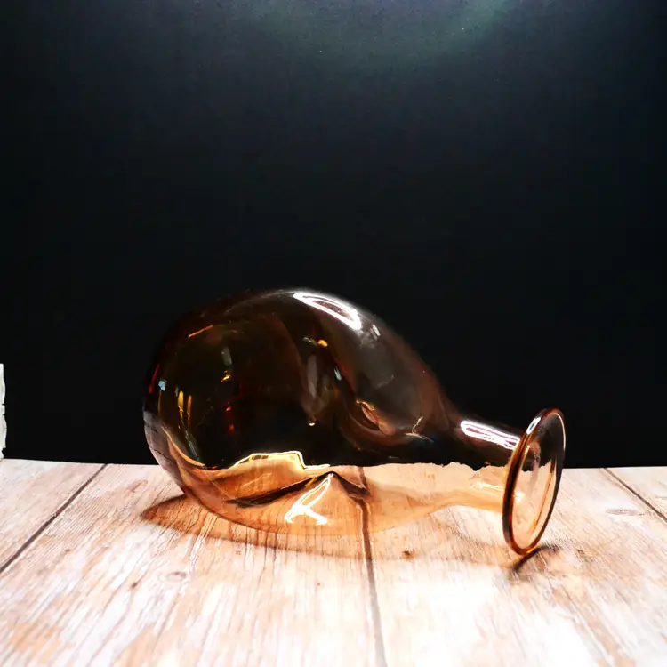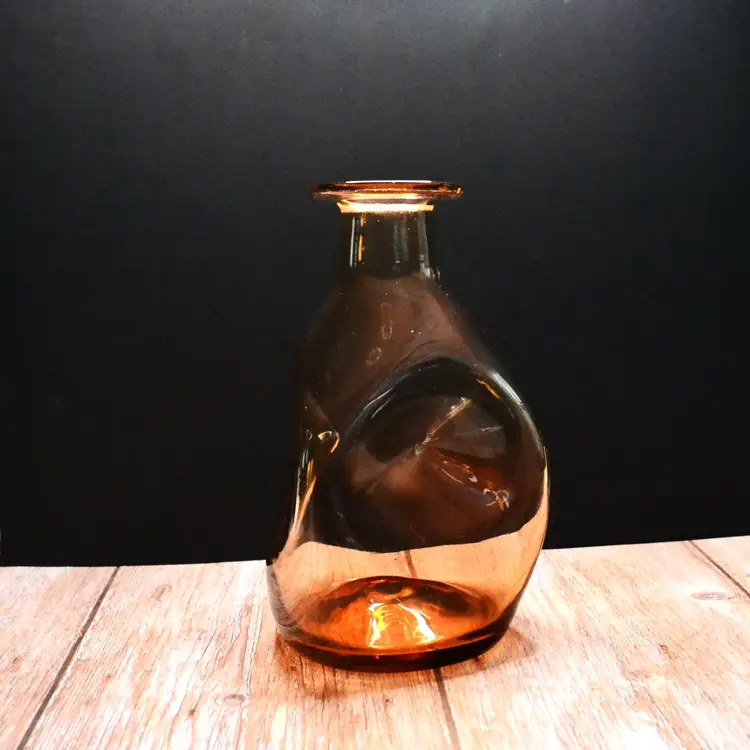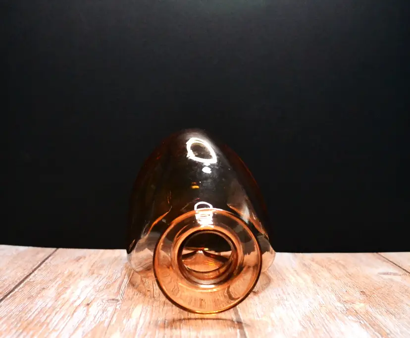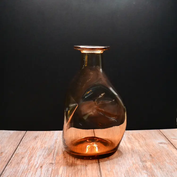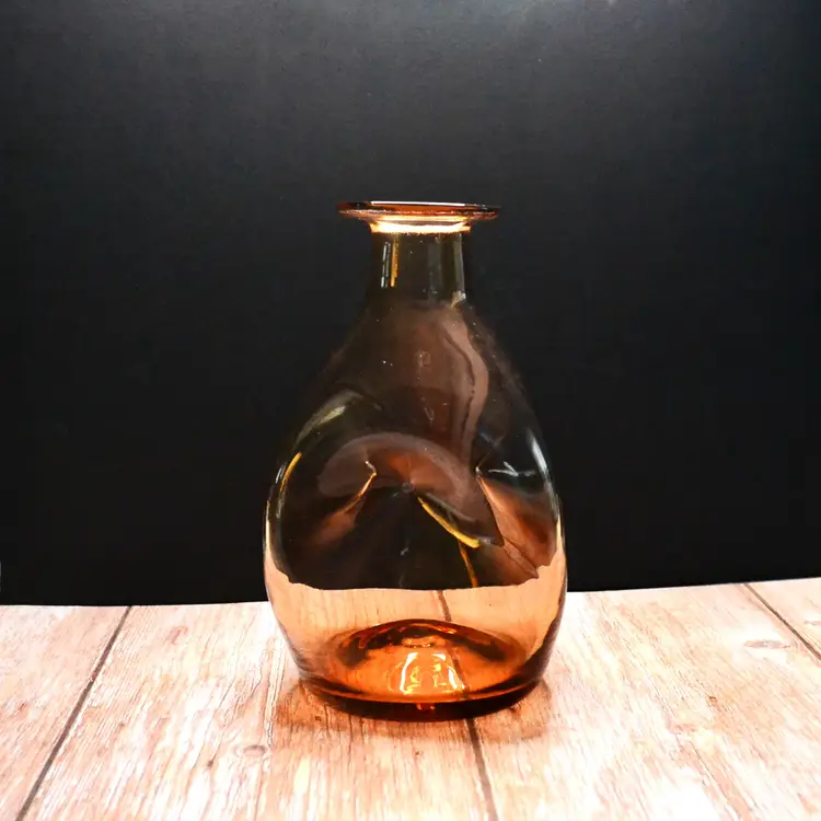 This glass pitcher has 3 indents or 'pinches" for easier holding. Done in slight amber color to blend in with your fall decor. 7 1/4 inches high.
