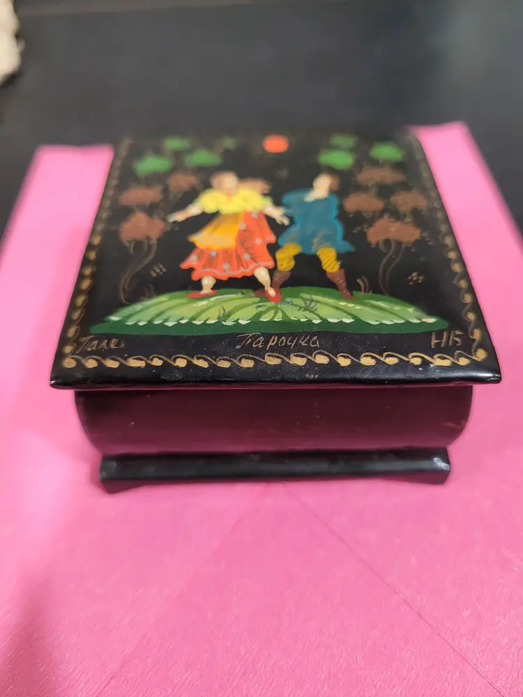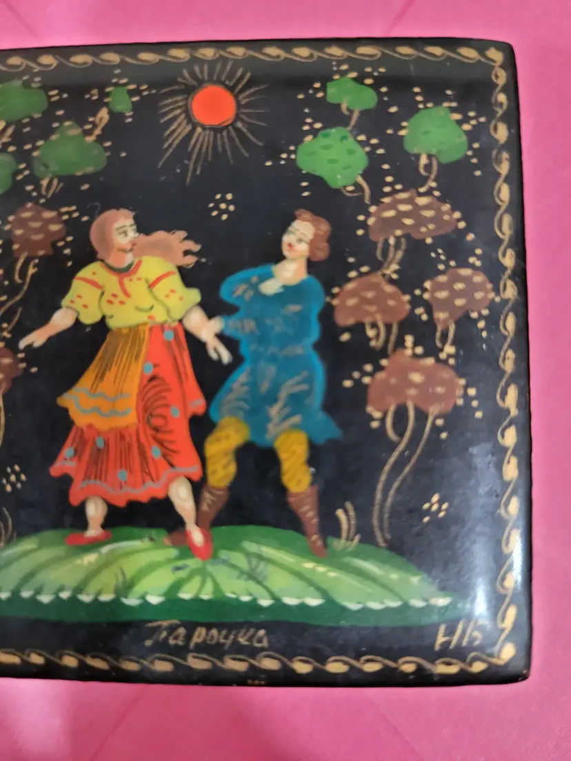 This rare find has the Russians artists initials on left, the city painted in ,Palekh, and also what looks to be the date January 2015. Depicts a couple on the front. This is a work of art, handpainted with lots of detail. Great condition. Approx 2 1/4 x 2 1/4 in.