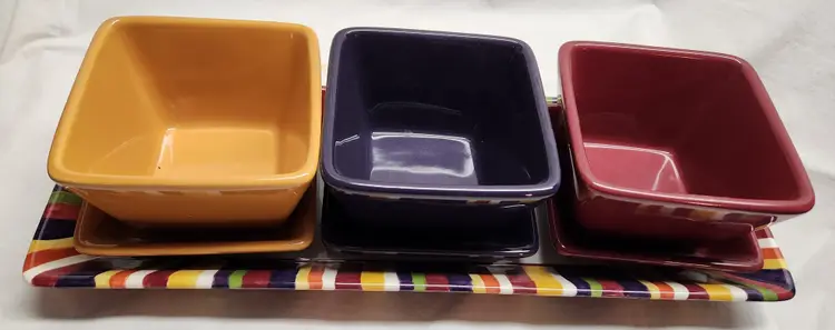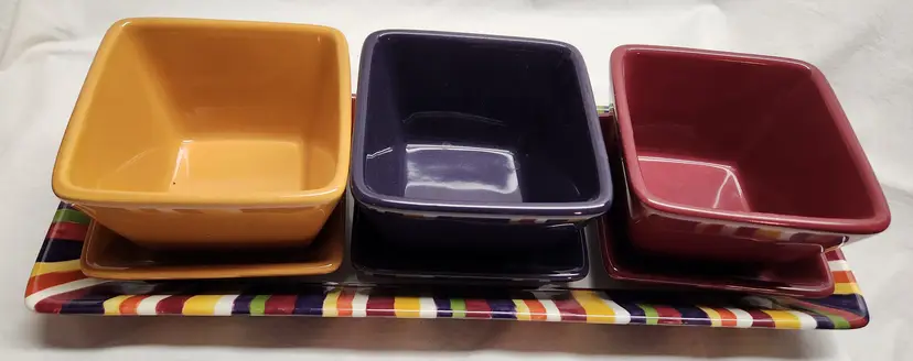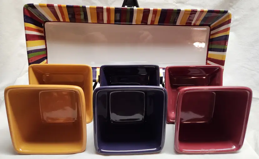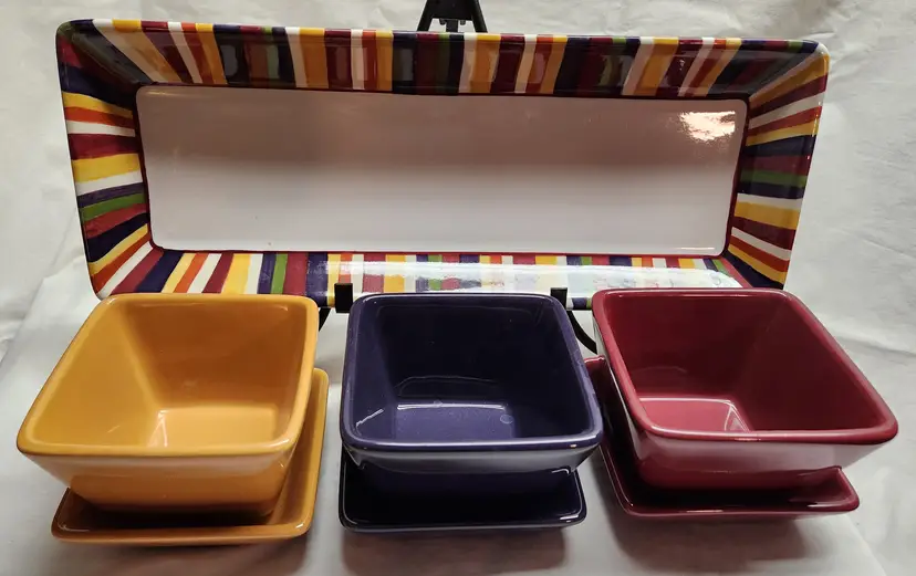 Early 2000's, 7 pieces Striped tray: 6"x16" Gold, Eggplant, Burgundy bowls: 4 1/2"x3" Coordinating plates: 4 1/2"x1 1/2"