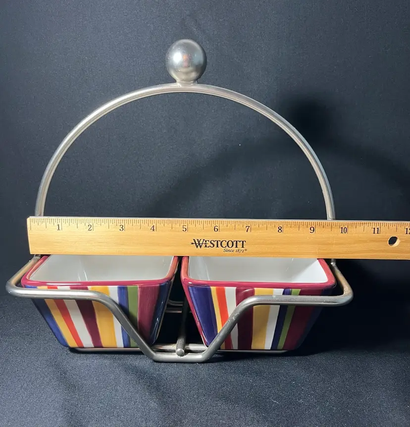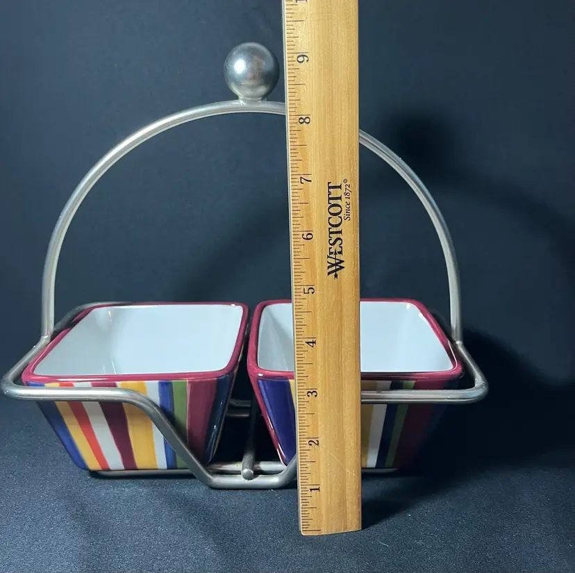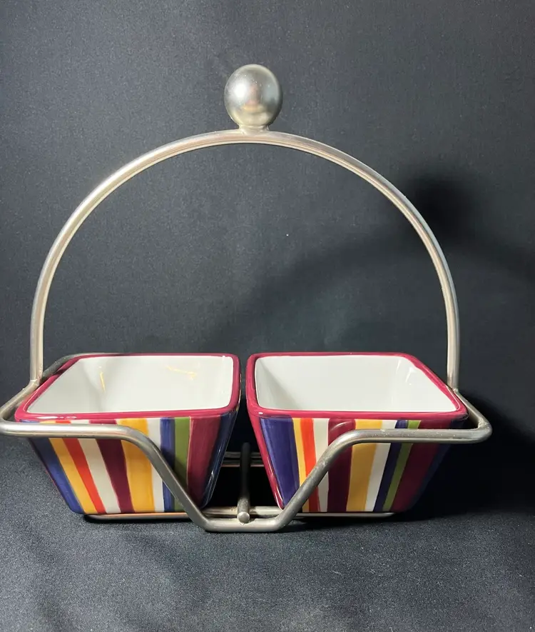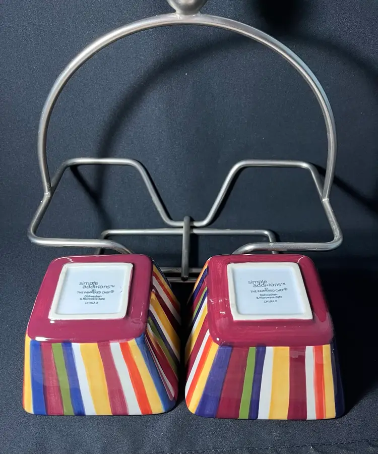 #884. Pampered Chef Simple Additions ceramic Square Striped Serving Bowls In Caddy. Measures 9.5” x 9.5”. No chips or cracks.