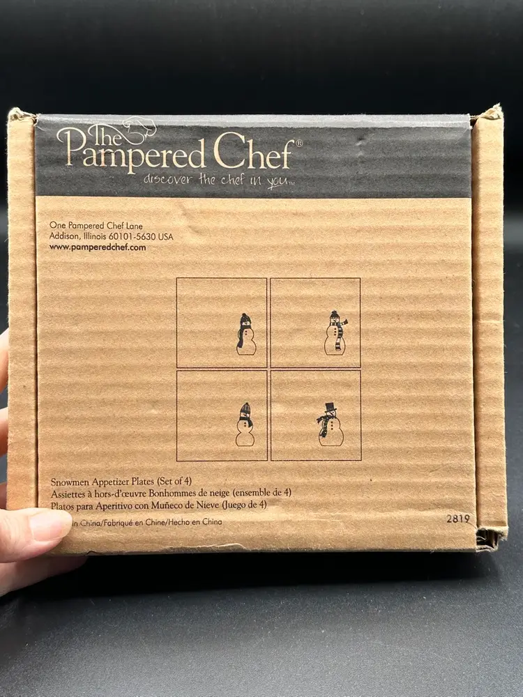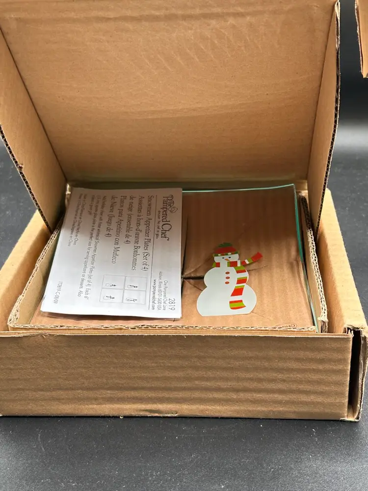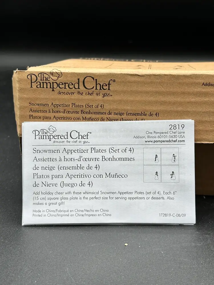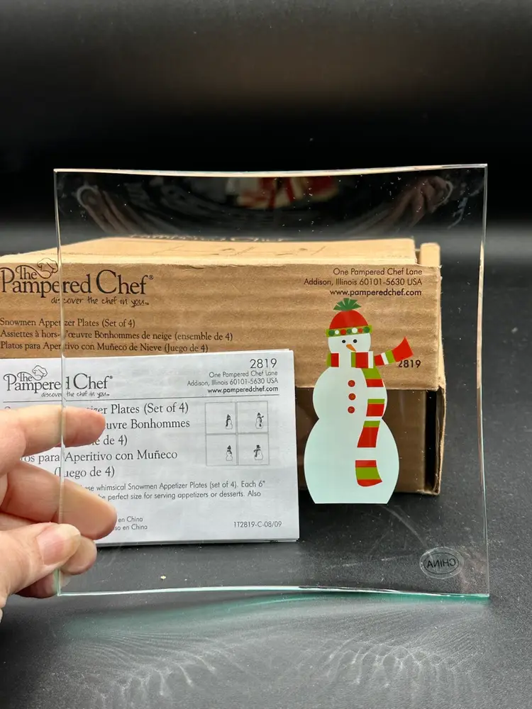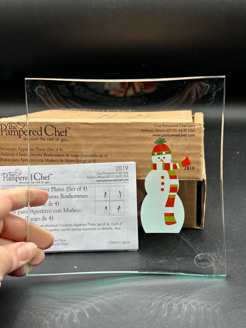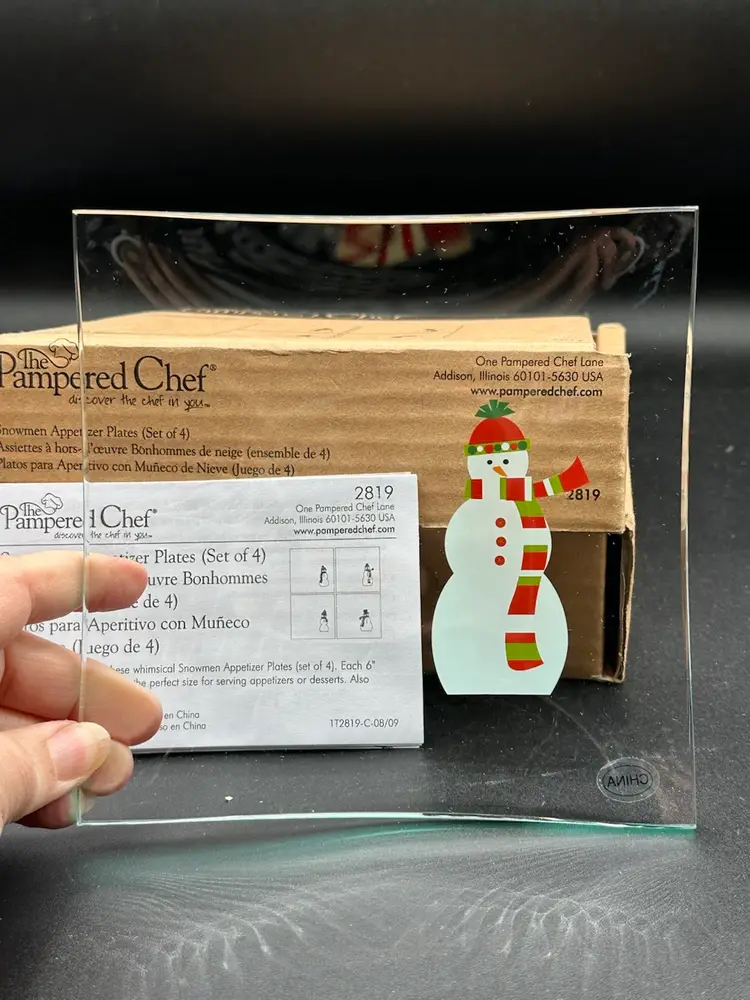 Add a festive touch to your dining table with this set of four Pampered Chef Snowmen Square Appetizer Plates. The clear glass plates feature a snowman pattern that's perfect for the Christmas season. The plates are 6 inches in diameter and made of durable glass material.