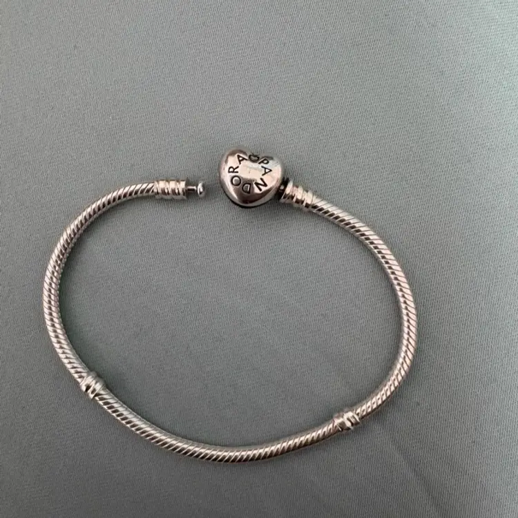 Authentic 925 sterling silver Pandora bracelet from the Moments collection. Features the classic snake chain design with a heart-shaped clasp engraved with the Pandora logo.