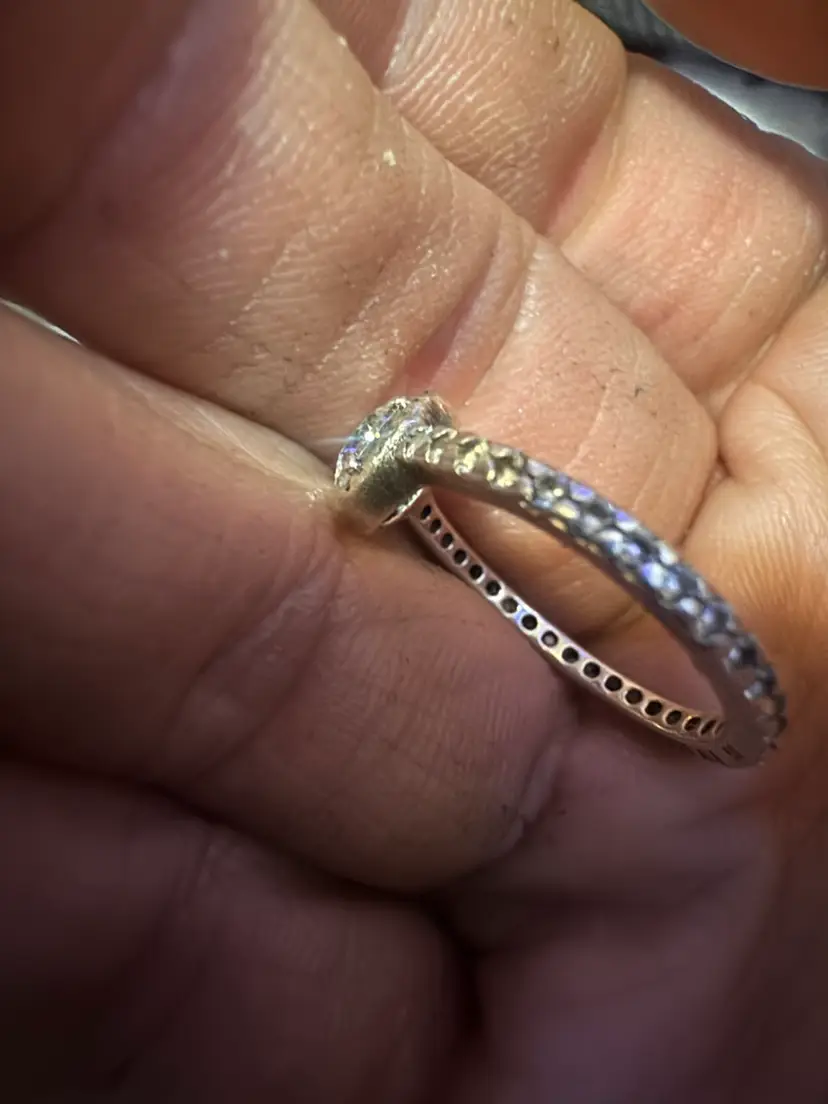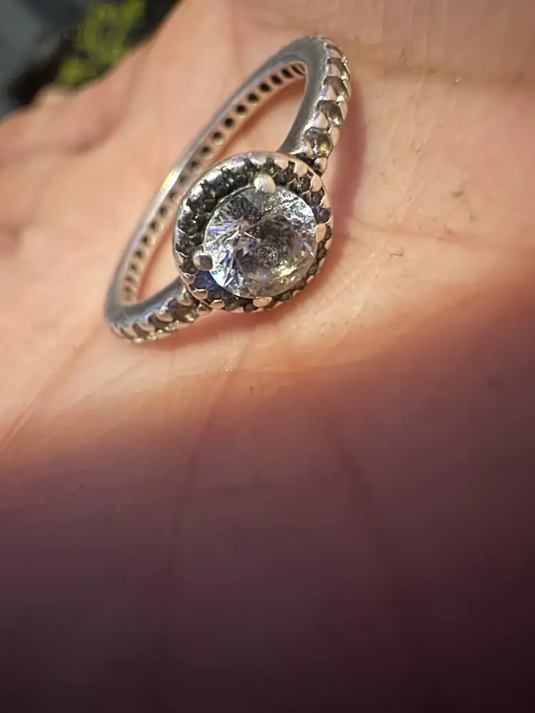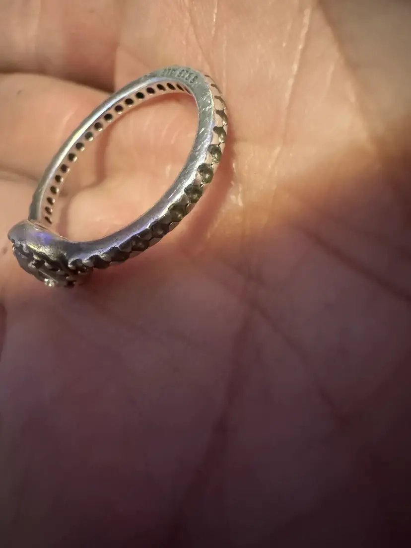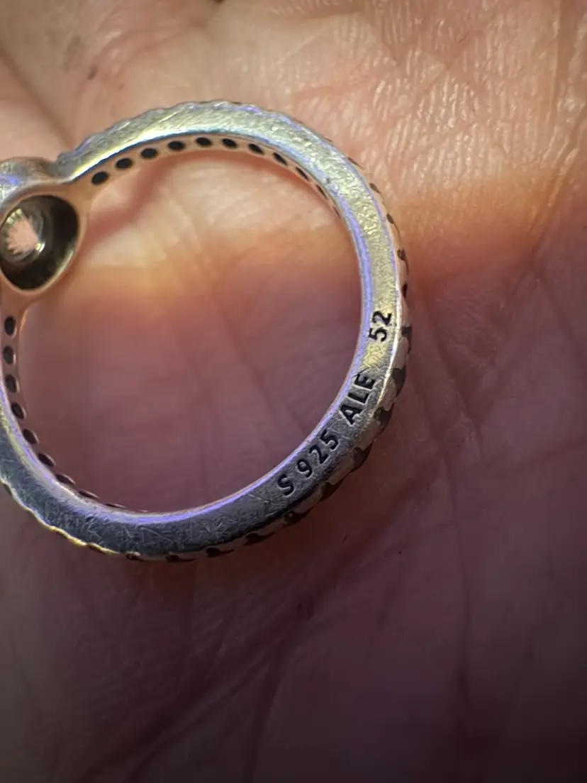 Size 52 925 ALE Sterling silver Pandora ring that just sparkle every angle you look at it. There a slight imperfection on the bottom of the ring it doesn’t compromise the integrity nor usually visible.
