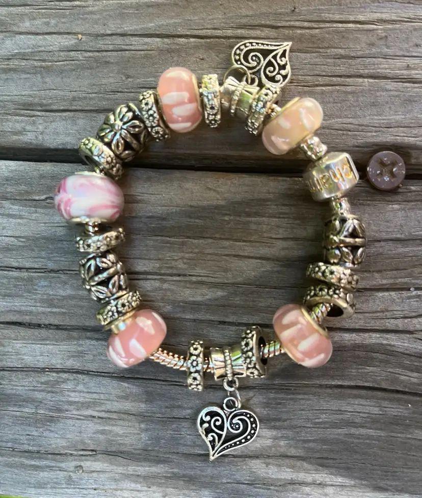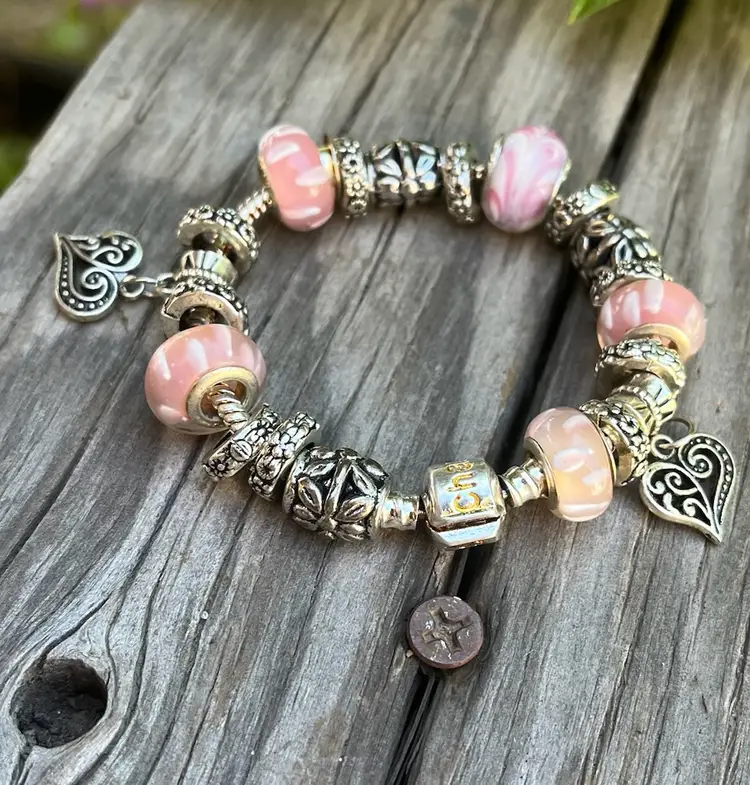 A Pandora style bracelet. Accent Hearts with Lampwork style Beads. Childs or tiny wrist. 4inch to 5 inch wrist. Pre-owned. Great condition.