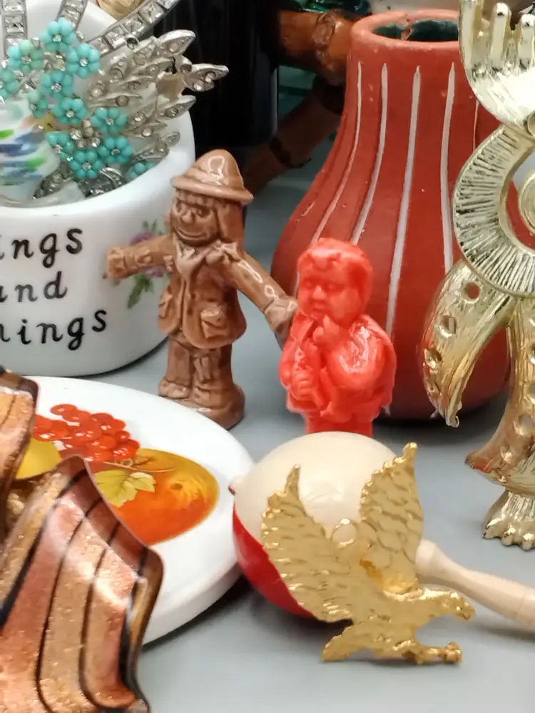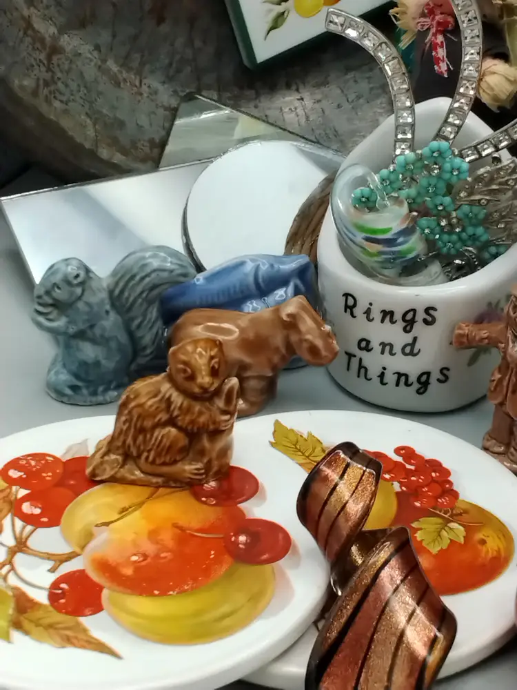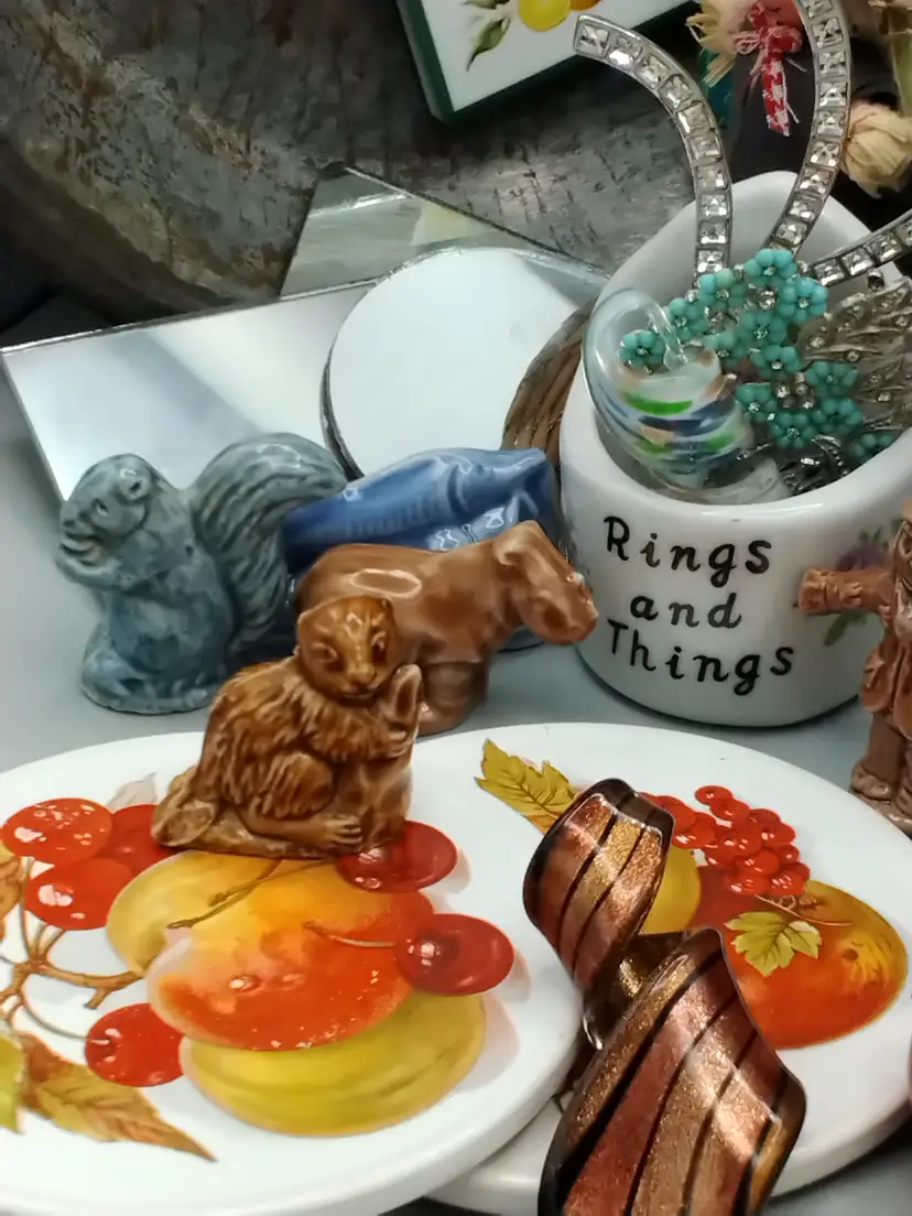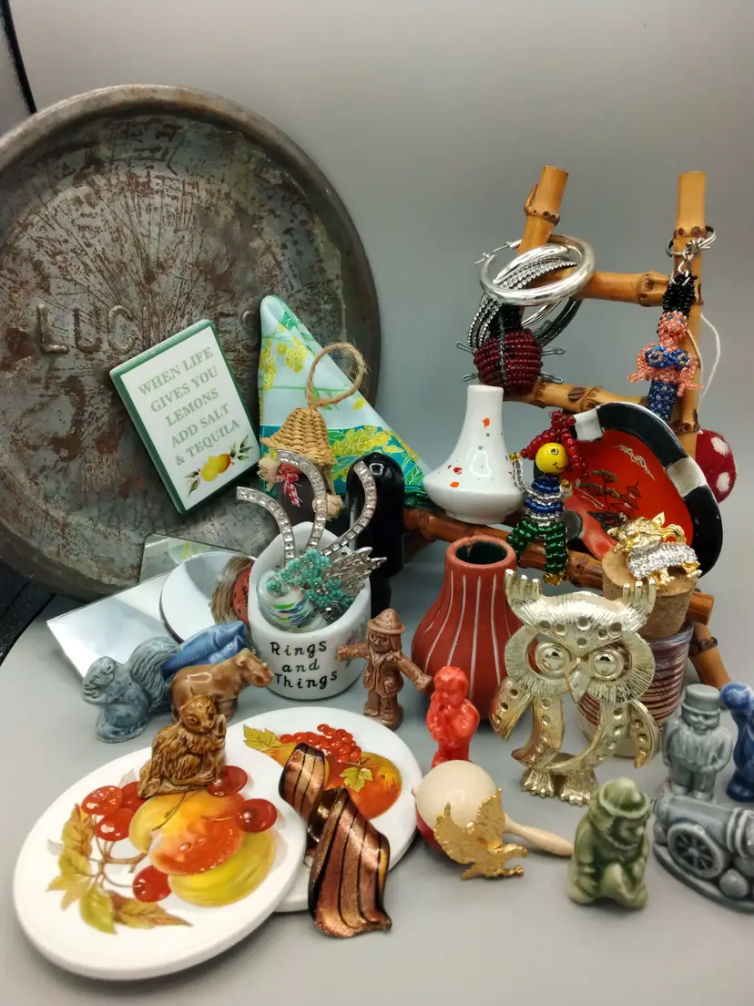 PANNING FOR TREASURE: 2lbs 2oz: $75.00 worth of reselling or Crafting value. Lucilles Pies Pie Plate two fruit and nut coasters by H&R Johnson England Gold tone owl earing holder Wade Whimsy, circus, animals, Scarecrow,Angel (11 total) Rings and things trinket holder Two small bud vases Napon ashtray Small doll rattle Beaded person, Mermaid, Ladybug keychains Jar with a Cork stopper Purple Glass bottle stopper Felted Mushroom ornament Fridge magnet Handkerchief Assorted Jewelry Three compact mirrors Halloween scarecrow