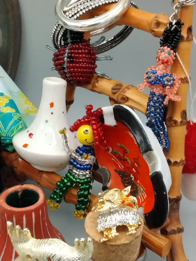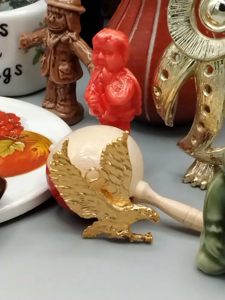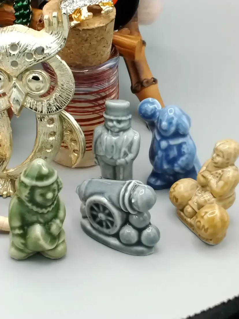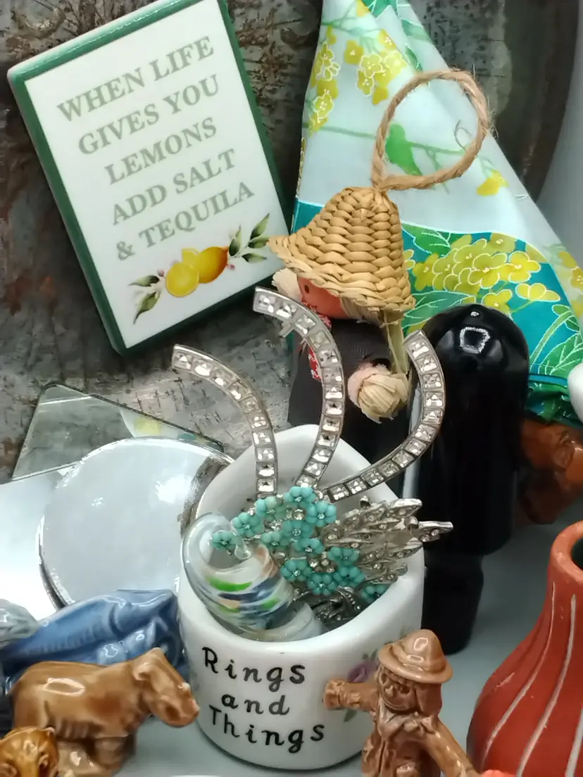 PANNING FOR TREASURE: 2lbs 2oz: $75.00 worth of reselling or Crafting value. Lucilles Pies Pie Plate two fruit and nut coasters by H&R Johnson England Gold tone owl earing holder Wade Whimsy, circus, animals, Scarecrow,Angel (11 total) Rings and things trinket holder Two small bud vases Napon ashtray Small doll rattle Beaded person, Mermaid, Ladybug keychains Jar with a Cork stopper Purple Glass bottle stopper Felted Mushroom ornament Fridge magnet Handkerchief Assorted Jewelry Three compact mirrors Halloween scarecrow