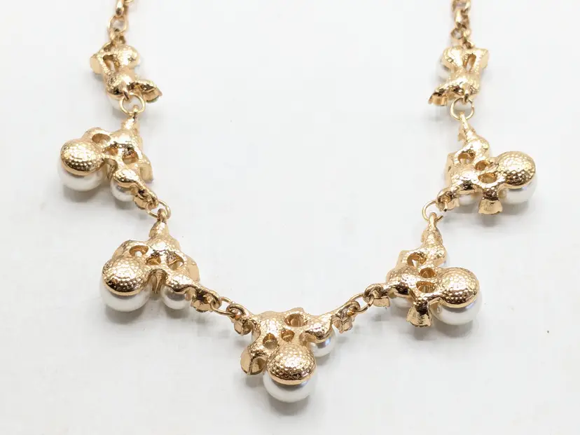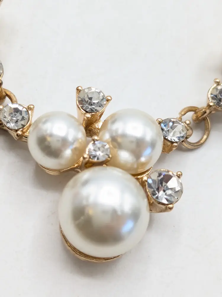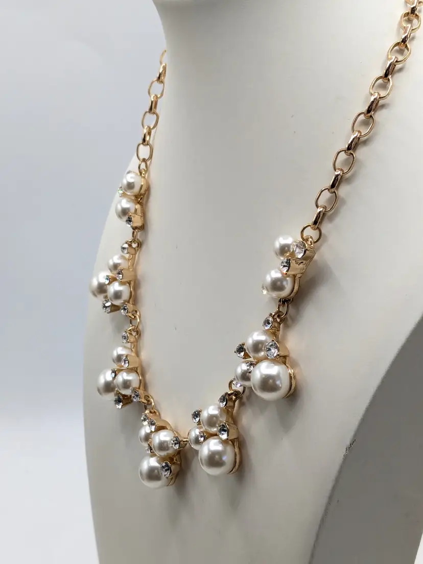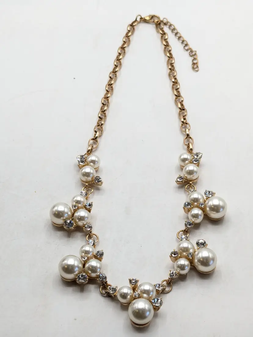 Good condition. Features elegant faux pearl clusters accented with sparkling rhinestones on a gold tone chain. Gold tone is bright and shiny with no color loss. Chain measures 17" with a 3" extender. wen