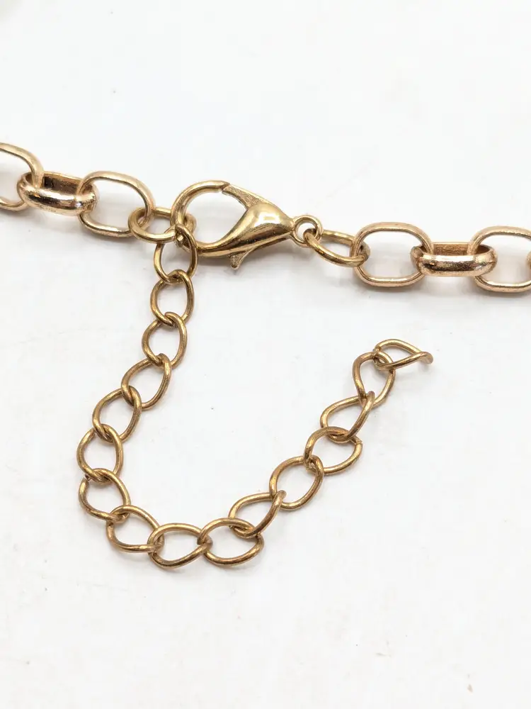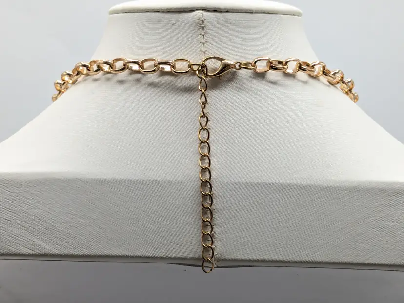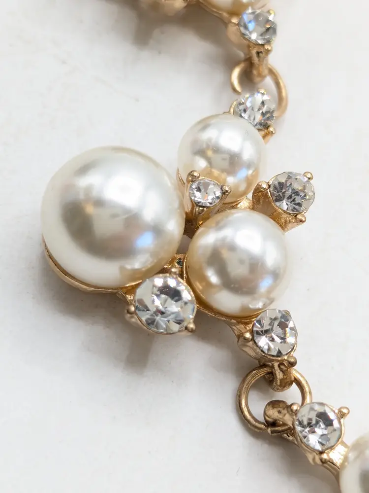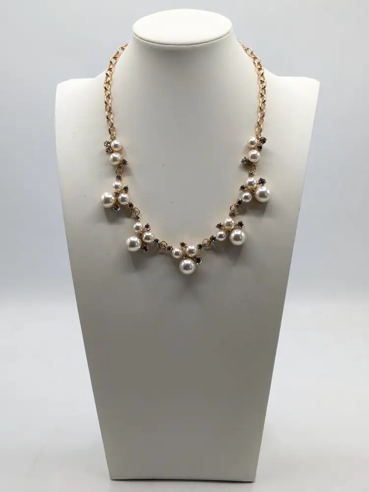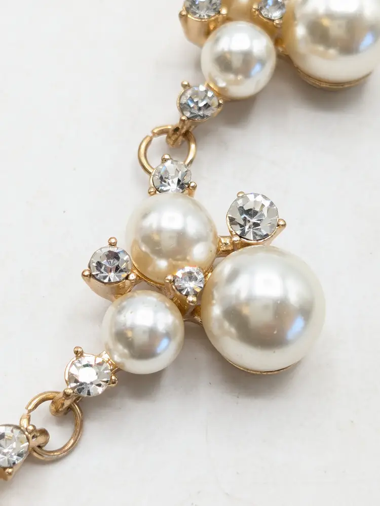 Good condition. Features elegant faux pearl clusters accented with sparkling rhinestones on a gold tone chain. Gold tone is bright and shiny with no color loss. Chain measures 17" with a 3" extender. wen