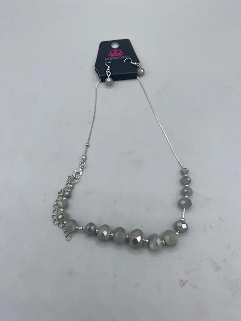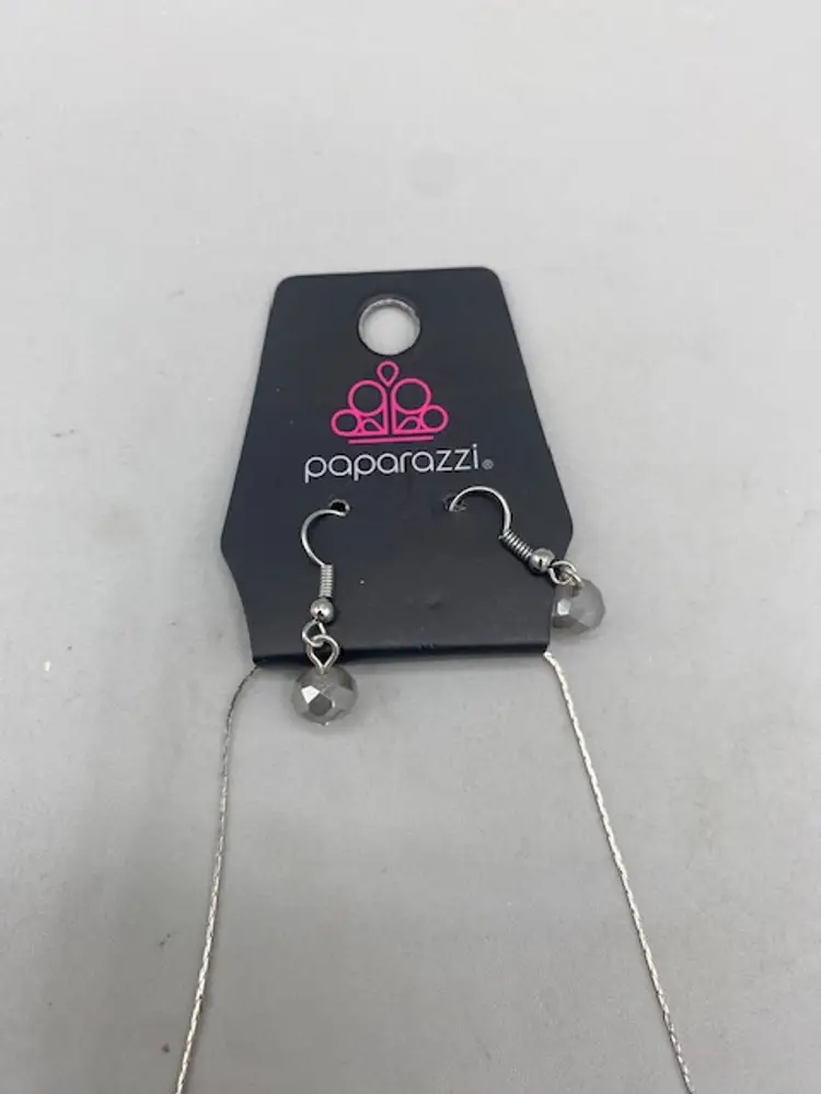 This Paparazzi iridescent crystal like necklace with matching earring is a stunning fashion jewelry set perfect for adding a touch of beauty to any outfit. The silver metal and crystal main stones give off a glamorous and elegant look, making it a versatile accessory for various occasions. The set is not antique or vintage, and is not signed or personalized, offering a timeless and classic style that can be worn for years to come. Made in China, this jewelry set is sure to make a statement with its captivating design and high-quality craftsmanship.