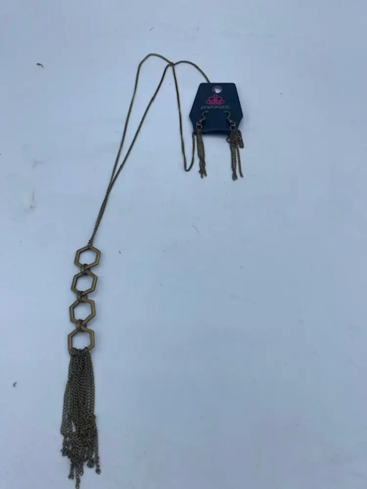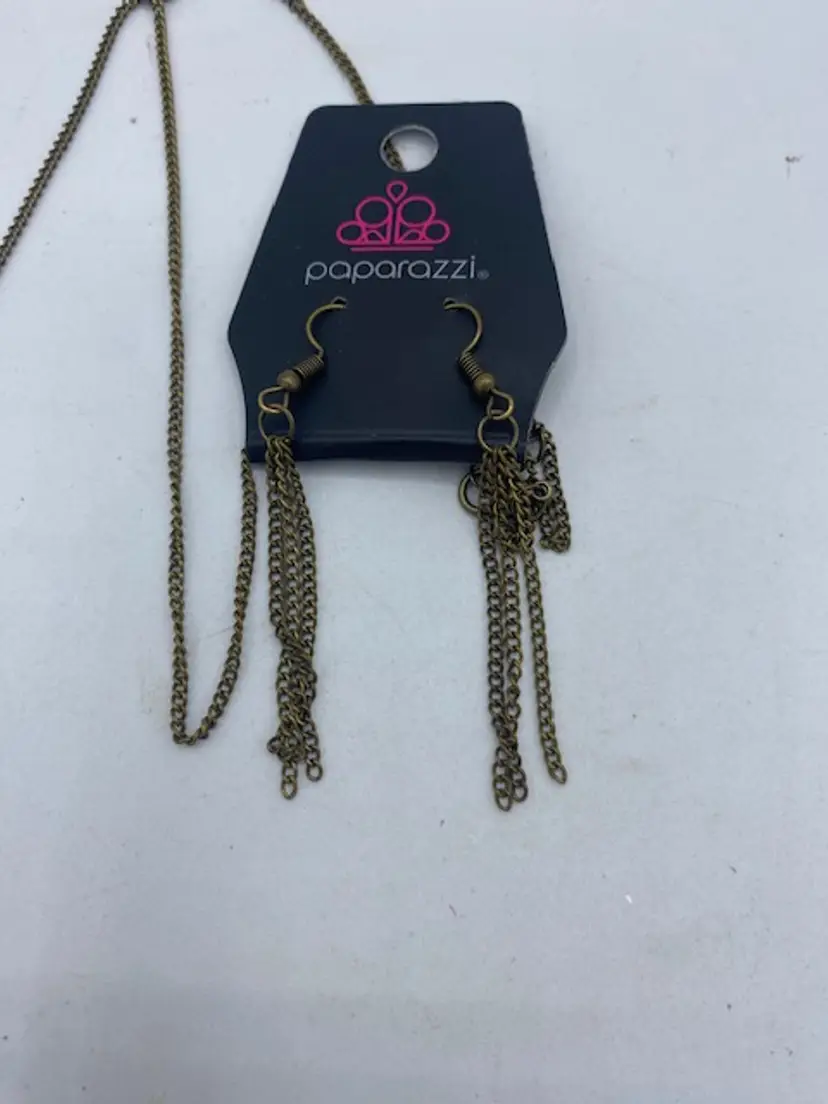 The Paparazzi Ready Set GEO Brass Necklace with matching earrings is a stylish jewelry set featuring a brown main stone color and brass metal. The set includes earrings and a necklace, both in a similar design. This fashion jewelry set is perfect for adding a trendy touch to any outfit. Made by the brand Paparazzi and manufactured in China, this jewelry set is not antique or vintage, and is not personalized or signed. Perfect for those looking to add a pop of color and style to their look.
